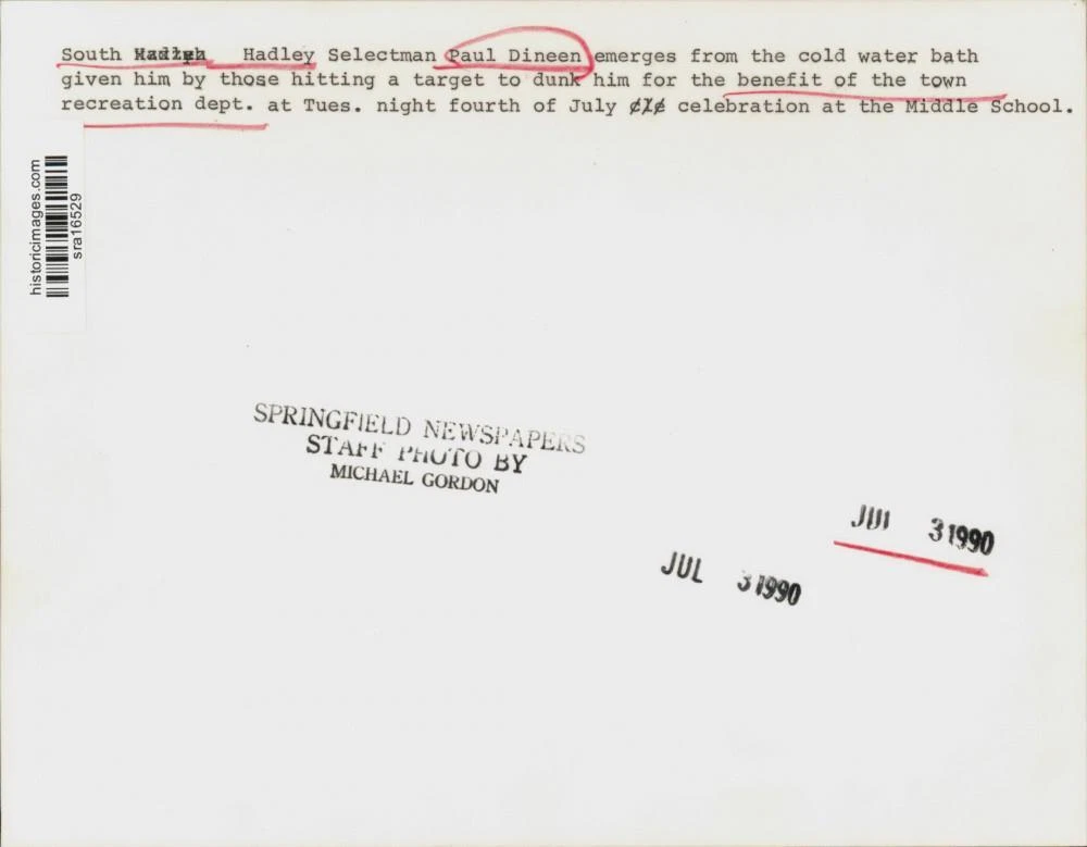 ebay template Note: Please study the images carefully to determine the condition of this vintage photograph, as it may not be in perfect condition. It may contain wrinkles, cracks, and possibly even tears due to its age and how it was handled before it got to us. A scanner may interpret colors and contrast differently than human eyes will, so it is possible that the actual photograph may be slightly darker or lighter in person. This vintage photograph is offered for sale as a collectible item and conveys no transfer of copyright. 1990 Press Photo Paul Dineen emerges after cold water dunking in South Hadley This is an original press photo. South Hadley Selectman Paul Dineen emerges from the cold water bath given him by those hitting a target to dunk him for the benefit of the town recreation department at Tuesday night Fourth of July celebration at the middle school.Photo measures 9 x 7inches. Photo is dated 07-03-1990. PHOTO FRONT PHOTO BACK Historic Images Part Number: sra16529 FAQs Q: Can I just download a digital version instead? A: No, we sell only vintage originals and do not make or distribute any copies, including digital ones. Q: Do you combine shipping and invoices? A: Multiple photos won on the same seller ID combine automatically through the eBay checkout process. If you encounter problems with this, send us a message via eBay messaging and we will send you an invoice. Due to eBay limitations, we cannot combine items won on our different seller IDs for a single shipping charge. Q: How quickly do you ship the items once paid? A: We ship within one business day after your payment clears. If you do not receive an "order shipped" email from us by the close of the second business day from submitting payment, please e-mail us via eBay messaging. Q: How do you make sure my photograph arrives safely? A: We package each order between two cross-corrugated pieces of cardboard to ensure that the package is as difficult to bend as possible. We then wrap each order in a plastic sheet to help protect against moisture. We want you to rest assured that we take every precaution to ensure that the photograph you receive will be in the same condition in your care as it was in ours. Q: Will the "Historic Images" watermark be on my photo when I receive it? A: No. This is a digital watermark we use to protect our images. It is not printed on the photo. Q: What are your office hours? A: eBay for us is a business, and a very fun one to be in! We are open M-F 9 to 5 (CST). Therefore, we do not return e-mails and phone calls over the weekend. We observe the following holidays: New Years Day, Memorial Day, Fourth of July, Labor Day, Thanksgiving and the day after Thanksgiving, Christmas Eve and Christmas Day. Q: Where did all these vintage photos come from? A: These original vintage photographs are from various news service and newspaper photo archives from locations around the country including: Boston, Detroit, Tampa, Chicago, Denver, Seattle, New Orleans, Milwaukee, Portland, Spokane, and more. We do not copy or reproduce any photographs -- every item is a unique vintage piece that was housed in a news archive. Q: Can I use this photograph in my book/blog/website? A: The short answer is no. There is no transfer of copyright for republication or reproduction with these photographs when you purchase them, and only photographs taken before 1923 are currently automatically in the public domain. Permission from the copyright holder, which usually can be identified from the back of each photo, must be sought to republish or reproduce the image for any purpose. Q: Do you relist items (in case I miss an auction ending)? A: Auction items that receive no bids are relisted in our store (historicimages-store on eBay) as a fixed-price item and at a higher price than the starting auction price. Q: Do you leave feedback? A: Yes, we always leave feedback for buyers. Our software monitors when our buyers leave us feedback, then notifies us that we can leave feedback for the buyer. Rest assured, if you leave feedback, we will do the same! Check out our family of eBay IDs: historicimages01 Sports Photos historicimages02 Entertainment Photos historicimages03 Americana Photos historicimages04 International & War Photos historicimages05 Transportation Photos historicimages06 Photos of All Subjects historicimages07 Entertainment Photos historicimages08 Newsworthy Photos historicimages09 Entertainment Photos historicimages10 Sports Photos historicimages-store Our largest fixed-price selection historicimages-gallery Hand-picked photos Saturday night auctions About Us Historic Images was formed in September 2009, with a handful of scanners working out of a basement to digitize newspaper photo archives. We have since moved out of the basement, and we can now archive thousands of photos per day. Our company has worked with magazines and newspapers from Detroit, Boston, Denver, Seattle, Tampa, Chicago, and New Orleans, just to name a few. We are constantly adding to our inventory, and have assembled an archive of millions of photos to date. As our company evolved, we began our eBay business, which brings thousands of fresh auctions per week to the world's largest online auction marketplace. Our custom software systems and team of great employees allow us to efficiently scan and sell large photo archives online. At the very core of our company's DNA is a strong commitment to customer satisfaction and strict integrity for our product. Our promise to you is that we will do everything in our power to provide you a great buying experience. Copyright 2009 - Present, Historic Images, Inc. Sell Smarter with Kyozou. Inventory and Ecommerce Management