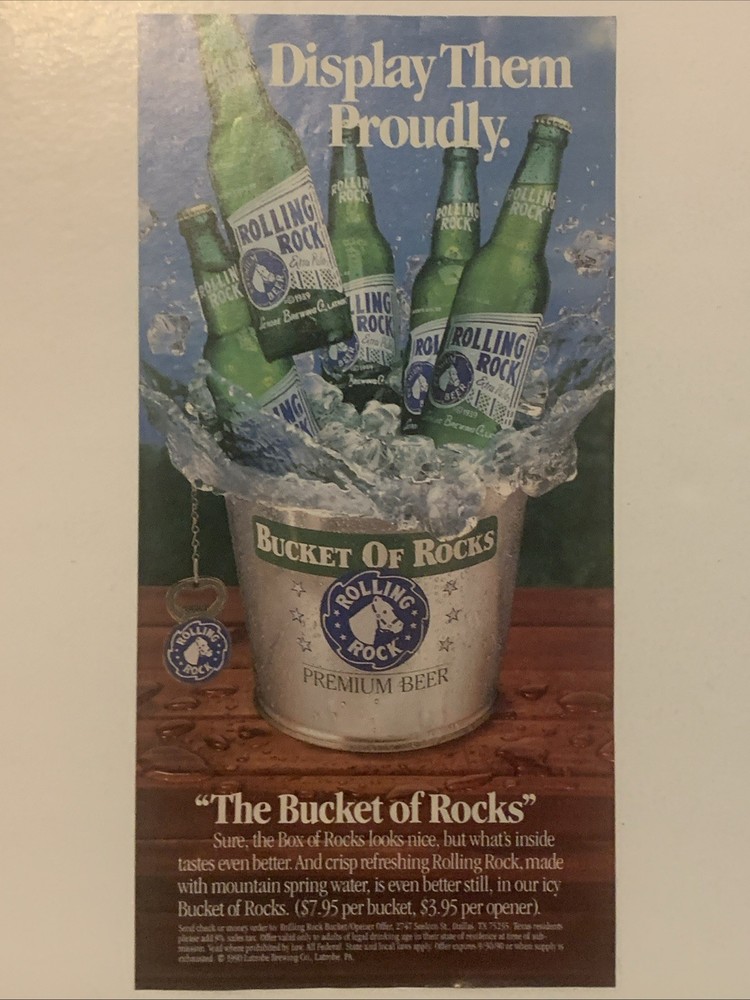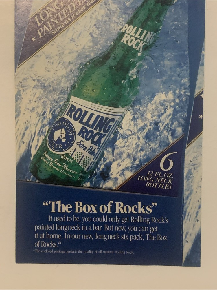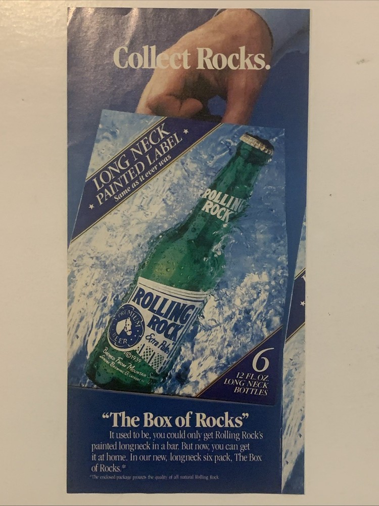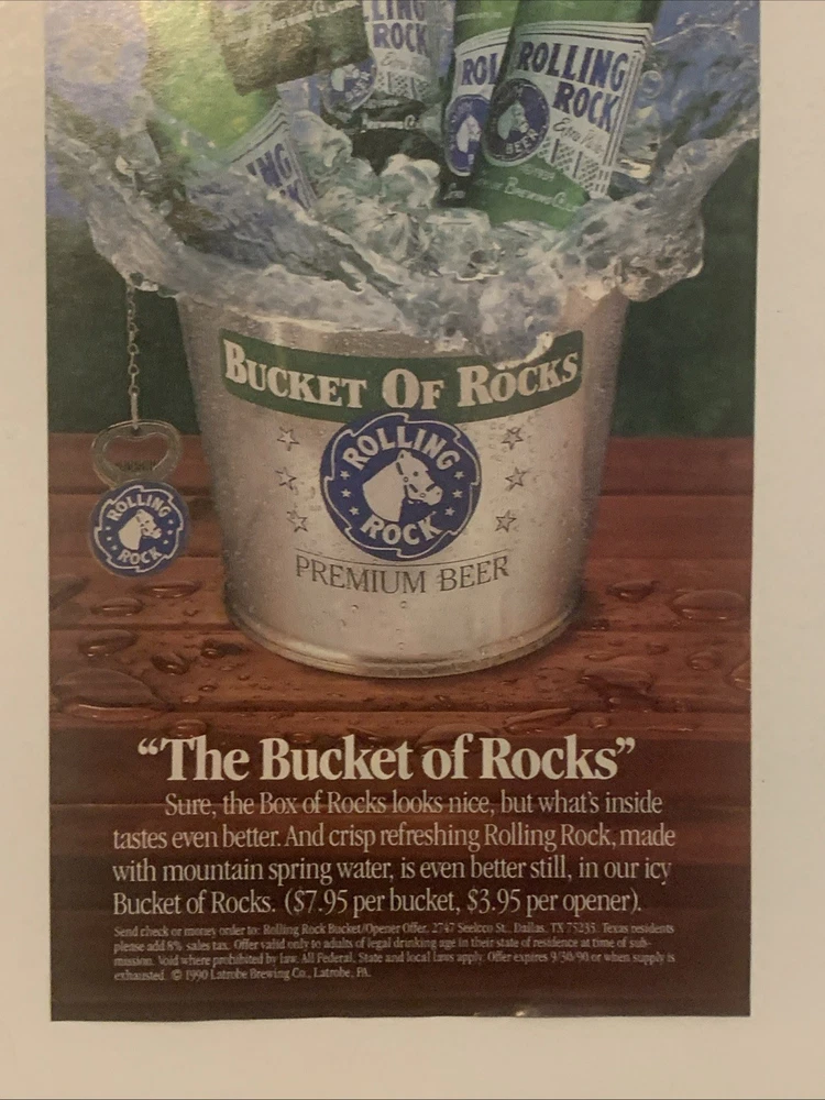 The product is a vintage 1990 Rolling Rock magazine print ad featuring the brand's beer. The ad is a two-piece set with each piece measuring approximately 5"x11" and is perfect for collectors looking to display proudly. The multi-color ad was created in the United States and comes with a Rolling Rock box and bucket, making it a unique and nostalgic addition to any collection of memorabilia from the 90s era. Ideal for fans of Rolling Rock beer and vintage advertising, this collectible item offers a glimpse into the brand's history and marketing strategies of the past.