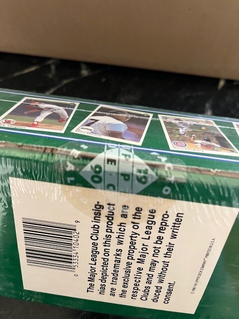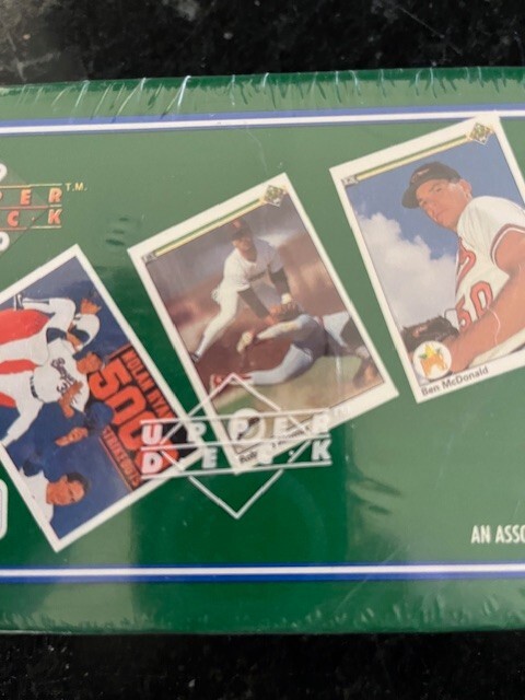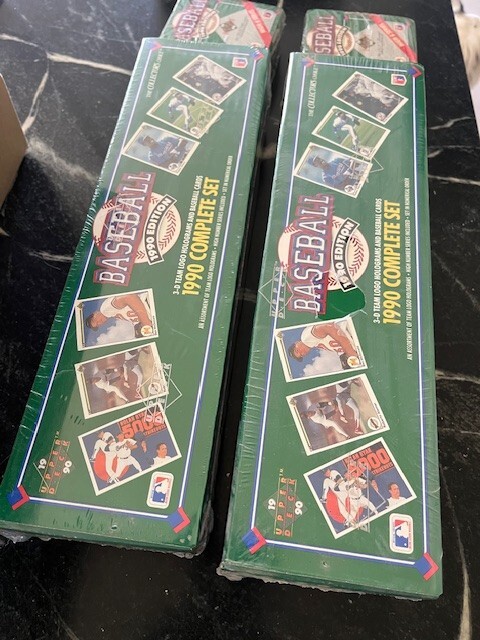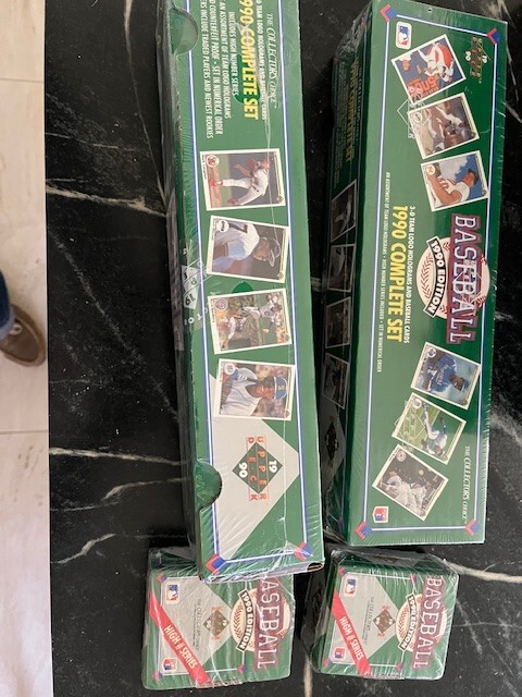 The product is for (lot of 2) 1990 Upper Deck MLB Complete Factory Sealed Box Set featuring Sammy Sosa's rookie card, along with (lot of 2) bonus high series set. This set includes cards of Major League Baseball players such as Ken Griffey Jr and Nolan Ryan, from teams like the New York Yankees, Atlanta Braves, and Seattle Mariners. Made of card stock, these standard-sized cards are in English and manufactured by Upper Deck in the United States. The set includes features like holograms, base set cards, and rookie cards, making it a desirable item for baseball card collectors. The 1990 UD Set and the High Series set are factory sealed and wrapped in plastic by Upper Deck.