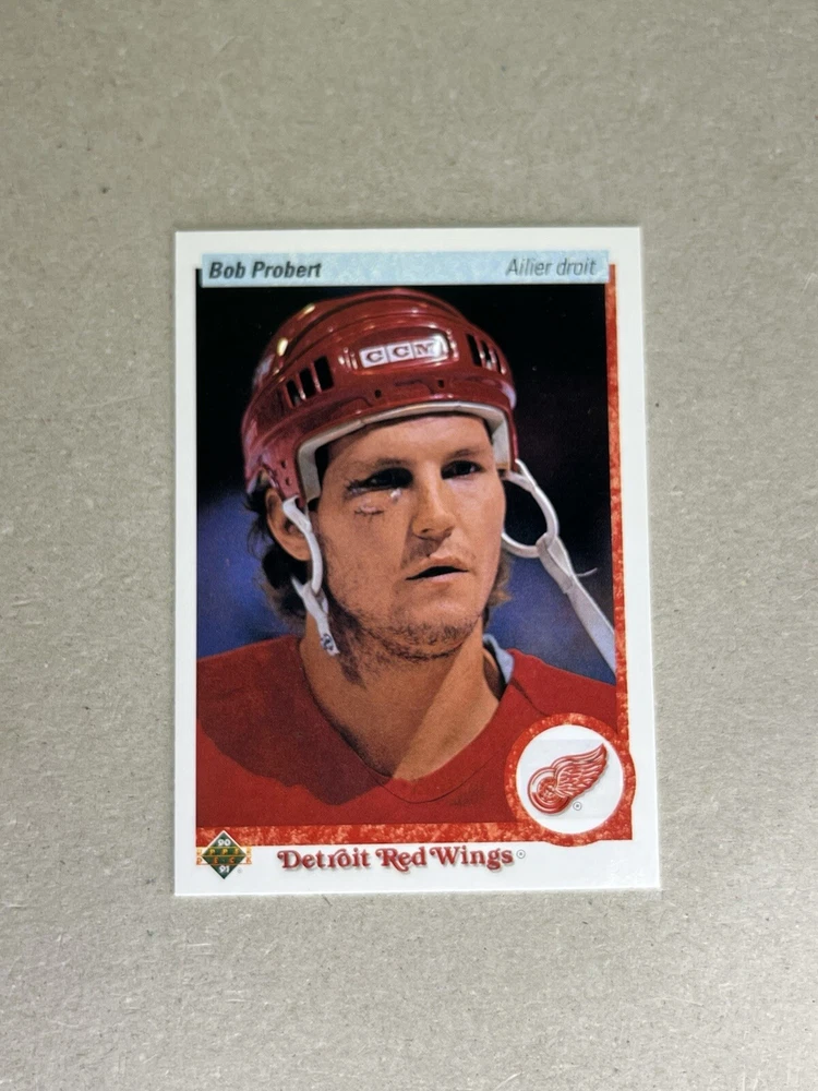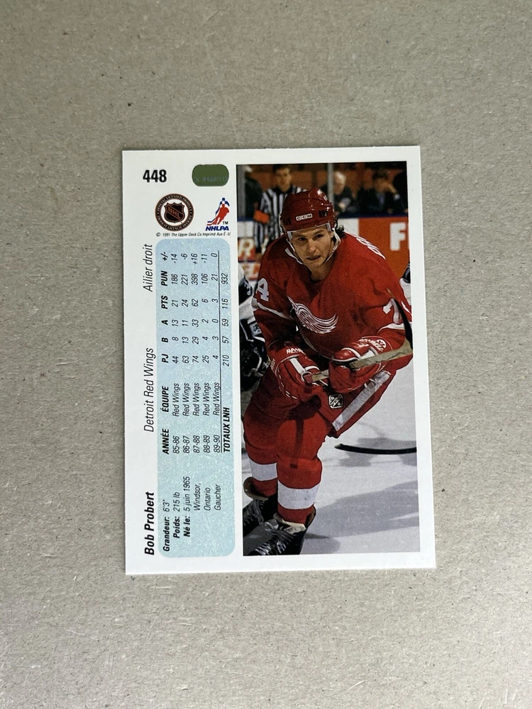 This 1990-91 Upper Deck #448 Bob Probert Detroit Red Wings trading card is a must-have for any ice hockey fan. Featuring a base set design, this card is made of 20 Pt. card stock material and has a standard size. It is an original, not a licensed reprint, and was manufactured by Upper Deck in the United States. The card has no autograph, nor is it signed by Bob Probert. It is a single card from the 1990-91 season of the National Hockey League (NHL) and is part of the 1990-91 Upper Deck set. This trading card is in English language and has no parallel or variety. It is a great addition to any sports trading card collection.