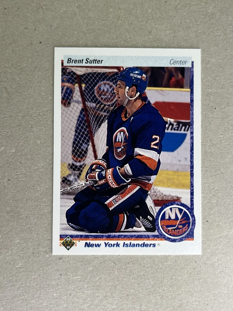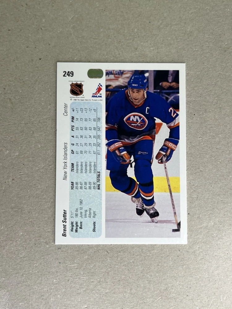 This sports trading card features Brent Sutter, a former player for the New York Islanders, and is an original Upper Deck production from the 1990 season. The card measures 3½" x 2½" and has not been autographed. It is a vintage item and part of a collection of hockey-related memorabilia. The card number is 249 and it is a single card from the Upper Deck set. Perfect for collectors or fans of Brent Sutter or the New York Islanders.
