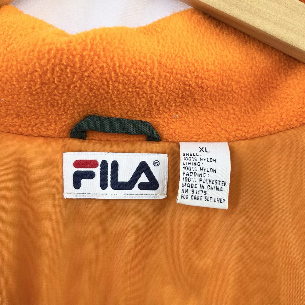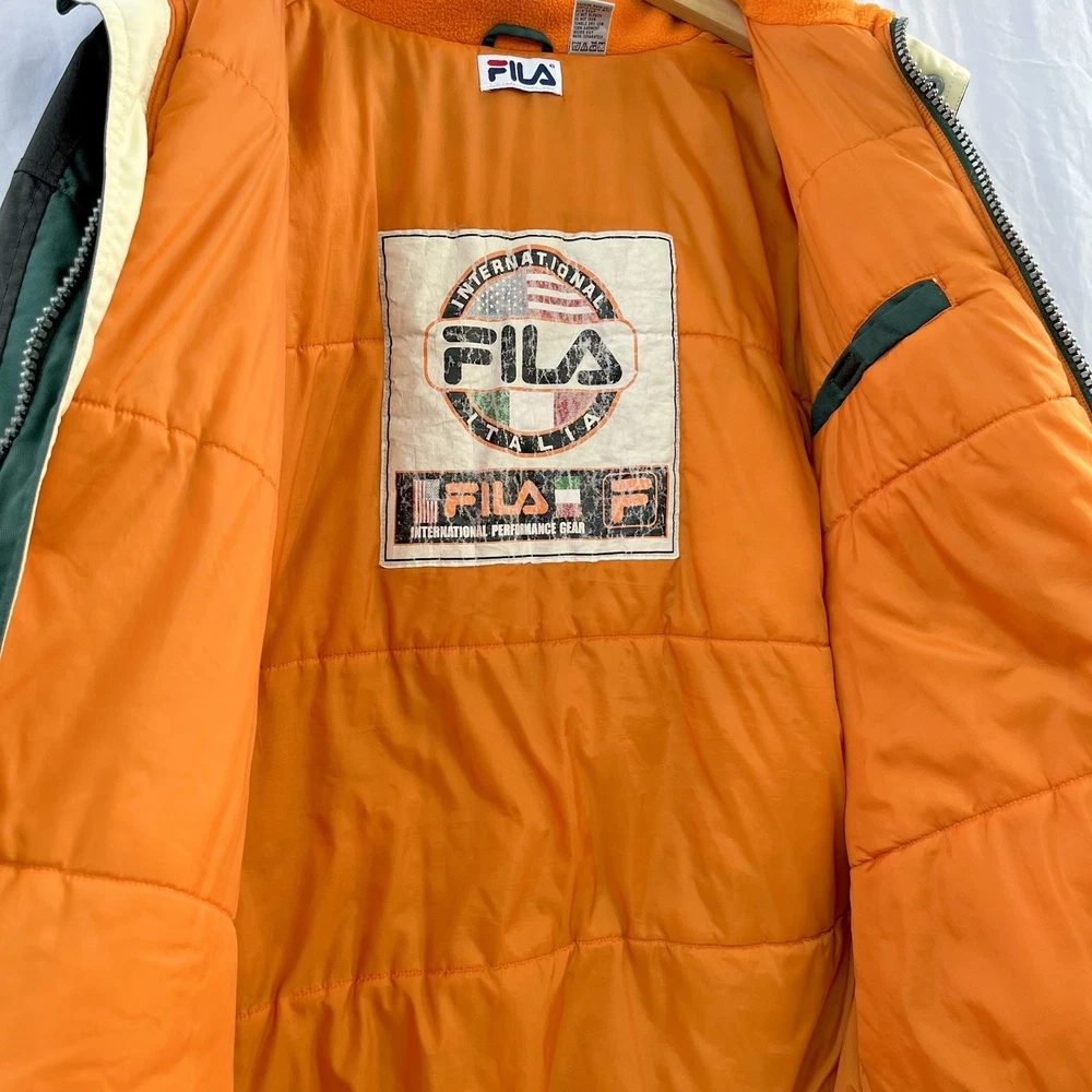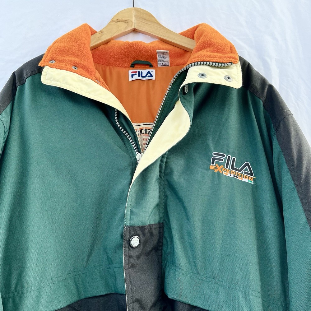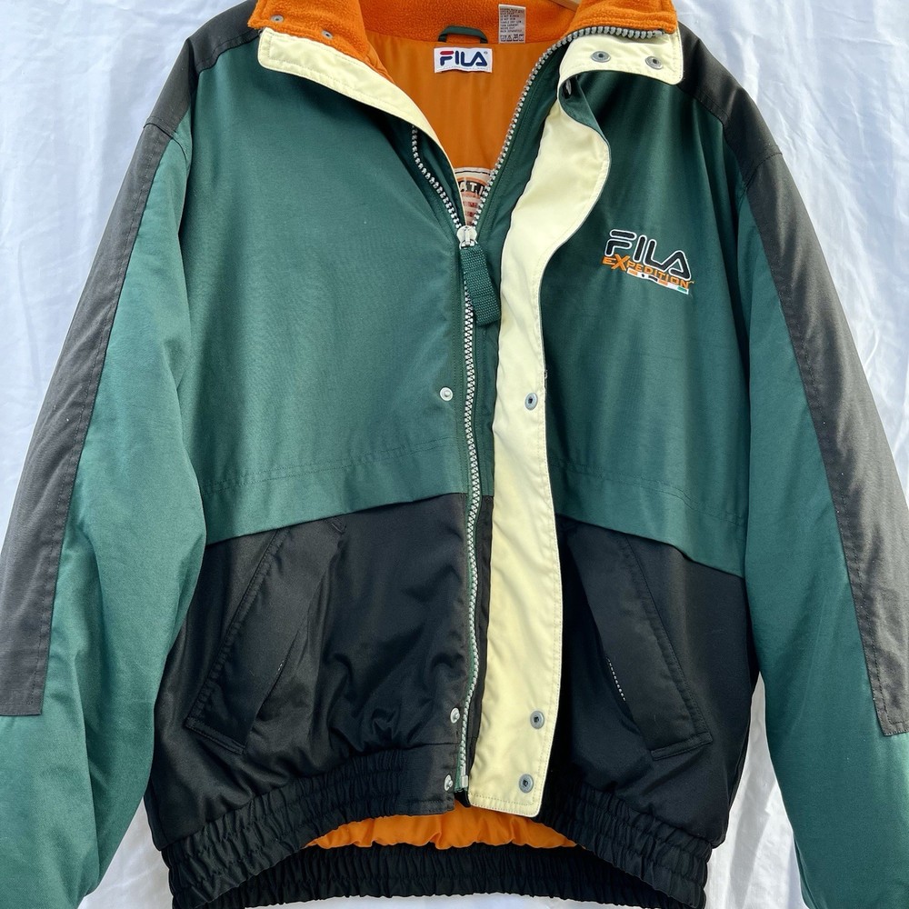 The perfect addition to your wardrobe: • Vintage 1990s FILA international performance gear jacket size XL. • Buttons and zips down the front. Black, green, and orange colors. Puffer. Slight bomber jacket style. • Used, cleaned, and in good condition. • Shell = 100% nylon. Lining = 100% nylon. Padding = 100% polyester. • Measurements: Chest = 27 inches across. Length = 32 inches long. • Listed across numerous platforms so once it’s gone, it’s gone!