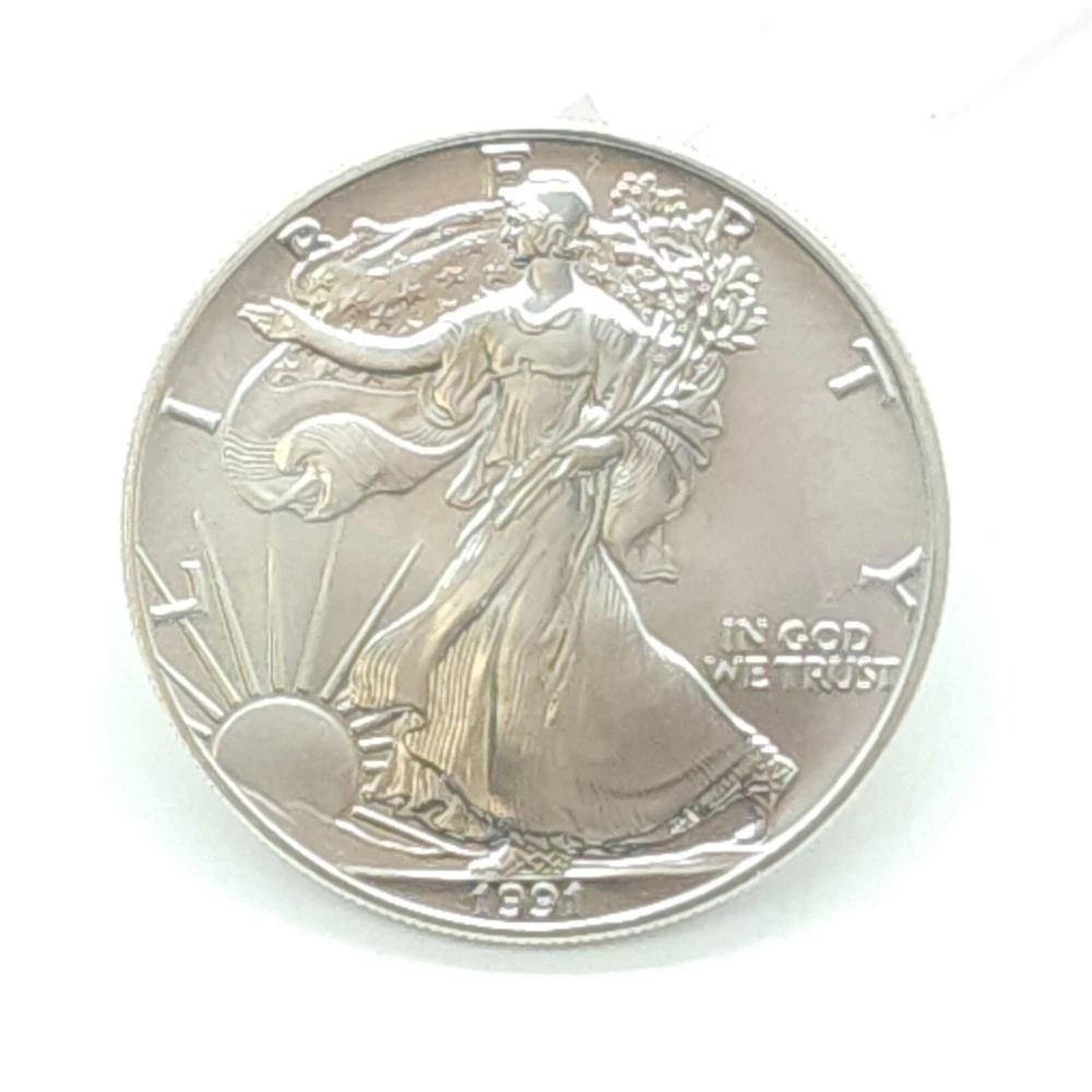 Coin: American Eagle Fineness: 0.999 Grade: Ungraded Year: 1991 Brand/Mint: U.S. Mint Country/Region of Manufacture: United States Seller Notes: “Excellent Condition” Certification: Uncertified Precious Metal Content per Unit: 1 oz Composition: Silver