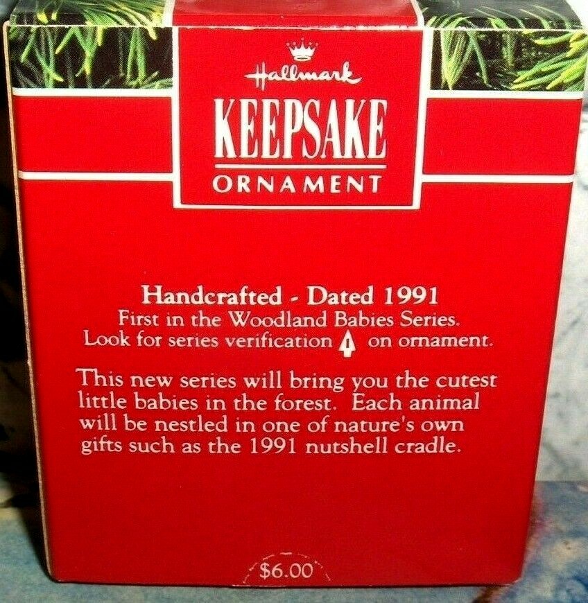 We Have For Sale A USED->Approx 1 Inch-> Miniature Hallmark Tree Ornament... ( 1 ) Hallmark Ornament / This Series Will Bring You The Cutest Little Babies In The Forest,Like This Baby Chipmunk Nestled In One Of Natures Own Gifts The Nutshell Cradle... ( 2 ) Type / Woodland Babies Ornament.... ( 3 ) Collector's / This Is The First In The Woodland Babies Series,Make This Little Cutie Part Of Your Mini Christmas Tree Decorations... ( 4 ) Year / 1991 ( 5 ) Lighted / None ( 6 ) Box Condition / Box Is Very Nice-Look At Pictures-Check Out Our Other Hallmarks In Our EBAY STORE... ( 7 ) Ornament Condition / MINT IN BOX... ( 8 ) Org Price Tag Intact / Yes ( 9 ) Org Price Tag / 6.00 SHIPPING WITH TRACKING IS FREE TO THE USA... -->>ALL OUR ORNAMENTS SHIP TO YOU IN BRAND NEW BOXES-NOT ENVELOPES OR SOMEONE ELSE'S SECOND HANDED USED BOXES-STAY SAFE....