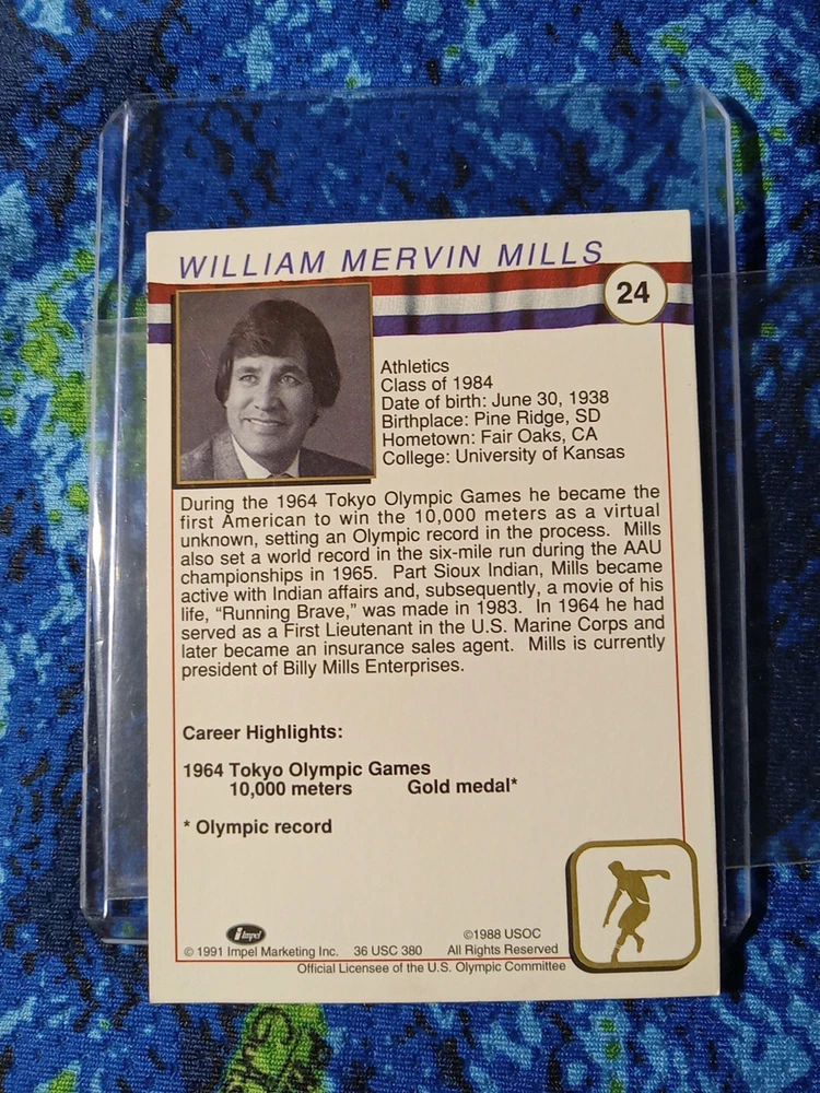 The product is a 1991 Impel U.S. Olympicards Hall of Fame trading card featuring track & field athlete Billy Mills. The card is part of the base set, numbered 24, and showcases Mills who represented the United States in the Olympics. It is a sports trading card manufactured by Impel Marketing, Inc. for the IOC in 1991.