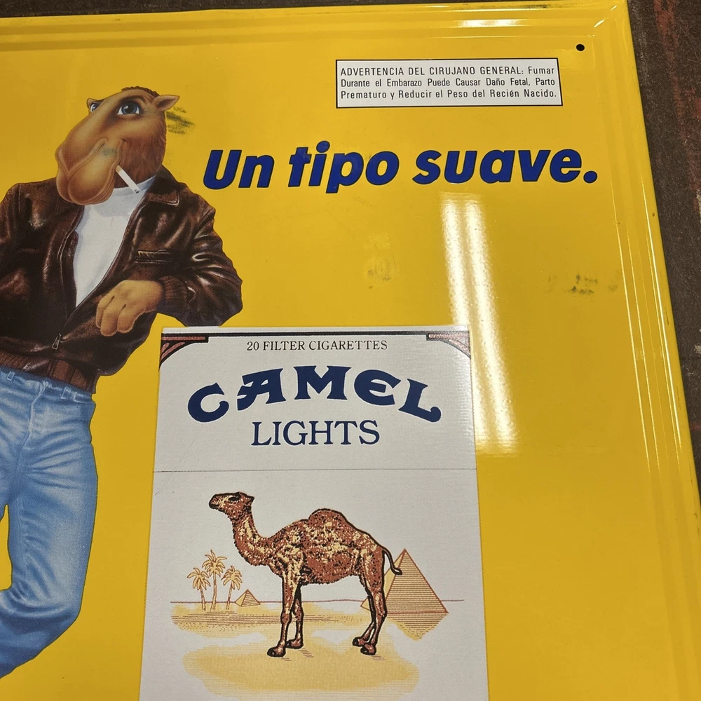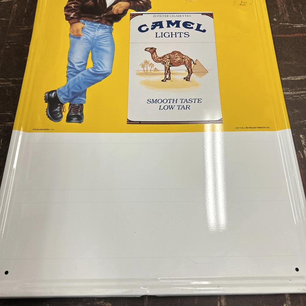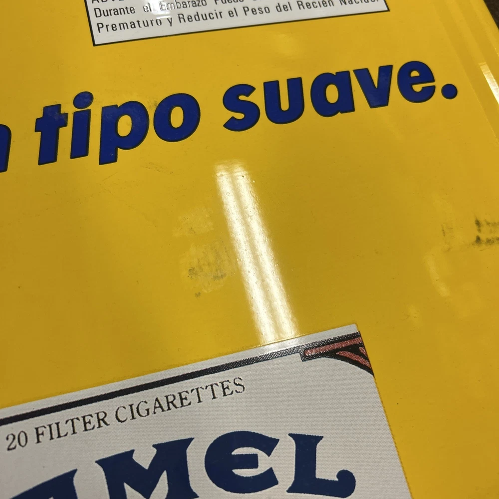 Nice sign, just has a few minor bends/dent and light black marks on front (I did not try to remove). Lays flat on a wall. Mounting tape has been used. See pics!