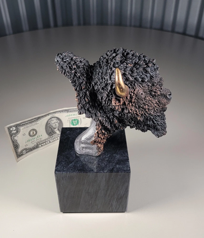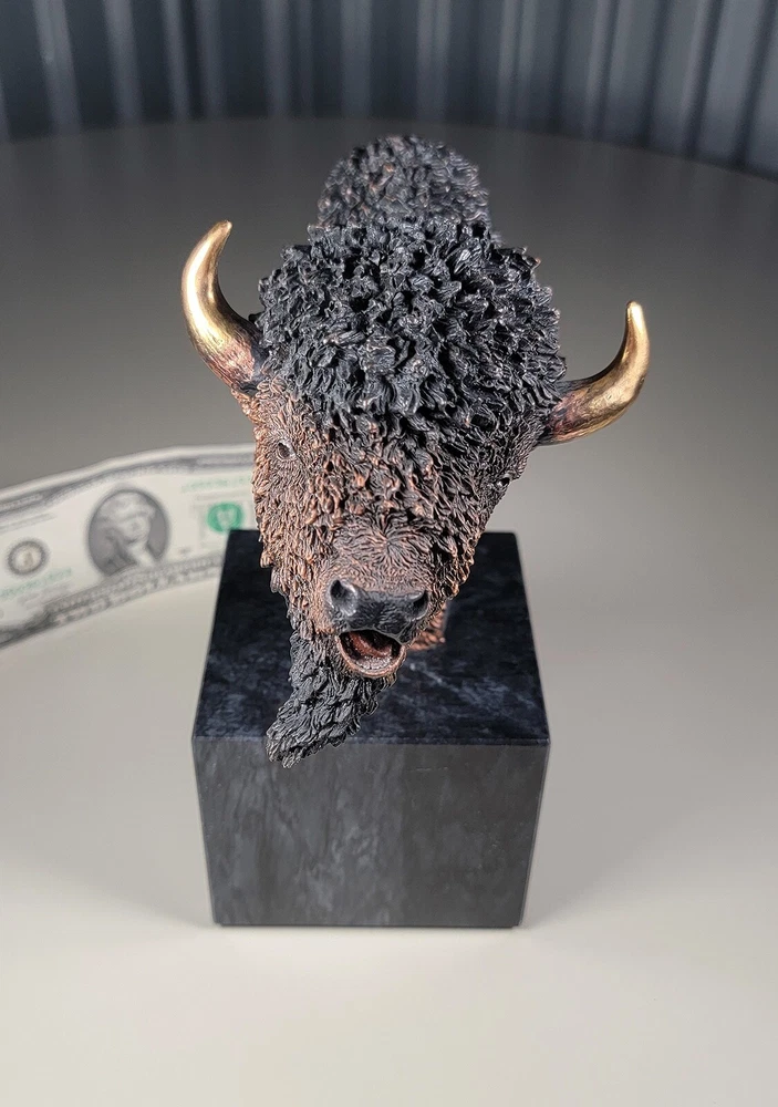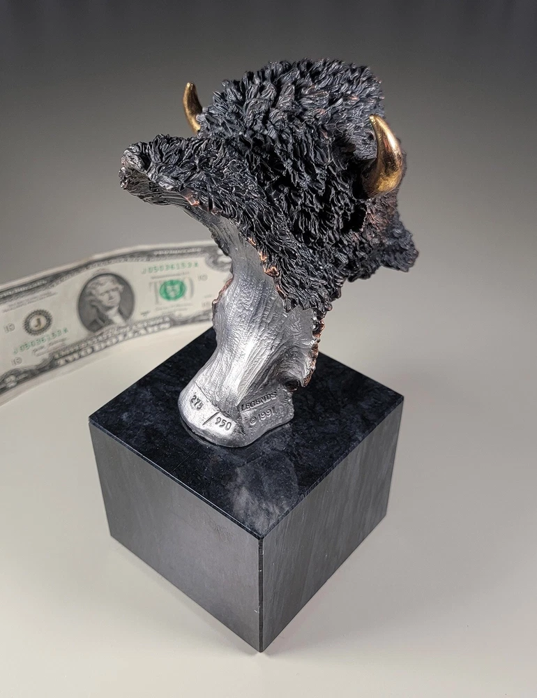 1991 KITTY CANTRELL Legends Wildlife Sculpture-BUFFALO-Plains Monarch DIMENSIONS: Overall: 8" tall x 5" deep x 3 3/4" wide. Weight: 8 lbs. DESCRIPTION: Vintage limited edition wildlife sculpture by KITTY CANTRELL. "Plains Monarch". Buffalo bust. "Legends" series. #275 from and edition of 950. Mixed media cast metal on a marble base with felted bottom. All original. Maker's marks: "K. Cantrell - Plains Monarch - Legends - ©1991 - 275/950 - U.S.A." in casting; gold foil label on bottom with an additional number stamp (illegible). No literature or original packaging is included. I recently acquired this sculpture from the original owner. CONDITION: Some very light handling wear: a few scattered miniscule edge rubs to the marble base. See photos. Nothing significant / conspicuous. Presumably the sculpture is secured with a nut on threaded rod underneath the felt. It isn't at all conspicuous when sitting, but when you pick the sculpture up it feels as if the nut isn't absolutely tight (but not so loose that the sculpture turns on its base). Otherwise excellent original condition with no damage and no significant wear. No restorations / repairs / touch ups. No chips, flakes, nicks, breaks, cracks, losses. No scratches, scuffs, bruises. No significant rubs. Very clean as found. No stains or discolorations. No oxidation, corrosion, etc. From a smoke free home. Condition is consistent with infrequent, careful handling.Excellent original condition.