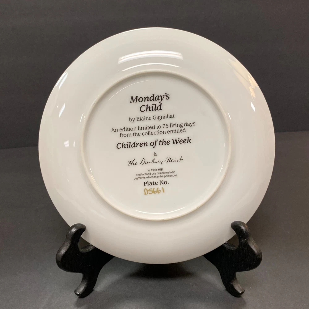 1991 "Monday's Child" Vintage Limited Edition Plate - Danbury Mint [INCLUDES CERTIFICATE OF AUTHENTICITY] P late #: D5661 Art by Elaine Gignilliat " Children Of The Week " Series NOT TO BE USED FOR FOOD. DECORATION PURPOSES ONLY. [RMP-DC7]