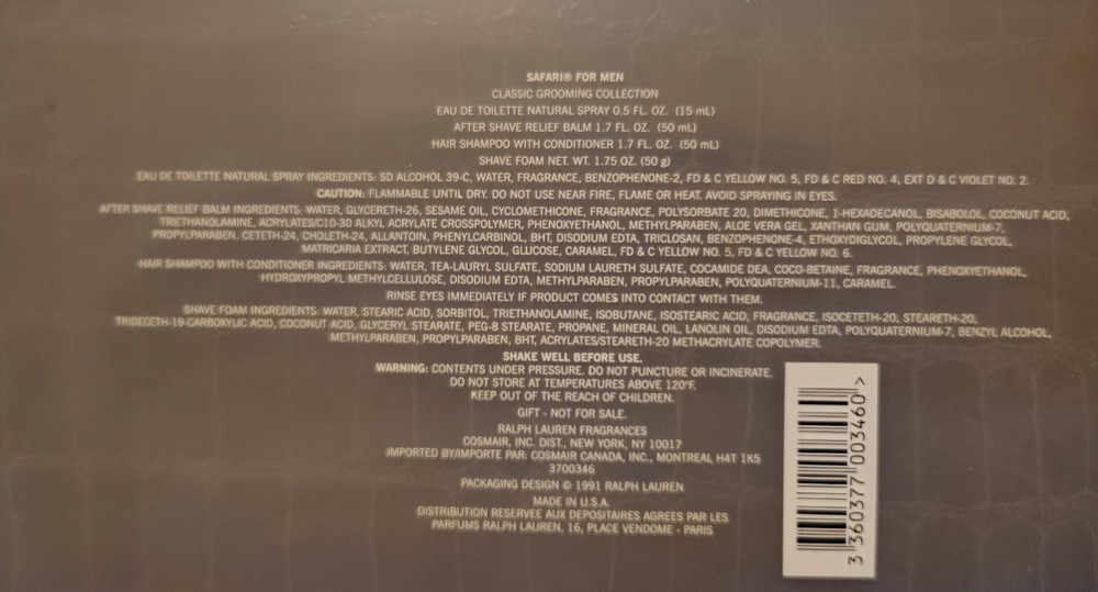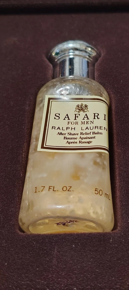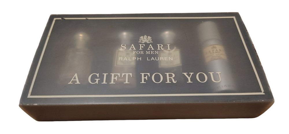 Ralph Lauren Vintage 1991 Safari fragrance gift set featuring the classic grooming collection. • 0.5 fl OZ EAU DE TOILETTE NATURAL SPRAY • 1.7 fl OZ AFTER SHAVE RELIEF BALM • 1.7 fl OZ HAIR SHAMPOO WITH CONDITIONER • 1.75 OZ SHAVE FOAM Please view all pictures for box damage