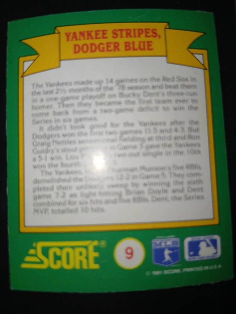 This 1991 Score sports trading card features trivia inserts from the World Series, with card number 9 showcasing the New York Yankees and Los Angeles Dodgers. This collectible item is perfect for baseball enthusiasts and fans of the World Series. It is a part of the 1991 Score set and has a card number of 9. The card is in gradeable shape.