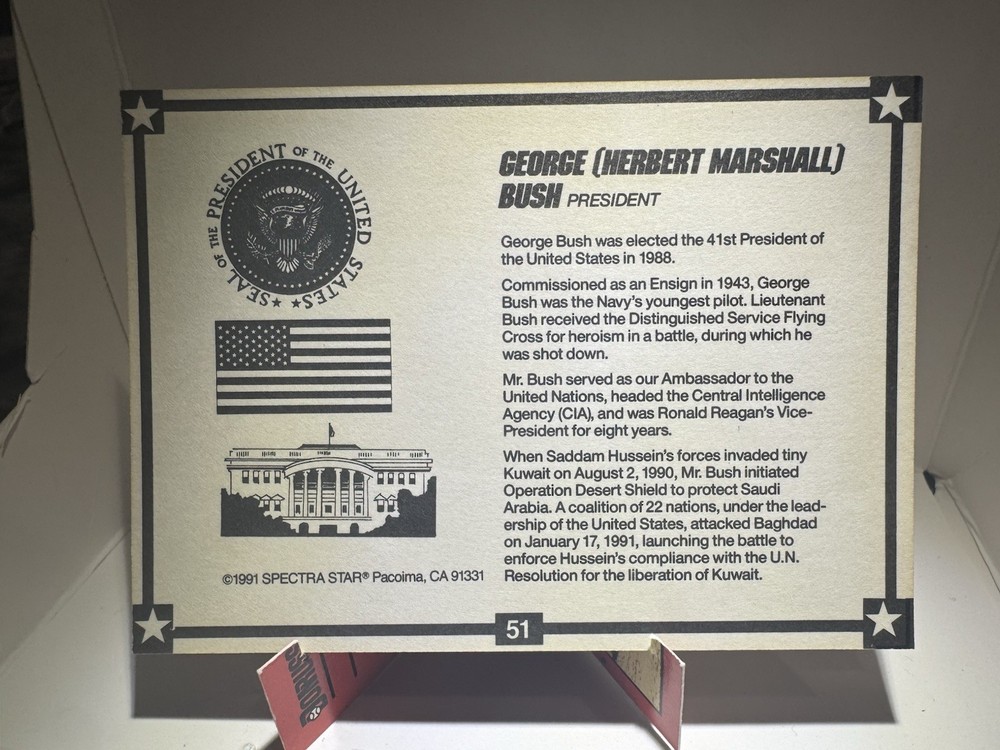 The 1991 Spectra Star Troops Desert Storm President Bush RC #51 trading card is a collectible non-sport trading card featuring a military subject related to the Desert Storm war franchise. Manufactured by Spectra Star in 1991, this card captures a specific moment in military history and is a must-have for collectors interested in war-themed trading cards. With a unique design and limited availability, this card offers a glimpse into the historical significance of the Desert Storm conflict.