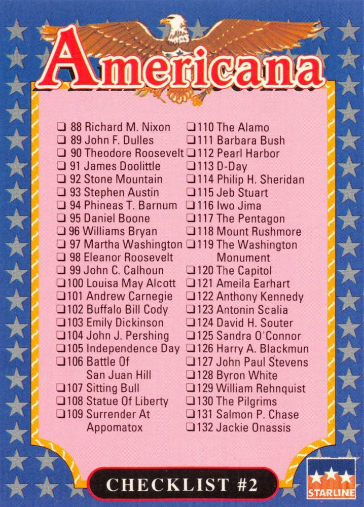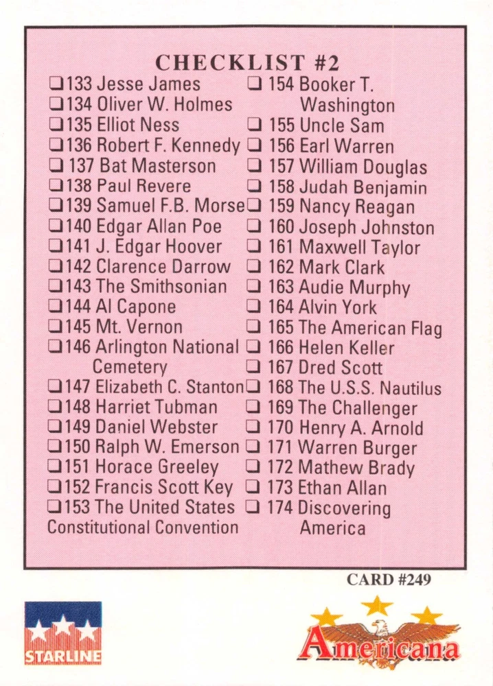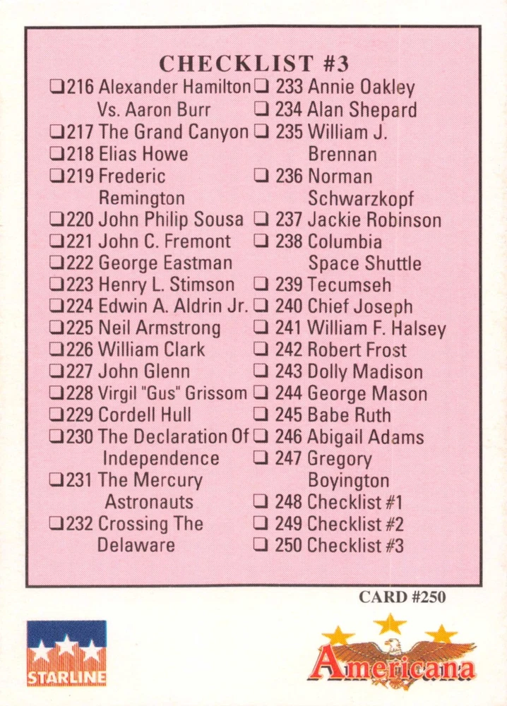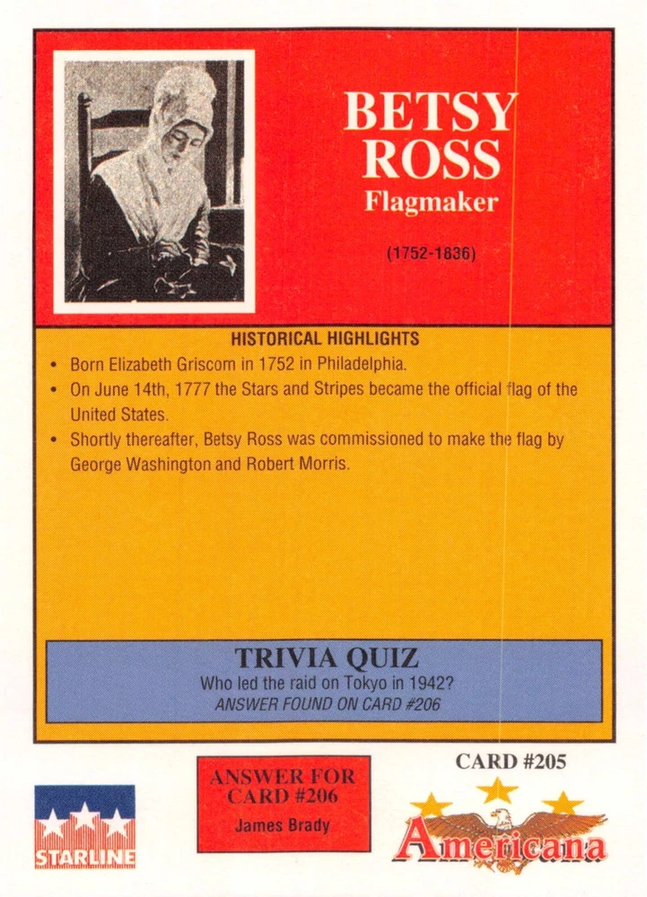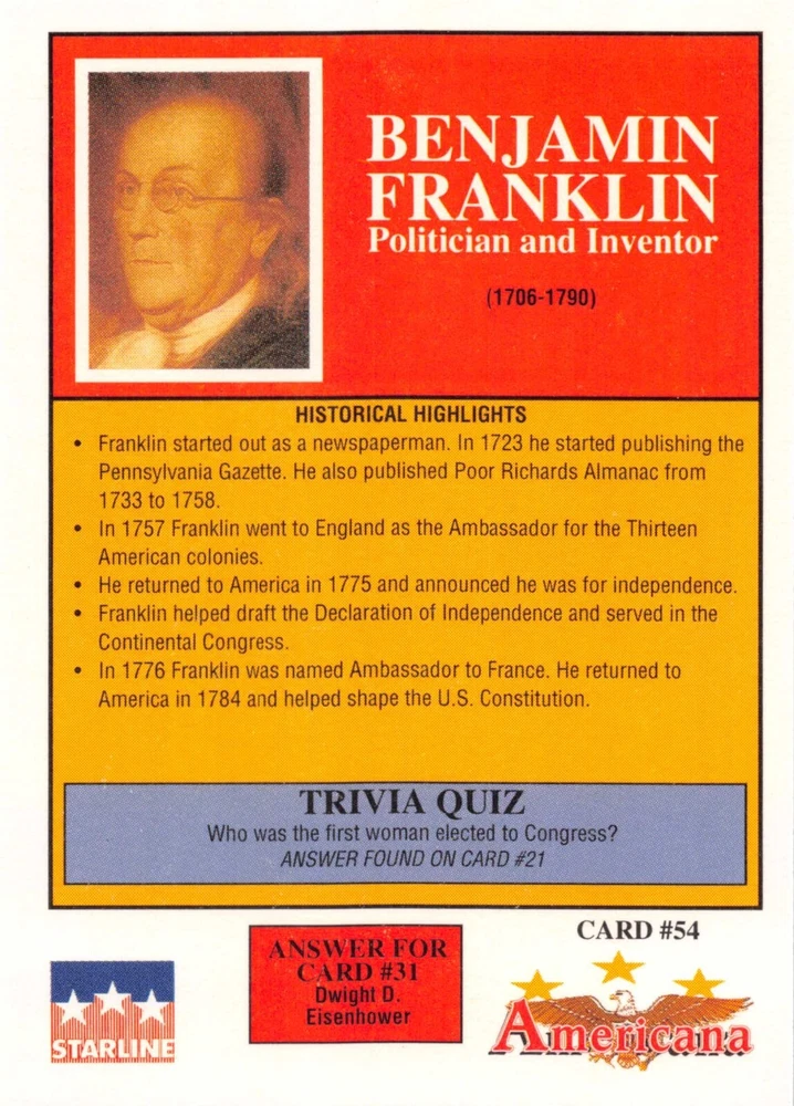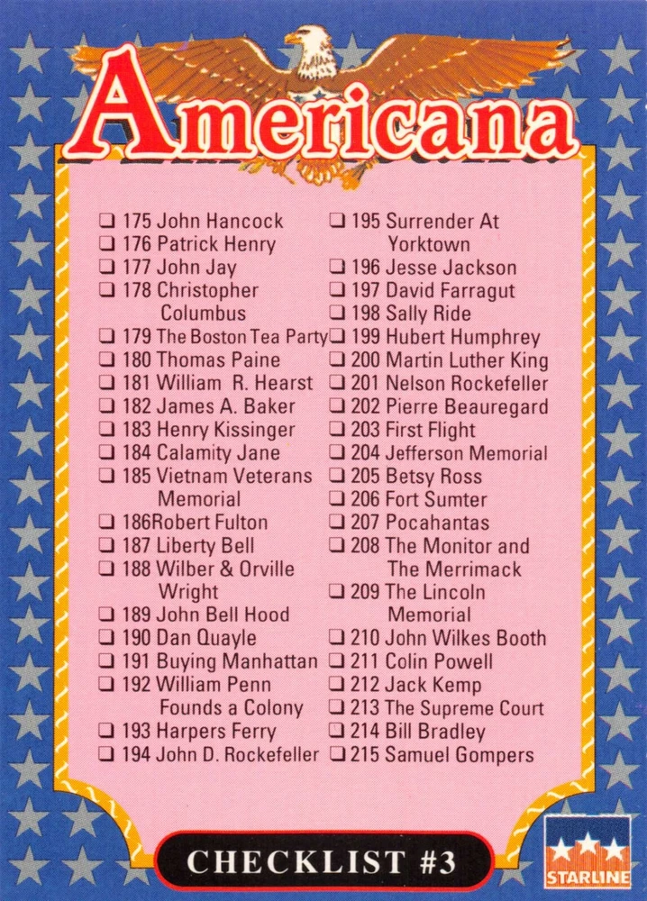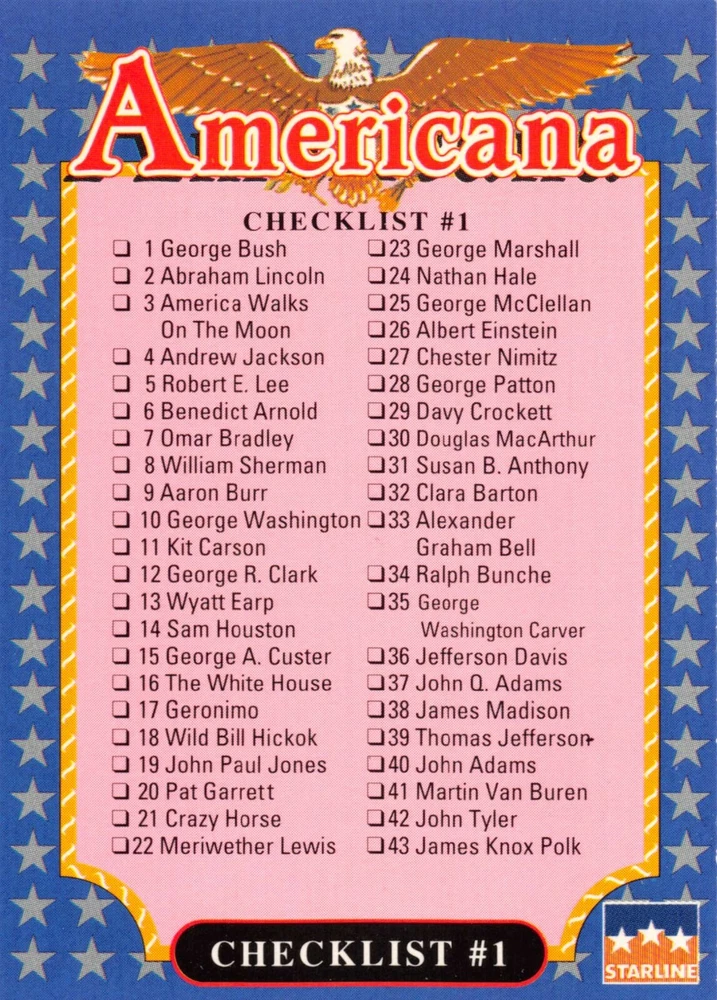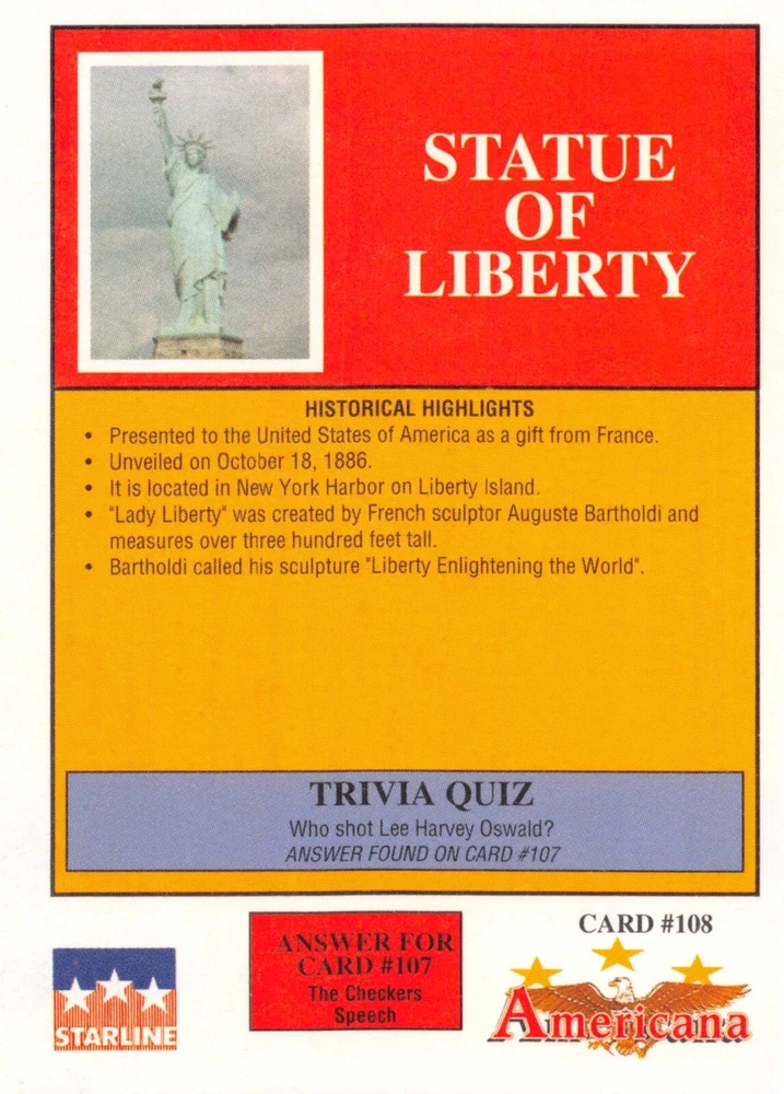 This listing is for your choice of any available 1991 Starline Americana Historic Trading Cards card from the drop-down menu above. Photos show front and backside of each card, be sure to scroll sideways to view front and backside photos! Any questions? Please ask before buying. International "USPS First Class Mail" will not include a tracking number for this item, if you would like a tracking number please choose the "eBay International Standard Shipping" option when you check out. As with all of my "pick-a-card" listings, I will be shipping with "eBay Standard Envelope". The rules of this envelope state that it cannot be too thick, so please expect your order to be packaged as follows: 1 to 6 cards will be slid into a single sleeve, the sleeve will then be slid inside of a semi-rigid Card-Saver. 7 to 12 cards will be slid into a double sleeve, 13 to 18 cards into a triple sleeve, 19 to 24 cards into a quadruple sleeve(up to six cards per sleeve). The double, triple and quadruple sleeve shipping will not have the Card-Saver. If you buy more than 1 card and want it packaged with more than 1 Card-Saver(or 1 sleeve per card), I kindly ask that you contact me before purchasing to be sure that this is possible to have it done with the stated shipping charge, or if additional shipping would be required. If you do not contact me, then you can expect to receive your order packaged as I have explained here. Please do not expect rigid top-loaders to be included, I don't normally keep a lot of them in stock, but if you message me prior to ordering I will be able to see if I have any that can be included with your order - additional shipping may be required. In order to get free combined shipping from this and any of my other "pick-a-card" listings, you must add all of your cards to the cart and check out when you are done shopping. If you do not use the cart you will be overpaying on shipping and I cannot refund you on over-payed shipping. So please use the cart and get your FREE COMBINED SHIPPING!