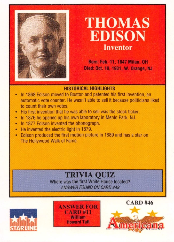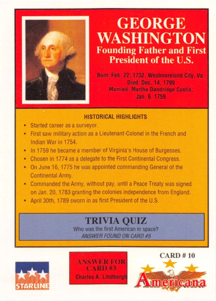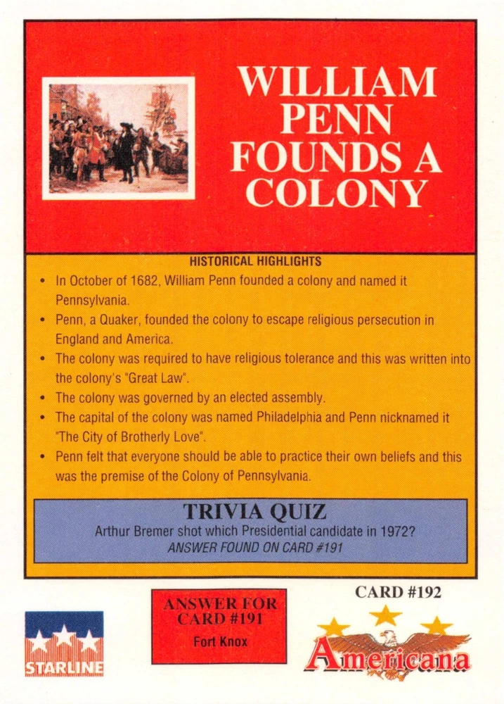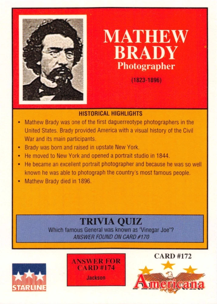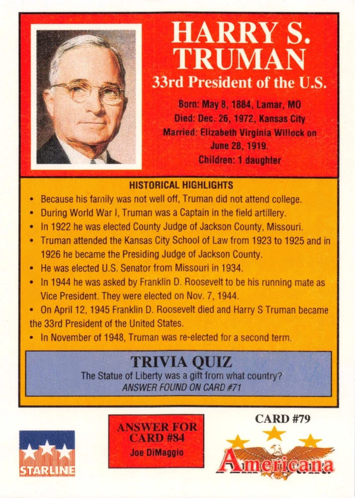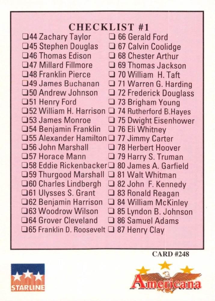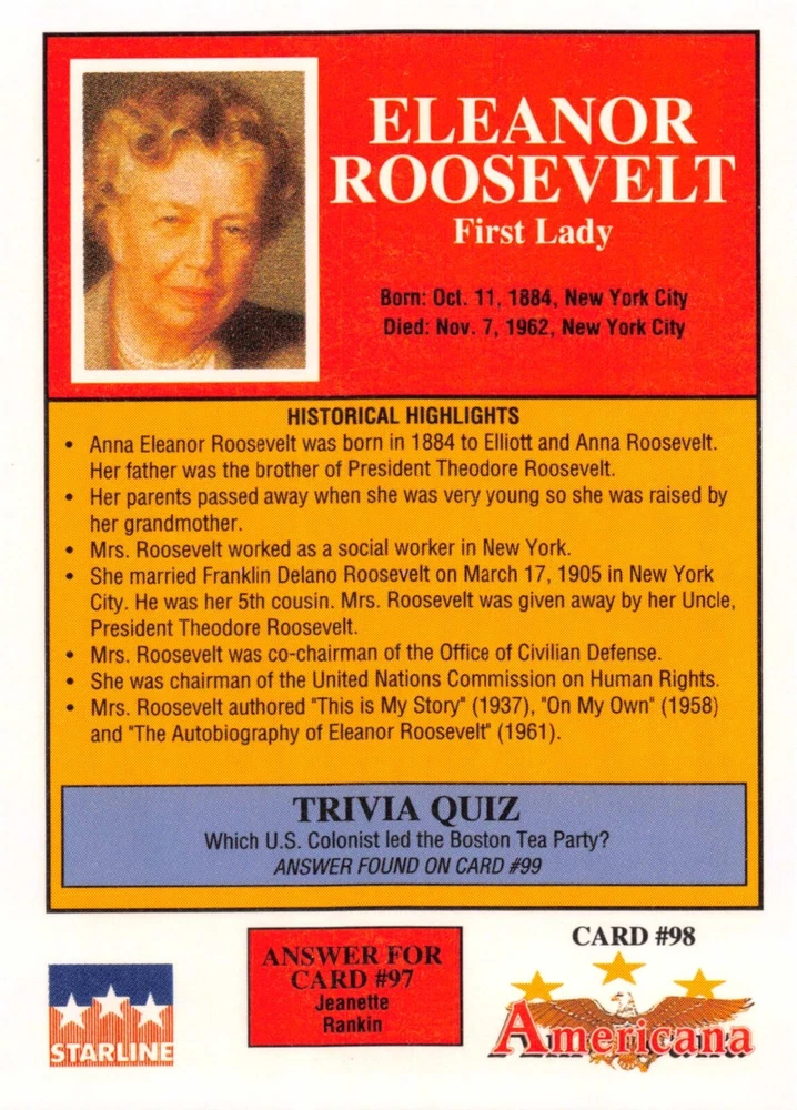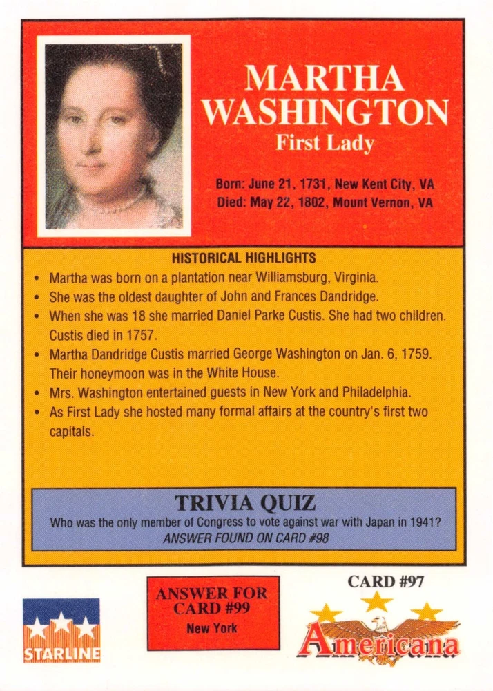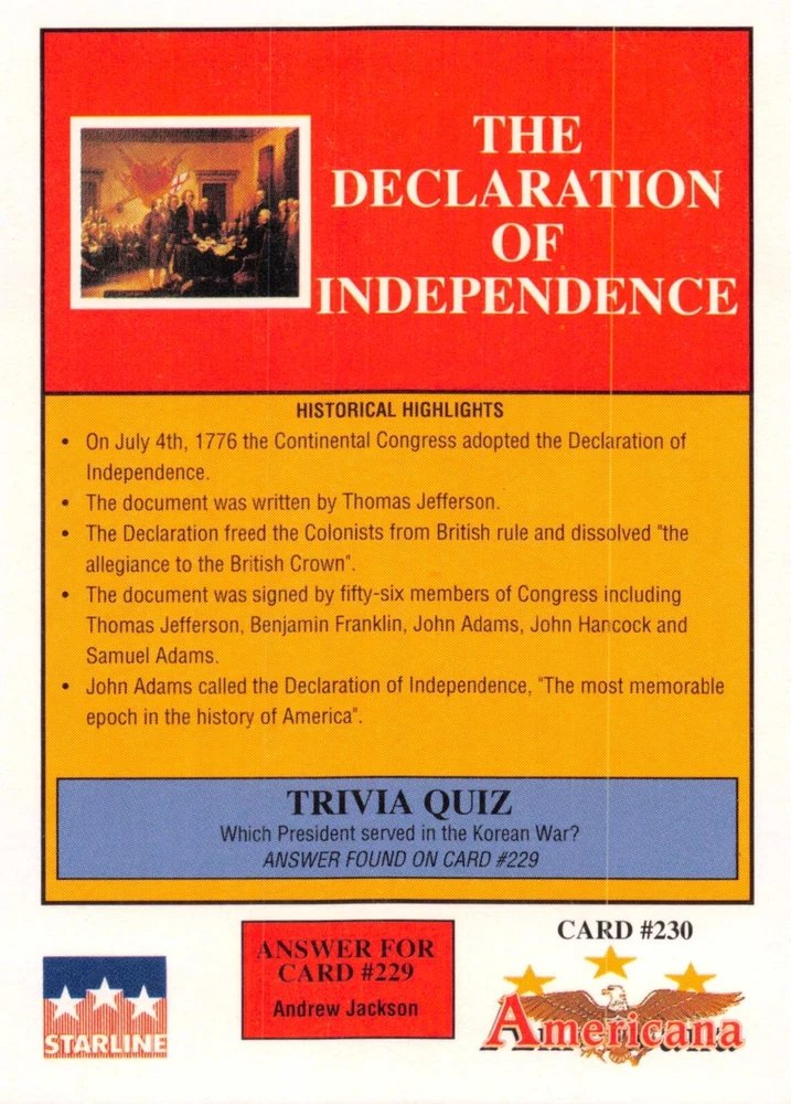 This listing is for your choice of any available 1991 Starline Americana Historic Trading Cards card from the drop-down menu above. Photos show front and backside of each card, be sure to scroll sideways to view front and backside photos! Any questions? Please ask before buying. International "USPS First Class Mail" will not include a tracking number for this item, if you would like a tracking number please choose the "eBay International Standard Shipping" option when you check out. As with all of my "pick-a-card" listings, I will be shipping with "eBay Standard Envelope". The rules of this envelope state that it cannot be too thick, so please expect your order to be packaged as follows: 1 to 6 cards will be slid into a single sleeve, the sleeve will then be slid inside of a semi-rigid Card-Saver. 7 to 12 cards will be slid into a double sleeve, 13 to 18 cards into a triple sleeve, 19 to 24 cards into a quadruple sleeve(up to six cards per sleeve). The double, triple and quadruple sleeve shipping will not have the Card-Saver. If you buy more than 1 card and want it packaged with more than 1 Card-Saver(or 1 sleeve per card), I kindly ask that you contact me before purchasing to be sure that this is possible to have it done with the stated shipping charge, or if additional shipping would be required. If you do not contact me, then you can expect to receive your order packaged as I have explained here. Please do not expect rigid top-loaders to be included, I don't normally keep a lot of them in stock, but if you message me prior to ordering I will be able to see if I have any that can be included with your order - additional shipping may be required. In order to get free combined shipping from this and any of my other "pick-a-card" listings, you must add all of your cards to the cart and check out when you are done shopping. If you do not use the cart you will be overpaying on shipping and I cannot refund you on over-payed shipping. So please use the cart and get your FREE COMBINED SHIPPING!