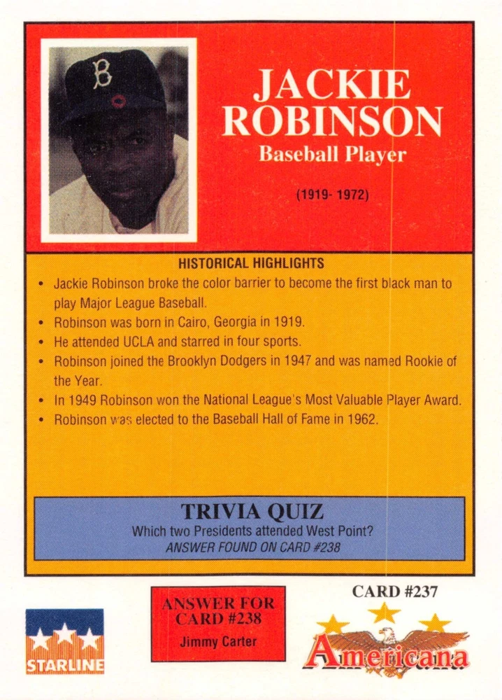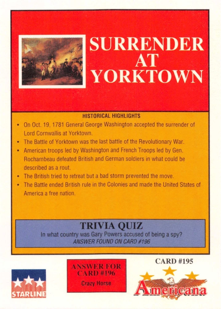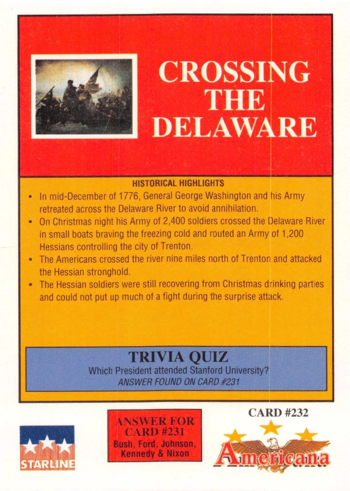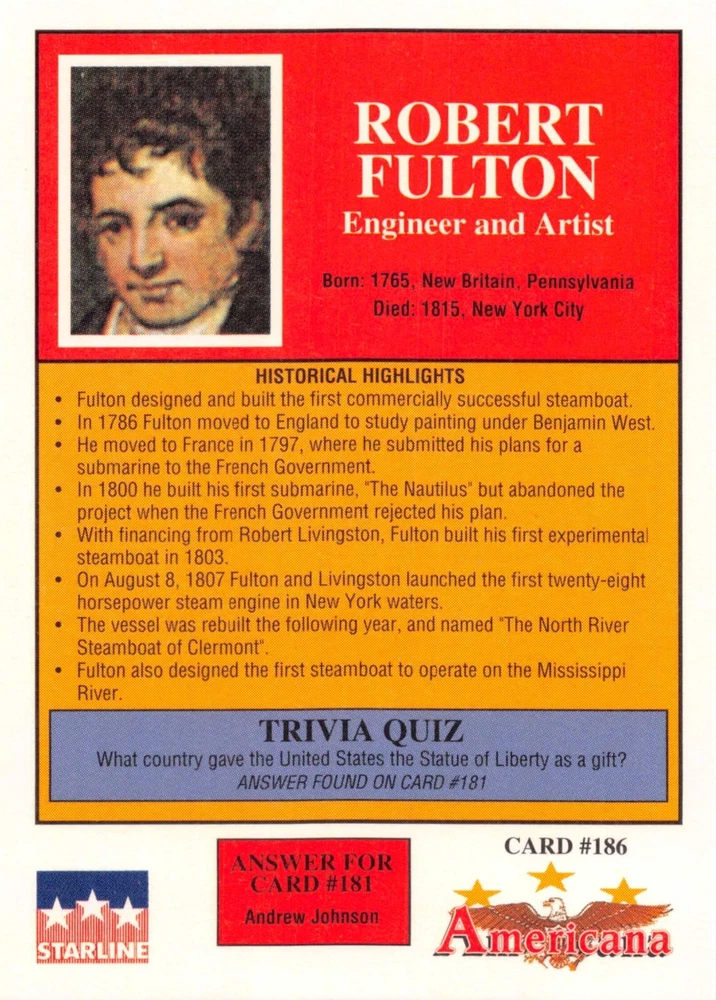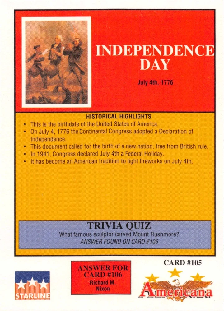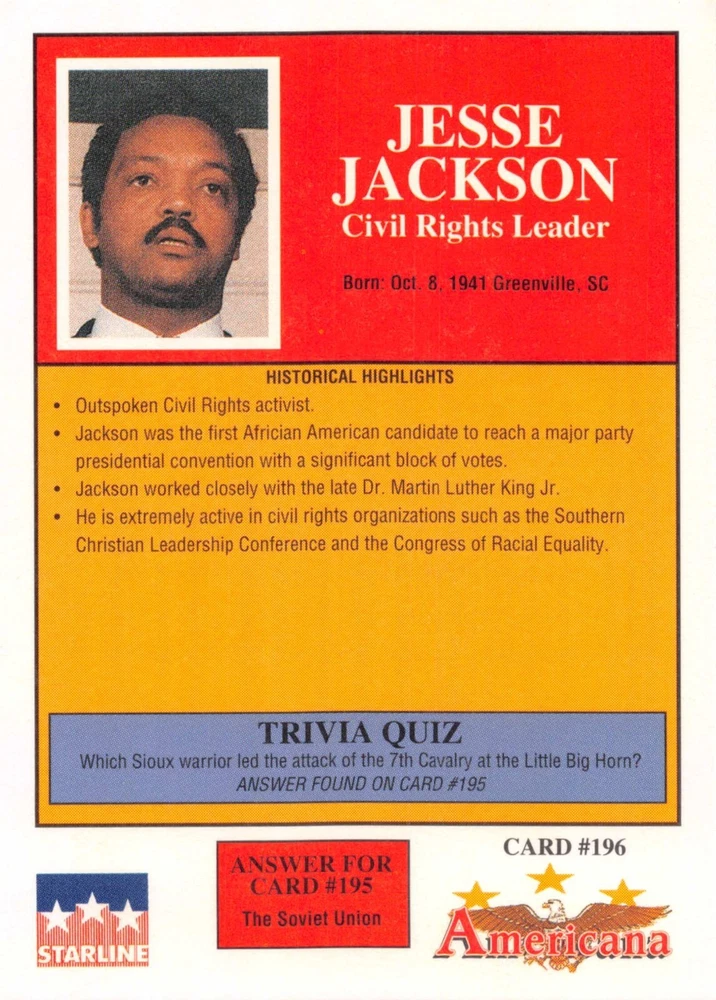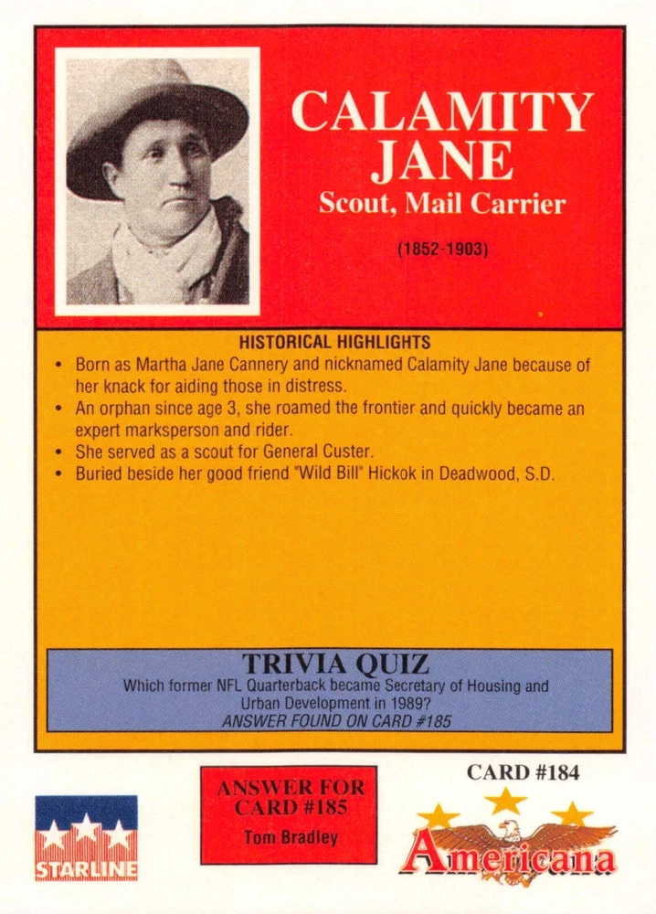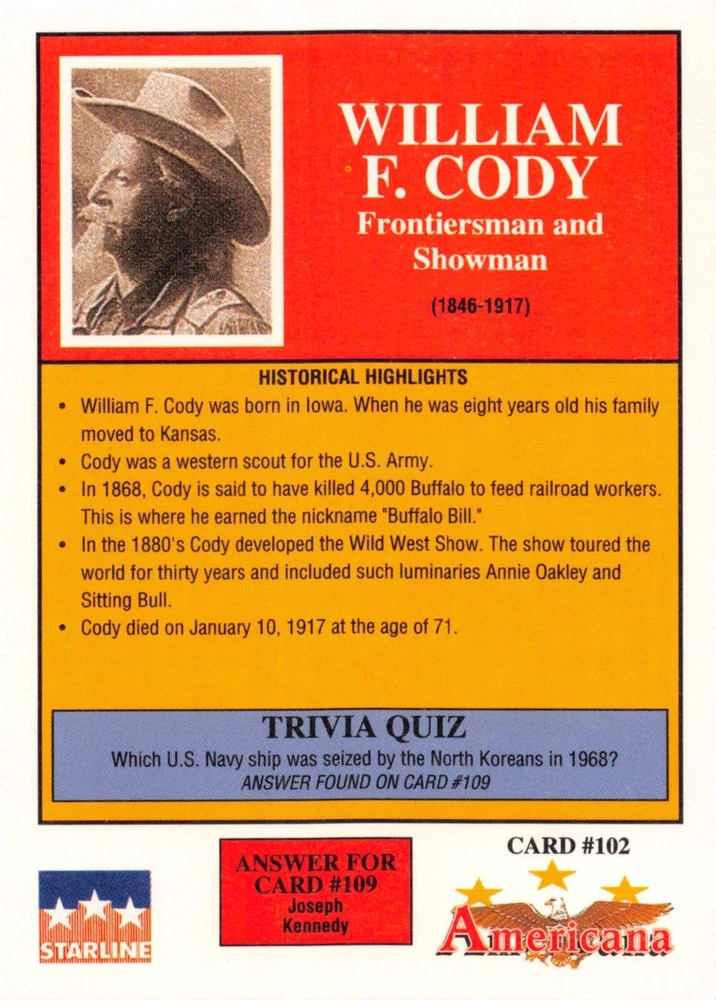 This listing is for your choice of any available 1991 Starline Americana Historic Trading Cards card from the drop-down menu above. Photos show front and backside of each card, be sure to scroll sideways to view front and backside photos! Any questions? Please ask before buying. International "USPS First Class Mail" will not include a tracking number for this item, if you would like a tracking number please choose the "eBay International Standard Shipping" option when you check out. As with all of my "pick-a-card" listings, I will be shipping with "eBay Standard Envelope". The rules of this envelope state that it cannot be too thick, so please expect your order to be packaged as follows: 1 to 6 cards will be slid into a single sleeve, the sleeve will then be slid inside of a semi-rigid Card-Saver. 7 to 12 cards will be slid into a double sleeve, 13 to 18 cards into a triple sleeve, 19 to 24 cards into a quadruple sleeve(up to six cards per sleeve). The double, triple and quadruple sleeve shipping will not have the Card-Saver. If you buy more than 1 card and want it packaged with more than 1 Card-Saver(or 1 sleeve per card), I kindly ask that you contact me before purchasing to be sure that this is possible to have it done with the stated shipping charge, or if additional shipping would be required. If you do not contact me, then you can expect to receive your order packaged as I have explained here. Please do not expect rigid top-loaders to be included, I don't normally keep a lot of them in stock, but if you message me prior to ordering I will be able to see if I have any that can be included with your order - additional shipping may be required. In order to get free combined shipping from this and any of my other "pick-a-card" listings, you must add all of your cards to the cart and check out when you are done shopping. If you do not use the cart you will be overpaying on shipping and I cannot refund you on over-payed shipping. So please use the cart and get your FREE COMBINED SHIPPING!