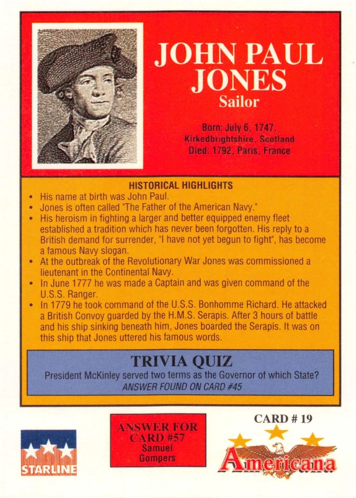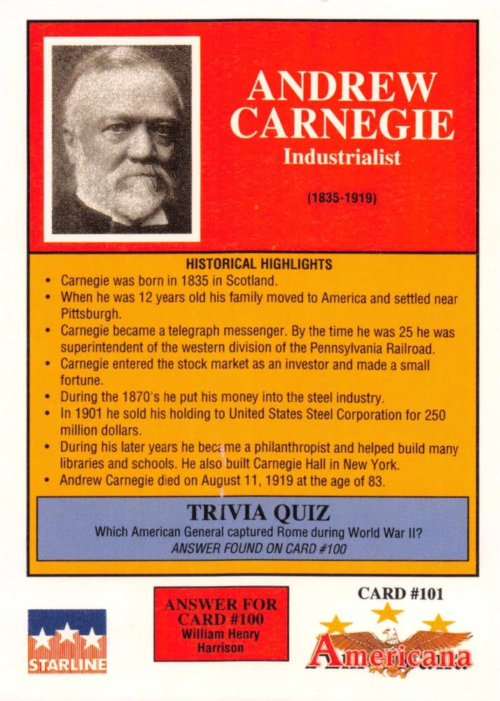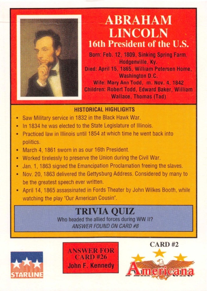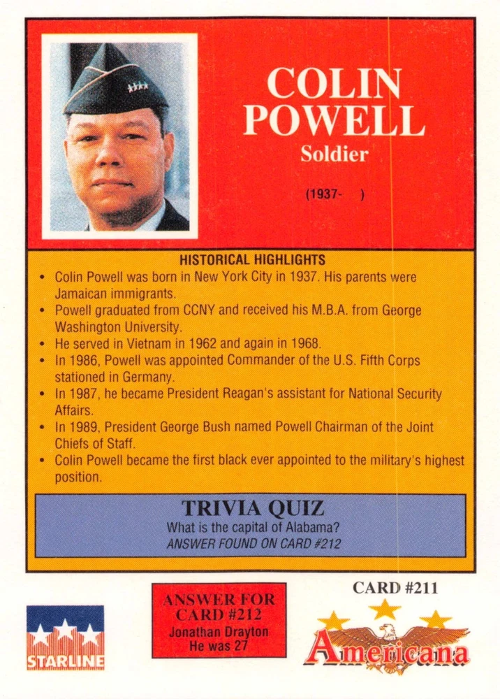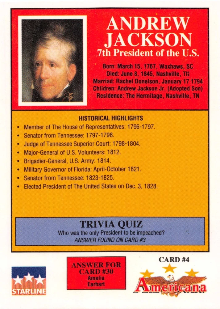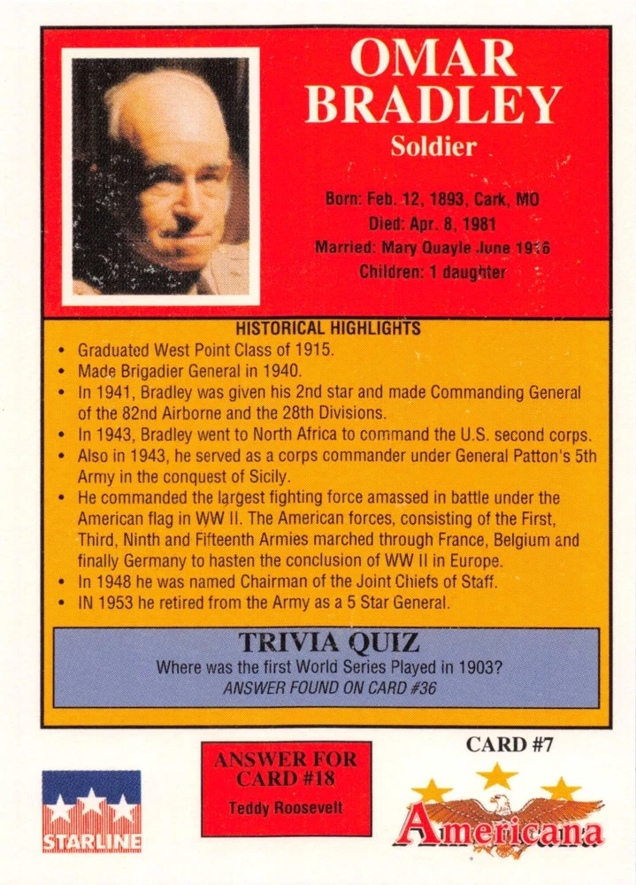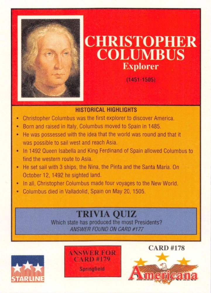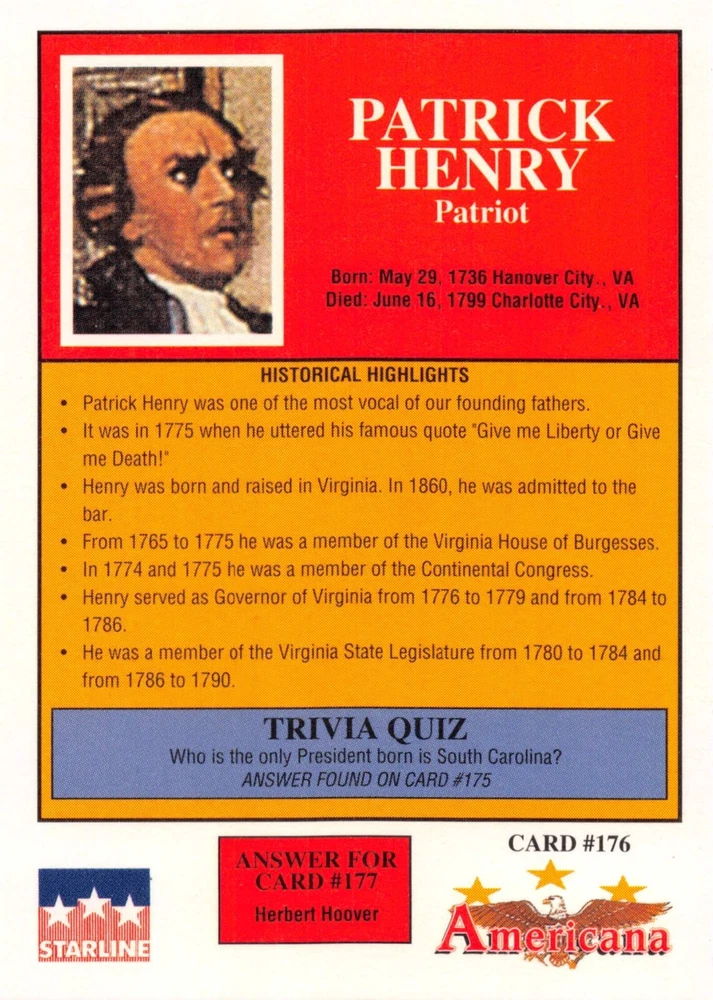 This listing is for your choice of any available 1991 Starline Americana Historic Trading Cards card from the drop-down menu above. Photos show front and backside of each card, be sure to scroll sideways to view front and backside photos! Any questions? Please ask before buying. International "USPS First Class Mail" will not include a tracking number for this item, if you would like a tracking number please choose the "eBay International Standard Shipping" option when you check out. As with all of my "pick-a-card" listings, I will be shipping with "eBay Standard Envelope". The rules of this envelope state that it cannot be too thick, so please expect your order to be packaged as follows: 1 to 6 cards will be slid into a single sleeve, the sleeve will then be slid inside of a semi-rigid Card-Saver. 7 to 12 cards will be slid into a double sleeve, 13 to 18 cards into a triple sleeve, 19 to 24 cards into a quadruple sleeve(up to six cards per sleeve). The double, triple and quadruple sleeve shipping will not have the Card-Saver. If you buy more than 1 card and want it packaged with more than 1 Card-Saver(or 1 sleeve per card), I kindly ask that you contact me before purchasing to be sure that this is possible to have it done with the stated shipping charge, or if additional shipping would be required. If you do not contact me, then you can expect to receive your order packaged as I have explained here. Please do not expect rigid top-loaders to be included, I don't normally keep a lot of them in stock, but if you message me prior to ordering I will be able to see if I have any that can be included with your order - additional shipping may be required. In order to get free combined shipping from this and any of my other "pick-a-card" listings, you must add all of your cards to the cart and check out when you are done shopping. If you do not use the cart you will be overpaying on shipping and I cannot refund you on over-payed shipping. So please use the cart and get your FREE COMBINED SHIPPING!