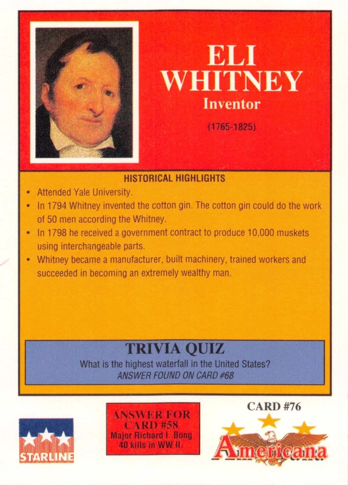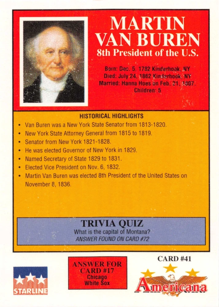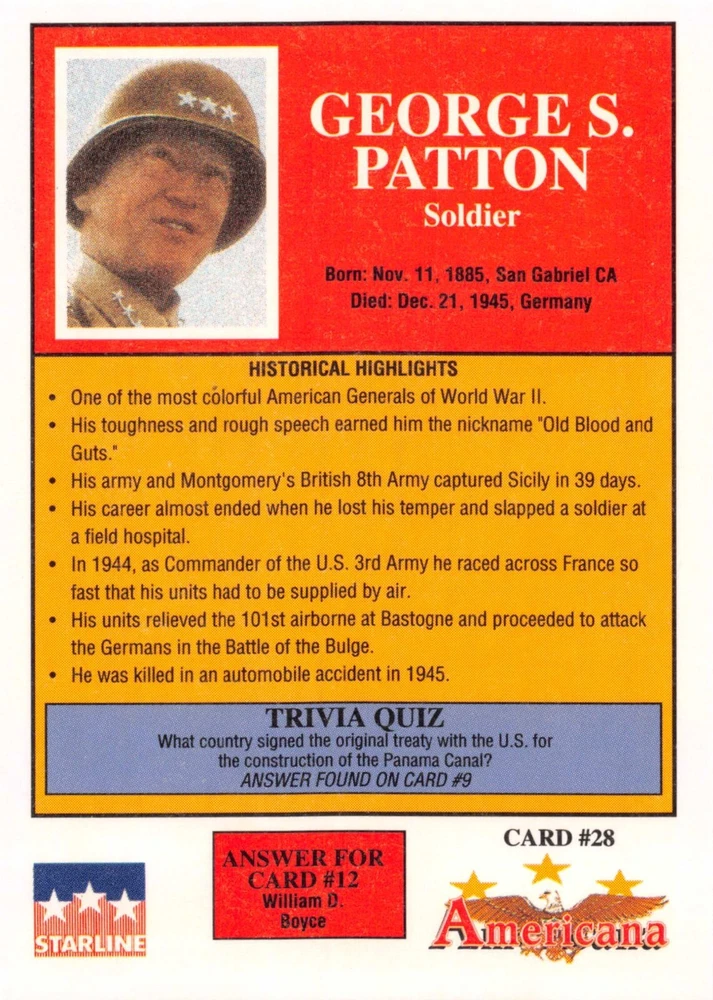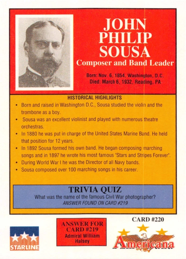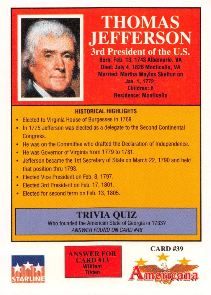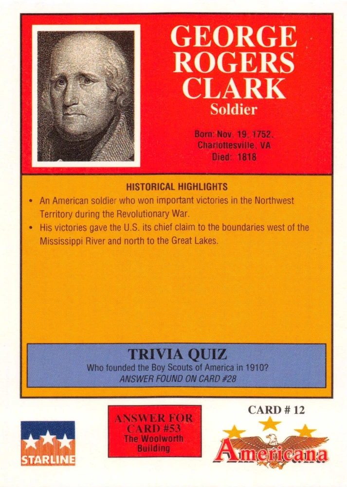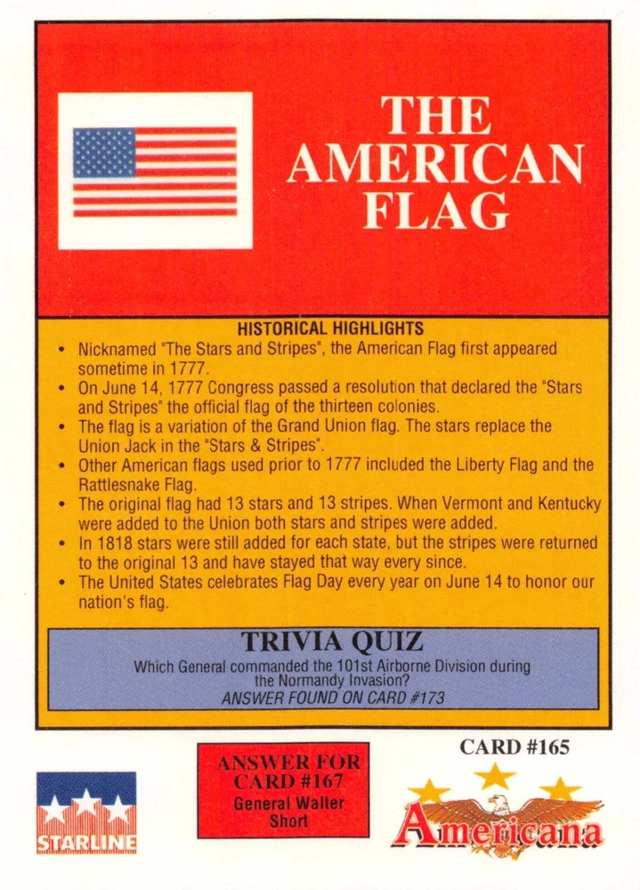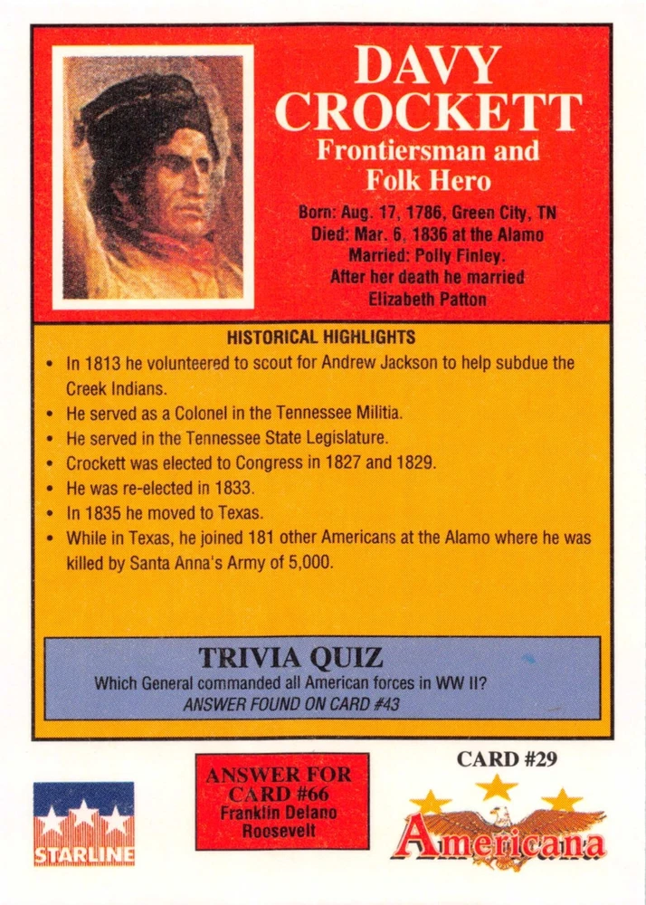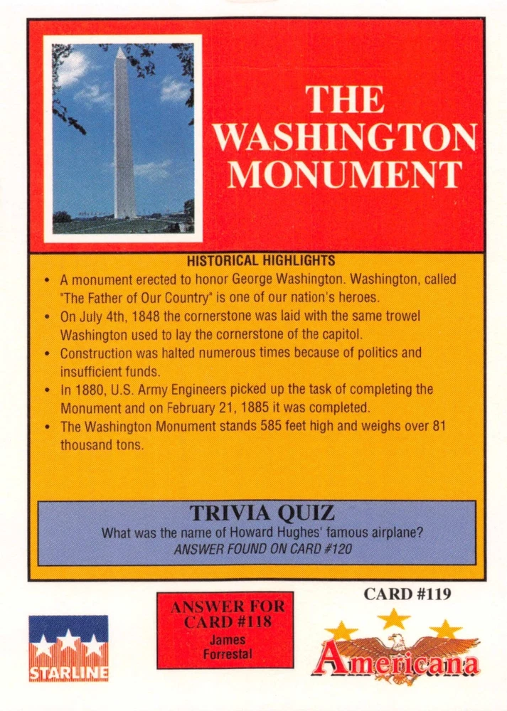 This listing is for your choice of any available 1991 Starline Americana Historic Trading Cards card from the drop-down menu above. Photos show front and backside of each card, be sure to scroll sideways to view front and backside photos! Any questions? Please ask before buying. International "USPS First Class Mail" will not include a tracking number for this item, if you would like a tracking number please choose the "eBay International Standard Shipping" option when you check out. As with all of my "pick-a-card" listings, I will be shipping with "eBay Standard Envelope". The rules of this envelope state that it cannot be too thick, so please expect your order to be packaged as follows: 1 to 6 cards will be slid into a single sleeve, the sleeve will then be slid inside of a semi-rigid Card-Saver. 7 to 12 cards will be slid into a double sleeve, 13 to 18 cards into a triple sleeve, 19 to 24 cards into a quadruple sleeve(up to six cards per sleeve). The double, triple and quadruple sleeve shipping will not have the Card-Saver. If you buy more than 1 card and want it packaged with more than 1 Card-Saver(or 1 sleeve per card), I kindly ask that you contact me before purchasing to be sure that this is possible to have it done with the stated shipping charge, or if additional shipping would be required. If you do not contact me, then you can expect to receive your order packaged as I have explained here. Please do not expect rigid top-loaders to be included, I don't normally keep a lot of them in stock, but if you message me prior to ordering I will be able to see if I have any that can be included with your order - additional shipping may be required. In order to get free combined shipping from this and any of my other "pick-a-card" listings, you must add all of your cards to the cart and check out when you are done shopping. If you do not use the cart you will be overpaying on shipping and I cannot refund you on over-payed shipping. So please use the cart and get your FREE COMBINED SHIPPING!