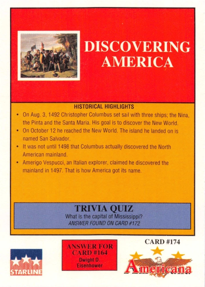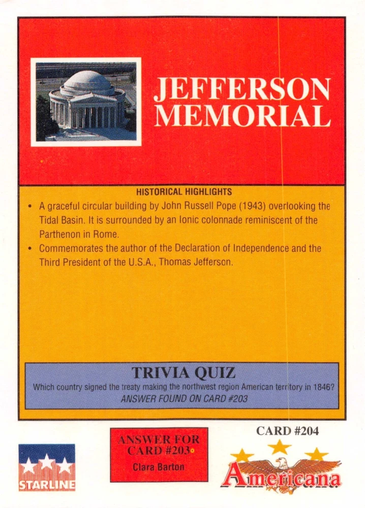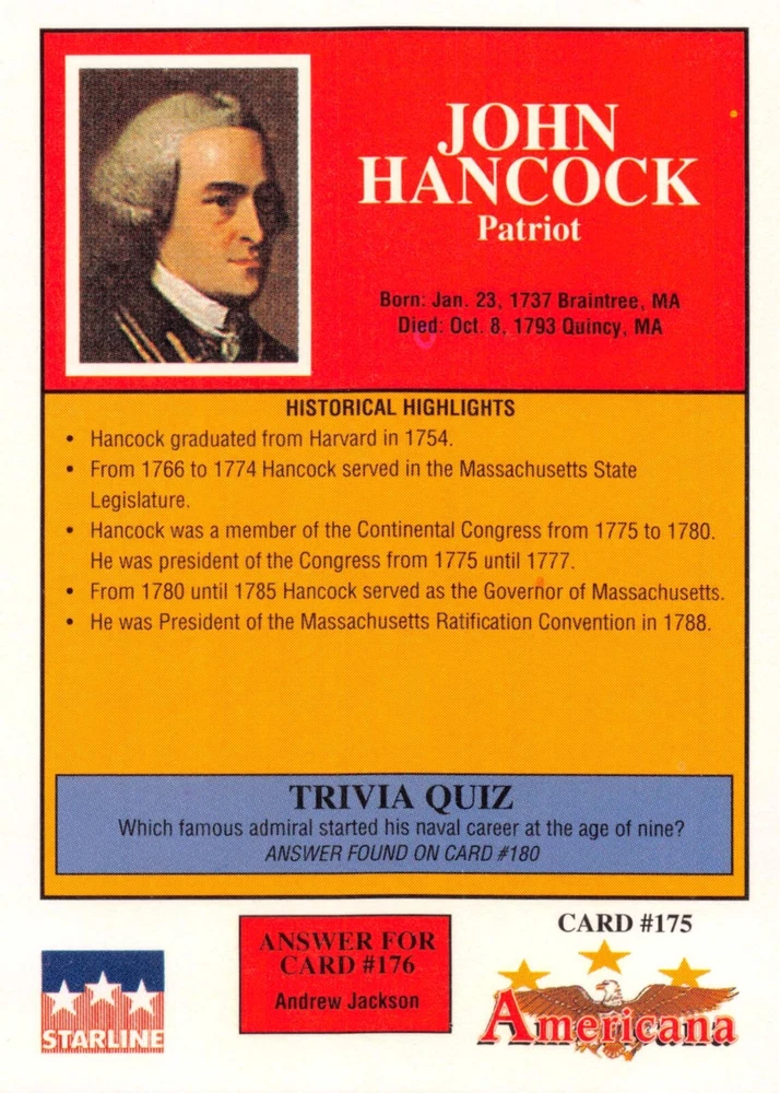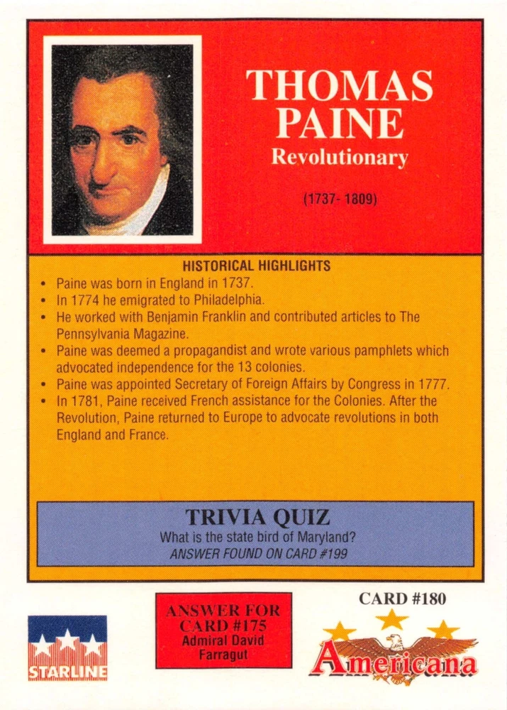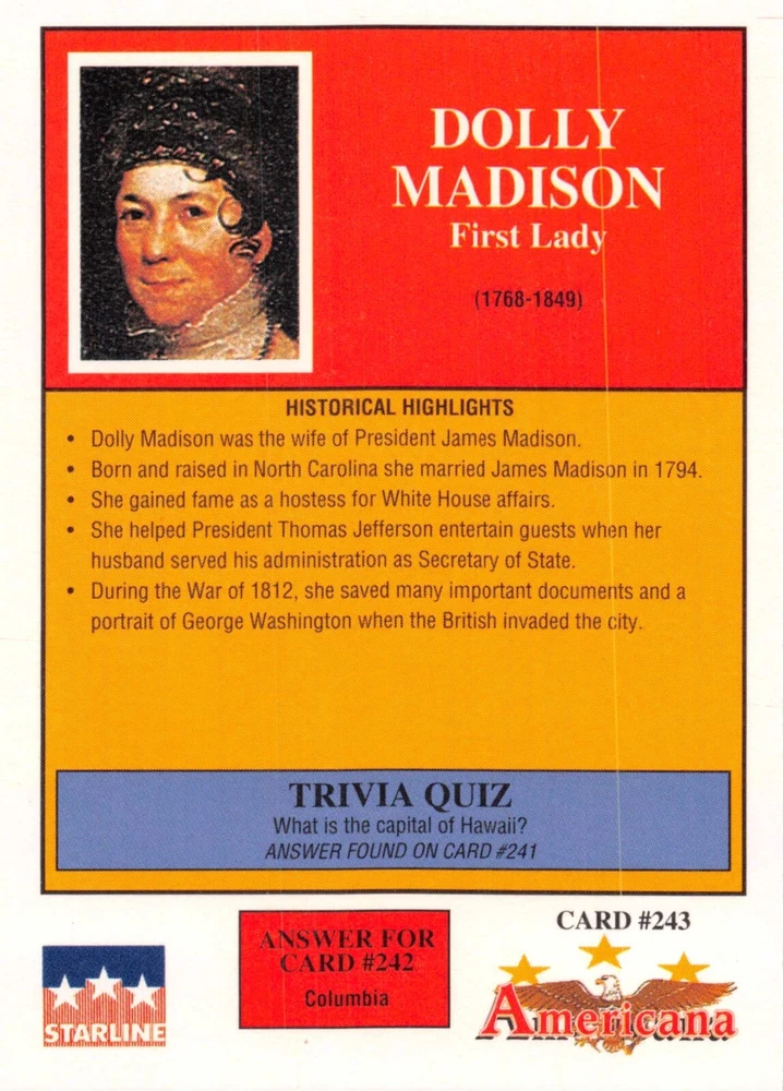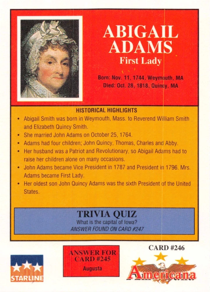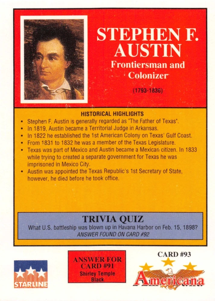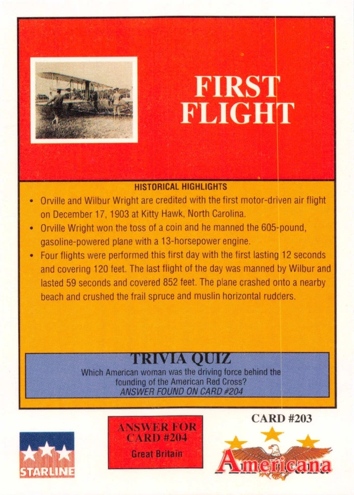 This listing is for your choice of any available 1991 Starline Americana Historic Trading Cards card from the drop-down menu above. Photos show front and backside of each card, be sure to scroll sideways to view front and backside photos! Any questions? Please ask before buying. International "USPS First Class Mail" will not include a tracking number for this item, if you would like a tracking number please choose the "eBay International Standard Shipping" option when you check out. As with all of my "pick-a-card" listings, I will be shipping with "eBay Standard Envelope". The rules of this envelope state that it cannot be too thick, so please expect your order to be packaged as follows: 1 to 6 cards will be slid into a single sleeve, the sleeve will then be slid inside of a semi-rigid Card-Saver. 7 to 12 cards will be slid into a double sleeve, 13 to 18 cards into a triple sleeve, 19 to 24 cards into a quadruple sleeve(up to six cards per sleeve). The double, triple and quadruple sleeve shipping will not have the Card-Saver. If you buy more than 1 card and want it packaged with more than 1 Card-Saver(or 1 sleeve per card), I kindly ask that you contact me before purchasing to be sure that this is possible to have it done with the stated shipping charge, or if additional shipping would be required. If you do not contact me, then you can expect to receive your order packaged as I have explained here. Please do not expect rigid top-loaders to be included, I don't normally keep a lot of them in stock, but if you message me prior to ordering I will be able to see if I have any that can be included with your order - additional shipping may be required. In order to get free combined shipping from this and any of my other "pick-a-card" listings, you must add all of your cards to the cart and check out when you are done shopping. If you do not use the cart you will be overpaying on shipping and I cannot refund you on over-payed shipping. So please use the cart and get your FREE COMBINED SHIPPING!