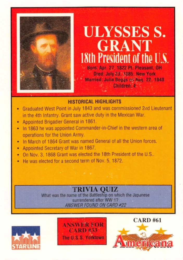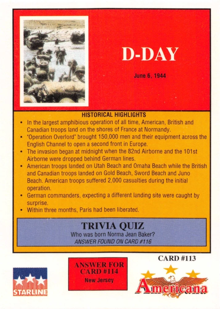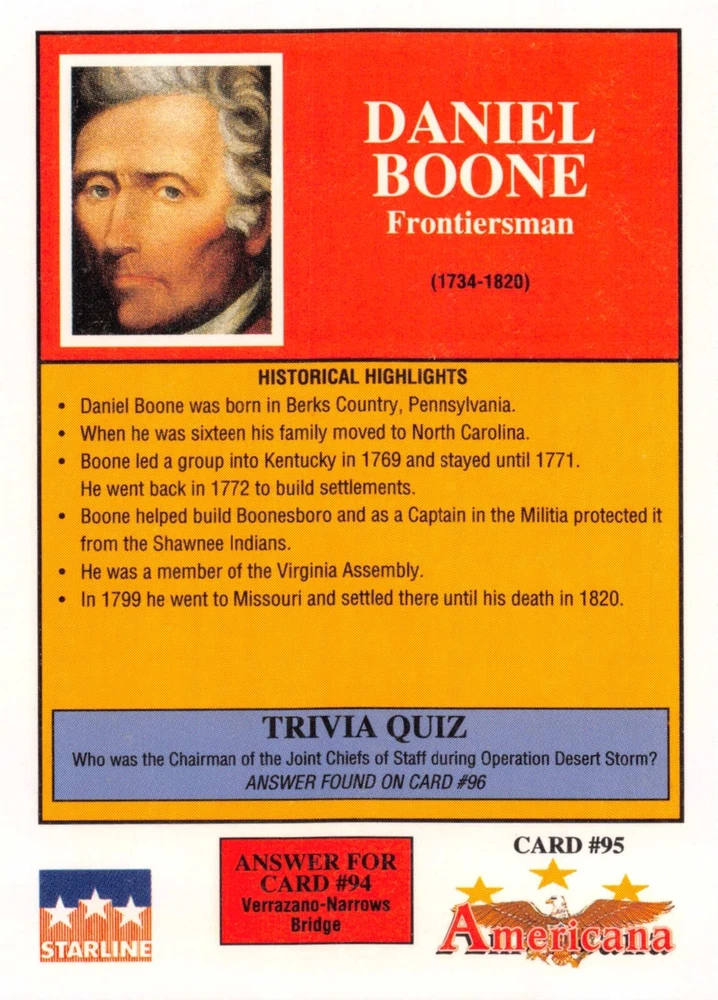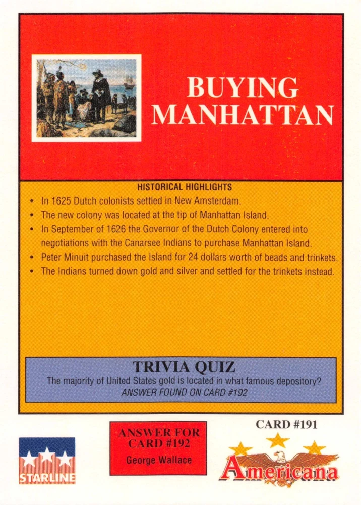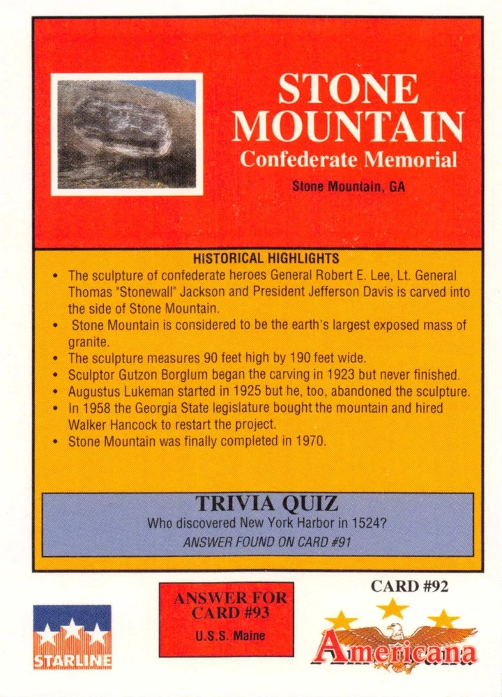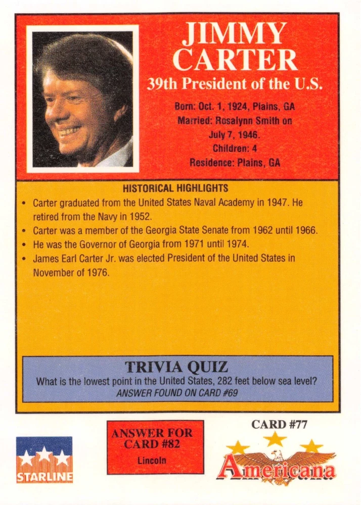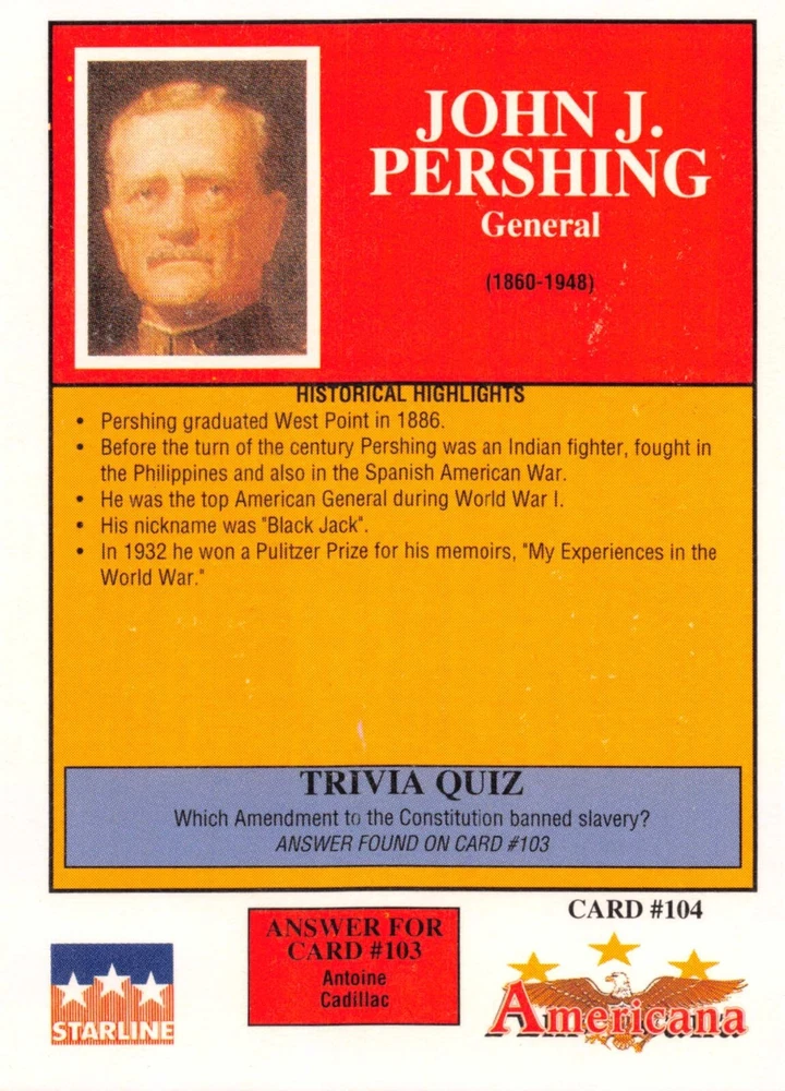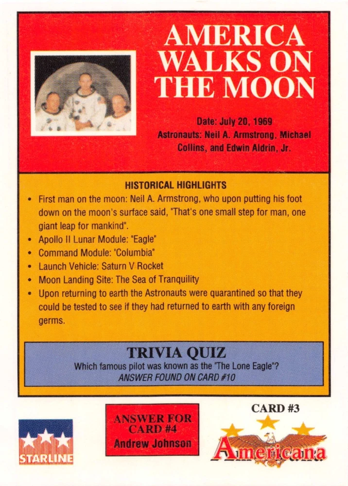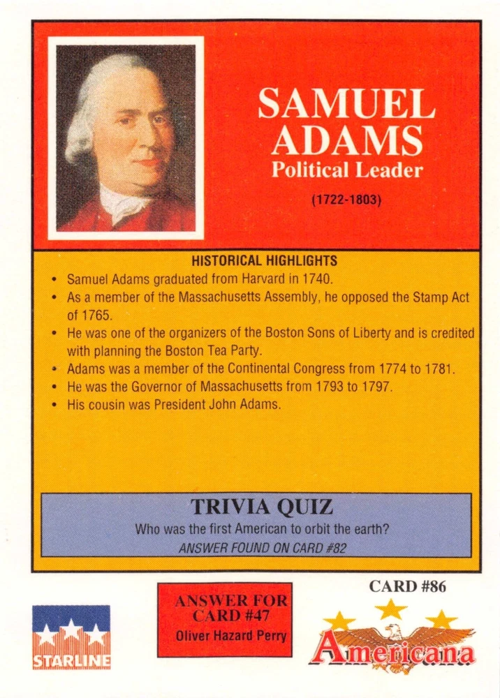 This listing is for your choice of any available 1991 Starline Americana Historic Trading Cards card from the drop-down menu above. Photos show front and backside of each card, be sure to scroll sideways to view front and backside photos! Any questions? Please ask before buying. International "USPS First Class Mail" will not include a tracking number for this item, if you would like a tracking number please choose the "eBay International Standard Shipping" option when you check out. As with all of my "pick-a-card" listings, I will be shipping with "eBay Standard Envelope". The rules of this envelope state that it cannot be too thick, so please expect your order to be packaged as follows: 1 to 6 cards will be slid into a single sleeve, the sleeve will then be slid inside of a semi-rigid Card-Saver. 7 to 12 cards will be slid into a double sleeve, 13 to 18 cards into a triple sleeve, 19 to 24 cards into a quadruple sleeve(up to six cards per sleeve). The double, triple and quadruple sleeve shipping will not have the Card-Saver. If you buy more than 1 card and want it packaged with more than 1 Card-Saver(or 1 sleeve per card), I kindly ask that you contact me before purchasing to be sure that this is possible to have it done with the stated shipping charge, or if additional shipping would be required. If you do not contact me, then you can expect to receive your order packaged as I have explained here. Please do not expect rigid top-loaders to be included, I don't normally keep a lot of them in stock, but if you message me prior to ordering I will be able to see if I have any that can be included with your order - additional shipping may be required. In order to get free combined shipping from this and any of my other "pick-a-card" listings, you must add all of your cards to the cart and check out when you are done shopping. If you do not use the cart you will be overpaying on shipping and I cannot refund you on over-payed shipping. So please use the cart and get your FREE COMBINED SHIPPING!