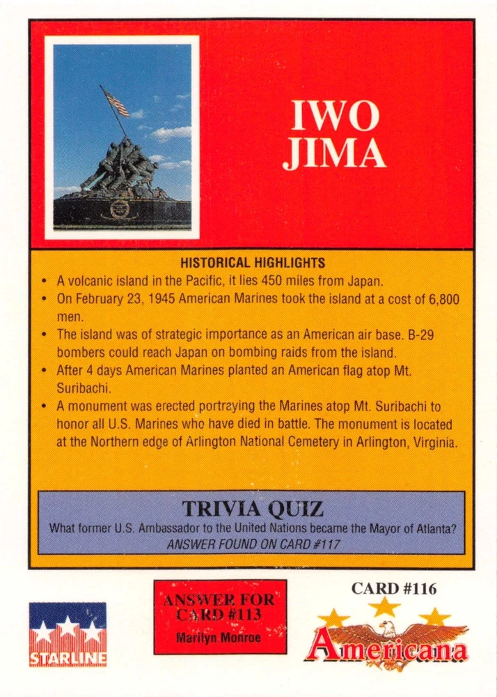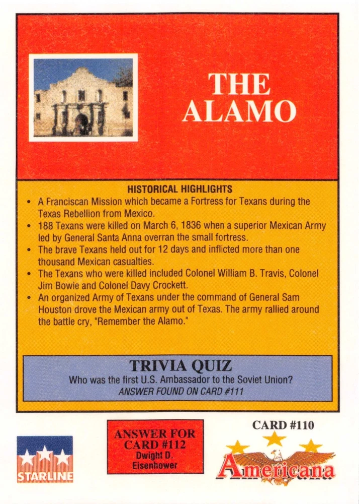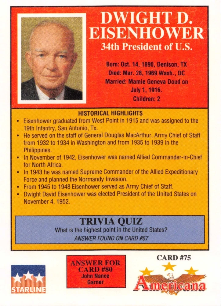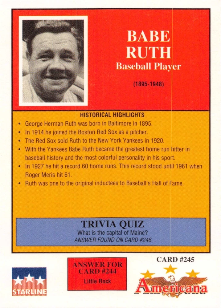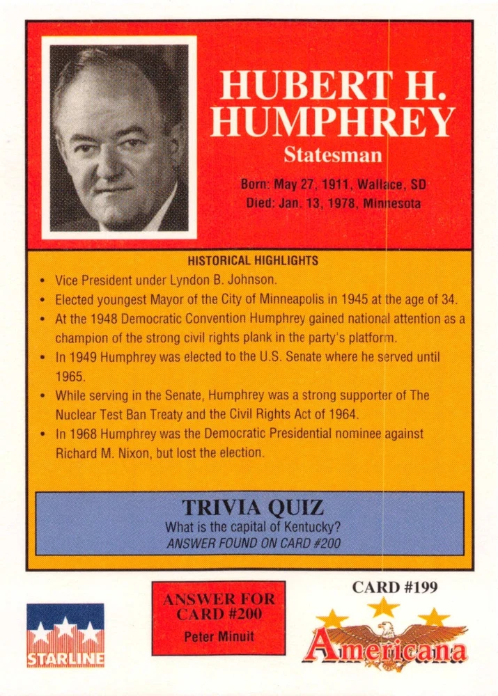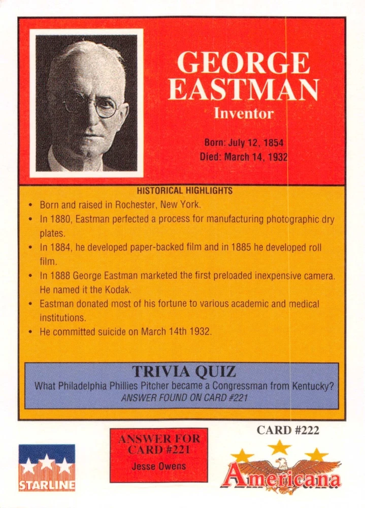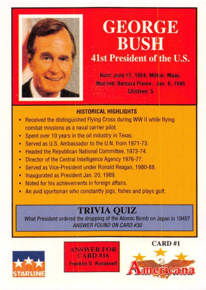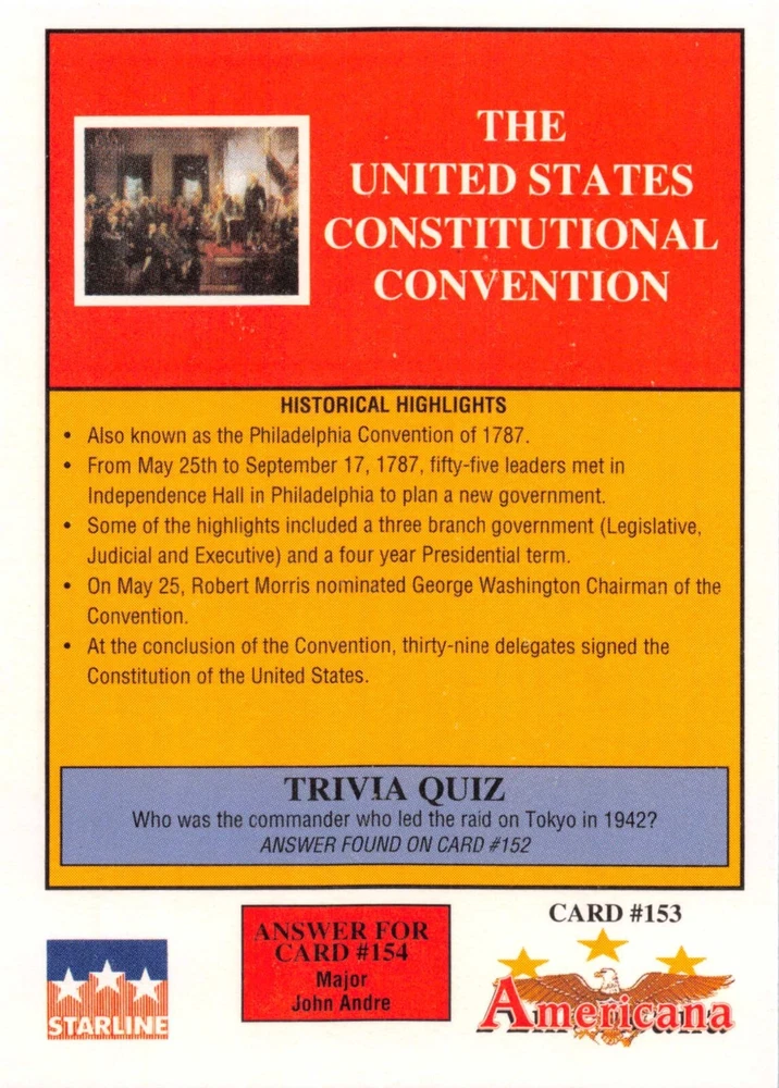 This listing is for your choice of any available 1991 Starline Americana Historic Trading Cards card from the drop-down menu above. Photos show front and backside of each card, be sure to scroll sideways to view front and backside photos! Any questions? Please ask before buying. International "USPS First Class Mail" will not include a tracking number for this item, if you would like a tracking number please choose the "eBay International Standard Shipping" option when you check out. As with all of my "pick-a-card" listings, I will be shipping with "eBay Standard Envelope". The rules of this envelope state that it cannot be too thick, so please expect your order to be packaged as follows: 1 to 6 cards will be slid into a single sleeve, the sleeve will then be slid inside of a semi-rigid Card-Saver. 7 to 12 cards will be slid into a double sleeve, 13 to 18 cards into a triple sleeve, 19 to 24 cards into a quadruple sleeve(up to six cards per sleeve). The double, triple and quadruple sleeve shipping will not have the Card-Saver. If you buy more than 1 card and want it packaged with more than 1 Card-Saver(or 1 sleeve per card), I kindly ask that you contact me before purchasing to be sure that this is possible to have it done with the stated shipping charge, or if additional shipping would be required. If you do not contact me, then you can expect to receive your order packaged as I have explained here. Please do not expect rigid top-loaders to be included, I don't normally keep a lot of them in stock, but if you message me prior to ordering I will be able to see if I have any that can be included with your order - additional shipping may be required. In order to get free combined shipping from this and any of my other "pick-a-card" listings, you must add all of your cards to the cart and check out when you are done shopping. If you do not use the cart you will be overpaying on shipping and I cannot refund you on over-payed shipping. So please use the cart and get your FREE COMBINED SHIPPING!