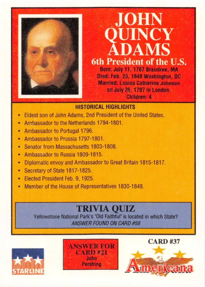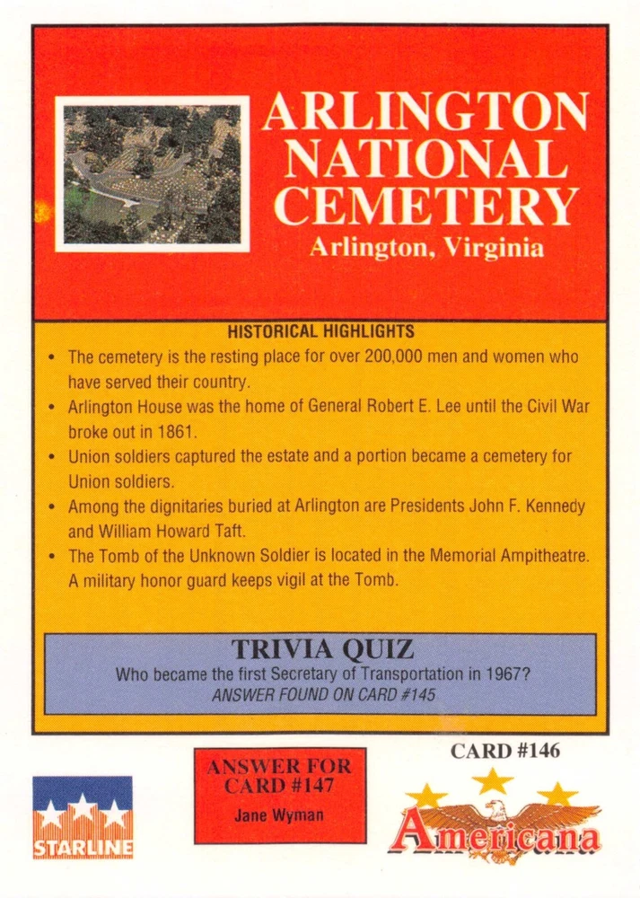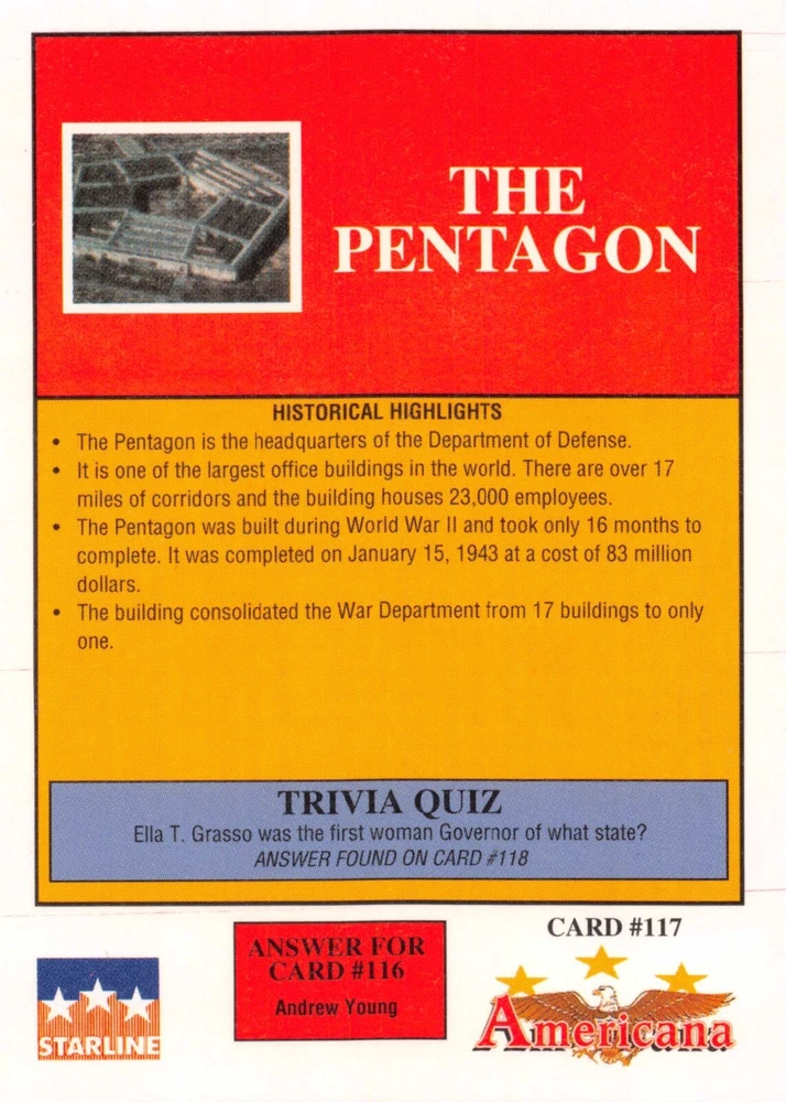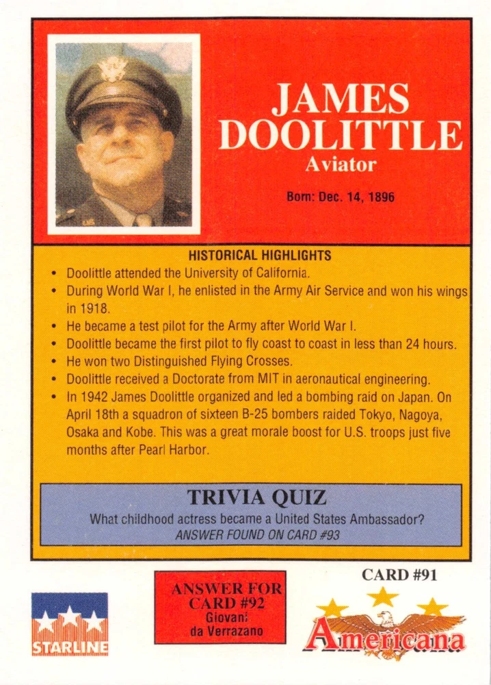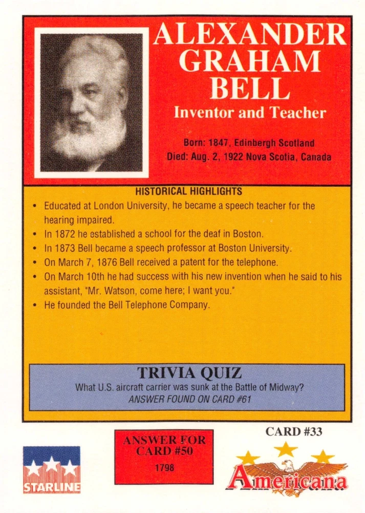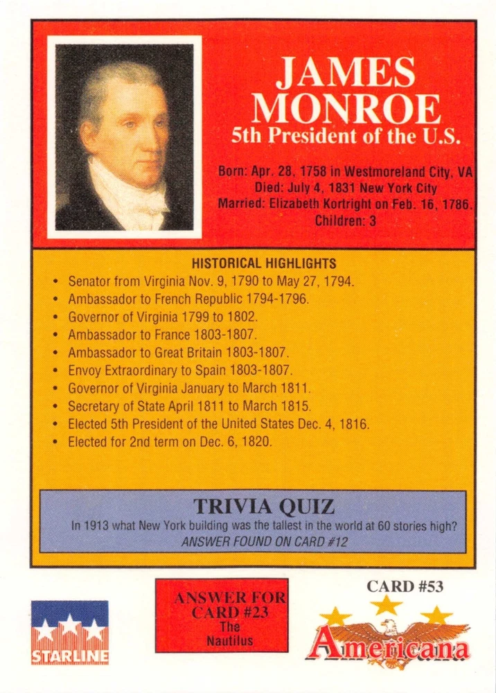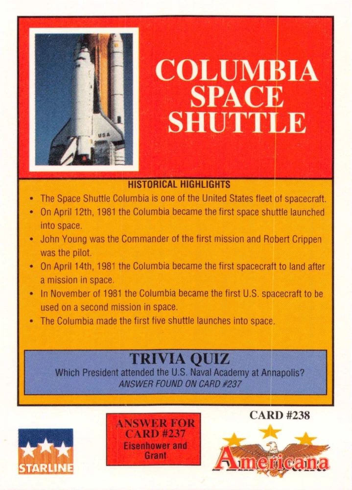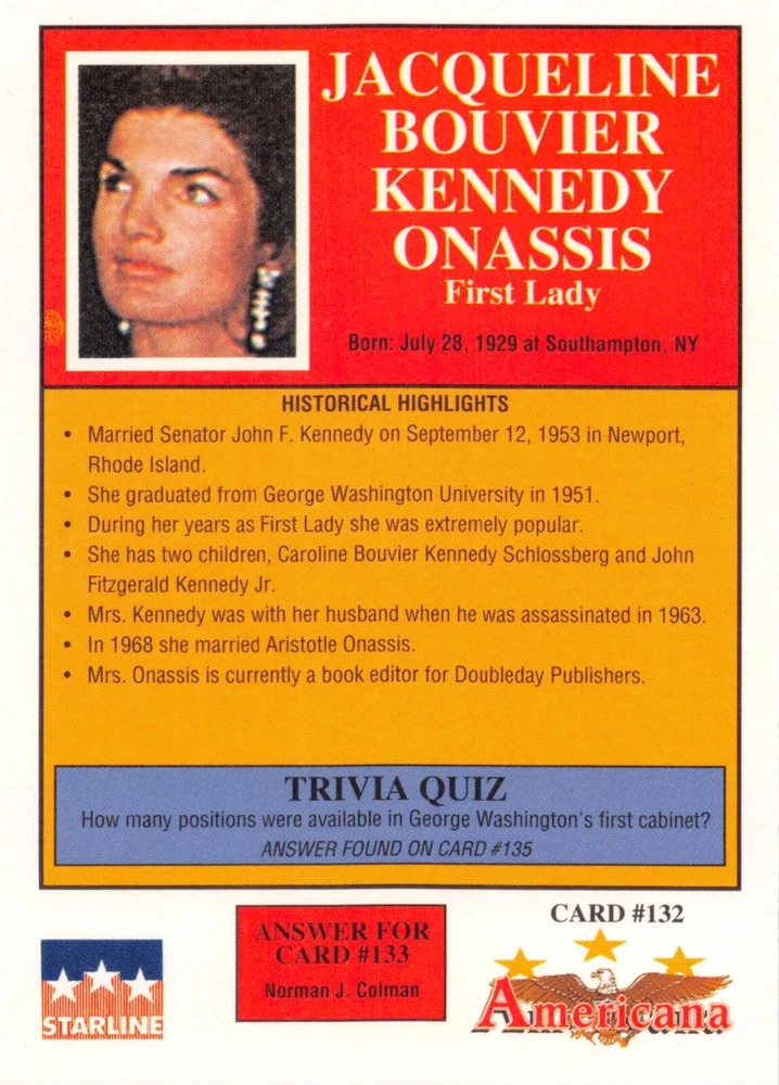 This listing is for your choice of any available 1991 Starline Americana Historic Trading Cards card from the drop-down menu above. Photos show front and backside of each card, be sure to scroll sideways to view front and backside photos! Any questions? Please ask before buying. International "USPS First Class Mail" will not include a tracking number for this item, if you would like a tracking number please choose the "eBay International Standard Shipping" option when you check out. As with all of my "pick-a-card" listings, I will be shipping with "eBay Standard Envelope". The rules of this envelope state that it cannot be too thick, so please expect your order to be packaged as follows: 1 to 6 cards will be slid into a single sleeve, the sleeve will then be slid inside of a semi-rigid Card-Saver. 7 to 12 cards will be slid into a double sleeve, 13 to 18 cards into a triple sleeve, 19 to 24 cards into a quadruple sleeve(up to six cards per sleeve). The double, triple and quadruple sleeve shipping will not have the Card-Saver. If you buy more than 1 card and want it packaged with more than 1 Card-Saver(or 1 sleeve per card), I kindly ask that you contact me before purchasing to be sure that this is possible to have it done with the stated shipping charge, or if additional shipping would be required. If you do not contact me, then you can expect to receive your order packaged as I have explained here. Please do not expect rigid top-loaders to be included, I don't normally keep a lot of them in stock, but if you message me prior to ordering I will be able to see if I have any that can be included with your order - additional shipping may be required. In order to get free combined shipping from this and any of my other "pick-a-card" listings, you must add all of your cards to the cart and check out when you are done shopping. If you do not use the cart you will be overpaying on shipping and I cannot refund you on over-payed shipping. So please use the cart and get your FREE COMBINED SHIPPING!