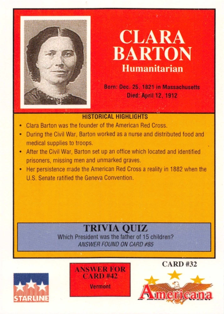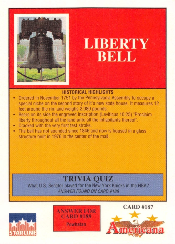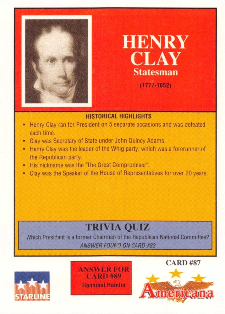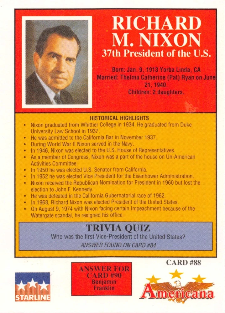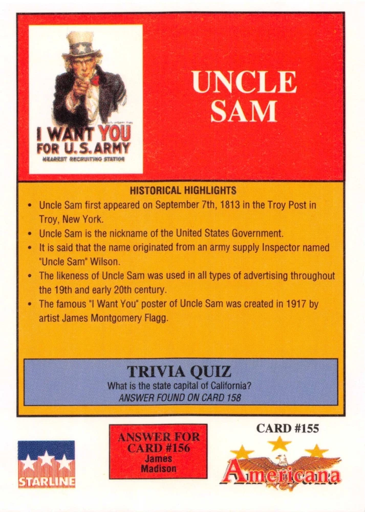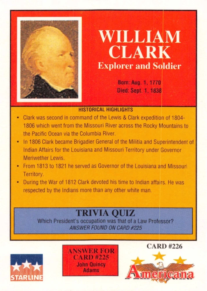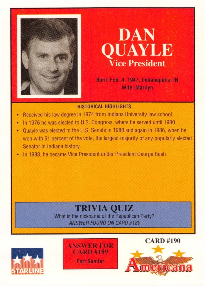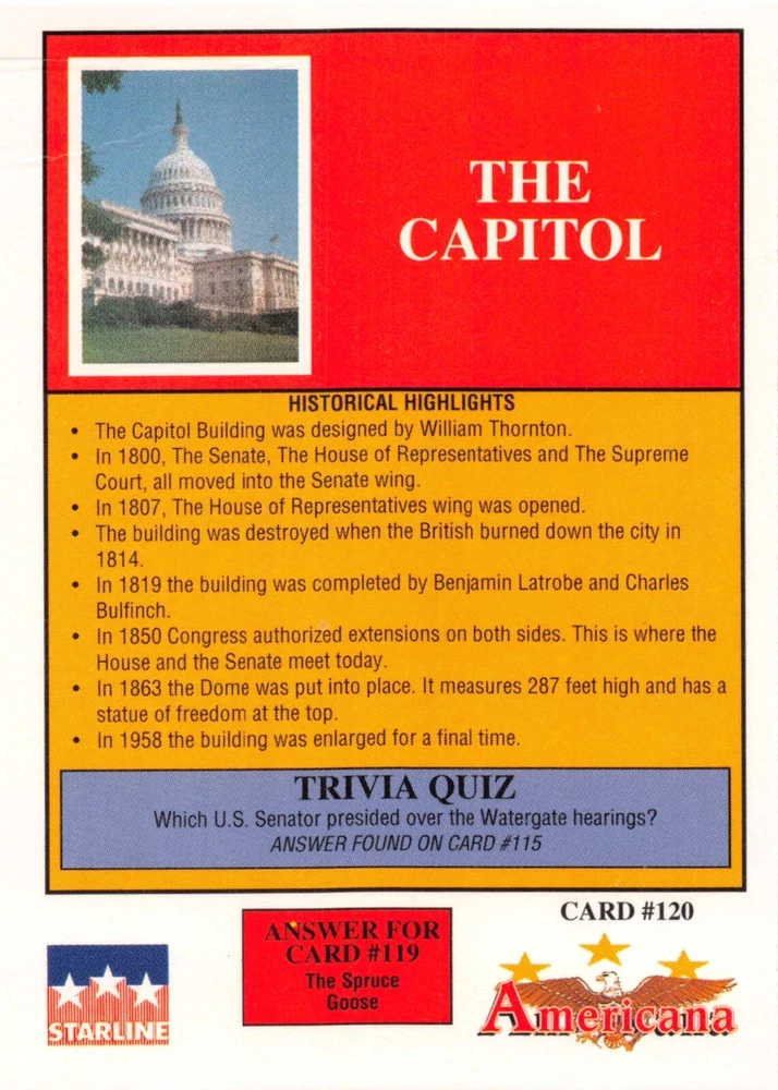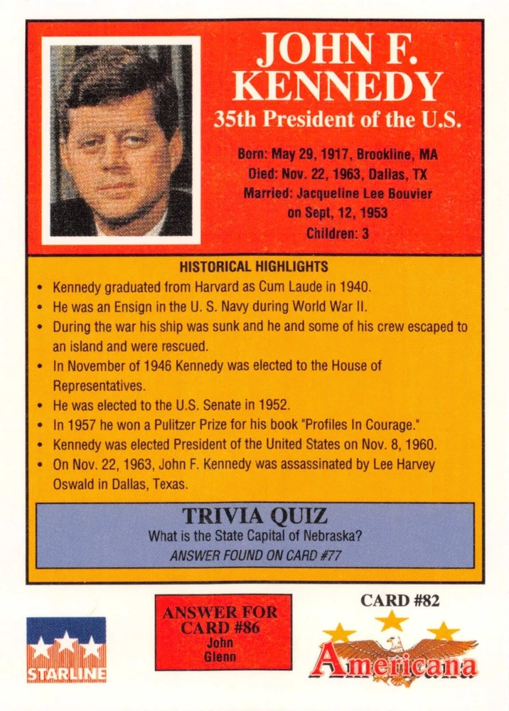 This listing is for your choice of any available 1991 Starline Americana Historic Trading Cards card from the drop-down menu above. Photos show front and backside of each card, be sure to scroll sideways to view front and backside photos! Any questions? Please ask before buying. International "USPS First Class Mail" will not include a tracking number for this item, if you would like a tracking number please choose the "eBay International Standard Shipping" option when you check out. As with all of my "pick-a-card" listings, I will be shipping with "eBay Standard Envelope". The rules of this envelope state that it cannot be too thick, so please expect your order to be packaged as follows: 1 to 6 cards will be slid into a single sleeve, the sleeve will then be slid inside of a semi-rigid Card-Saver. 7 to 12 cards will be slid into a double sleeve, 13 to 18 cards into a triple sleeve, 19 to 24 cards into a quadruple sleeve(up to six cards per sleeve). The double, triple and quadruple sleeve shipping will not have the Card-Saver. If you buy more than 1 card and want it packaged with more than 1 Card-Saver(or 1 sleeve per card), I kindly ask that you contact me before purchasing to be sure that this is possible to have it done with the stated shipping charge, or if additional shipping would be required. If you do not contact me, then you can expect to receive your order packaged as I have explained here. Please do not expect rigid top-loaders to be included, I don't normally keep a lot of them in stock, but if you message me prior to ordering I will be able to see if I have any that can be included with your order - additional shipping may be required. In order to get free combined shipping from this and any of my other "pick-a-card" listings, you must add all of your cards to the cart and check out when you are done shopping. If you do not use the cart you will be overpaying on shipping and I cannot refund you on over-payed shipping. So please use the cart and get your FREE COMBINED SHIPPING!