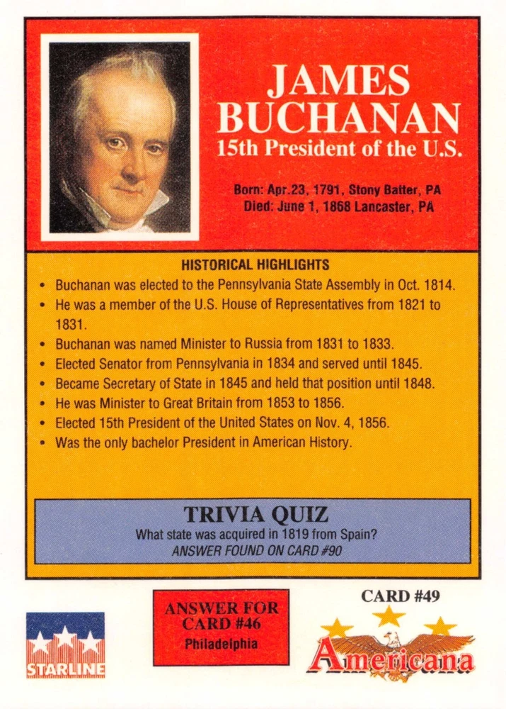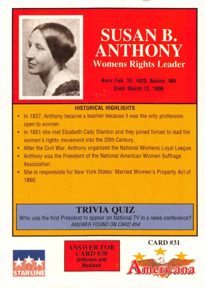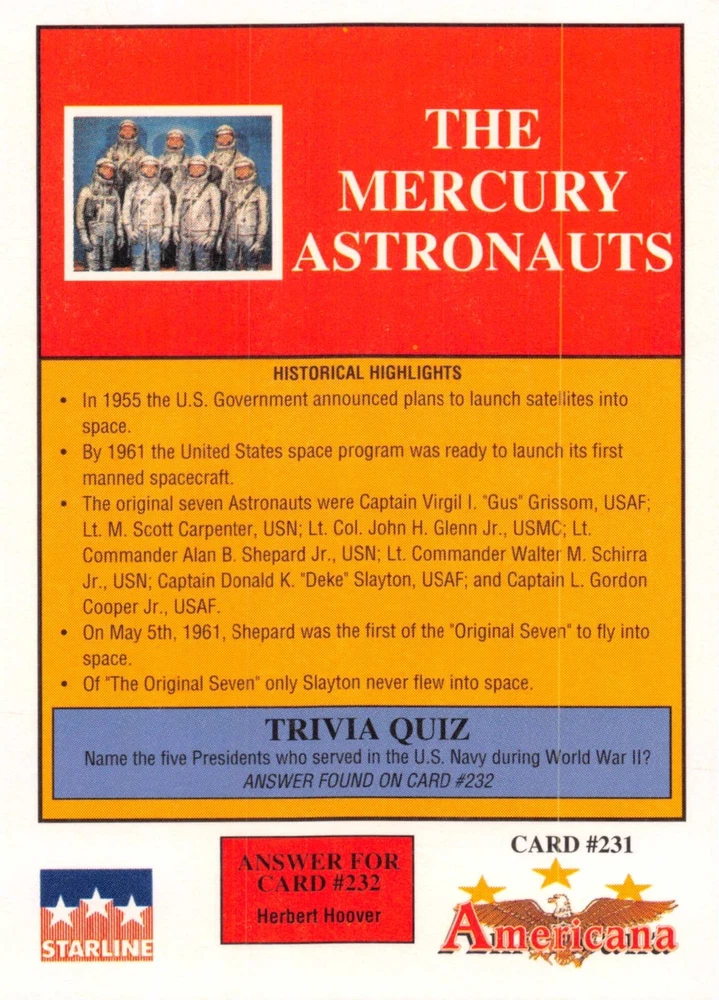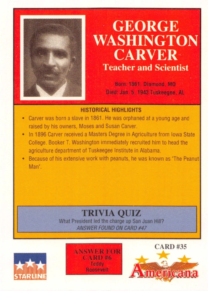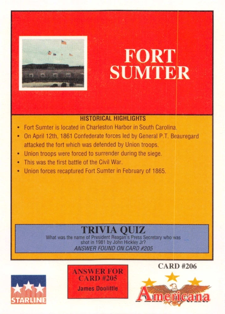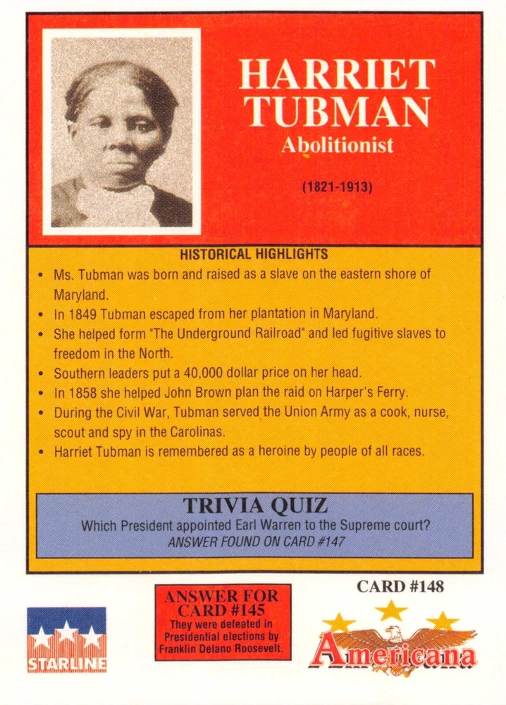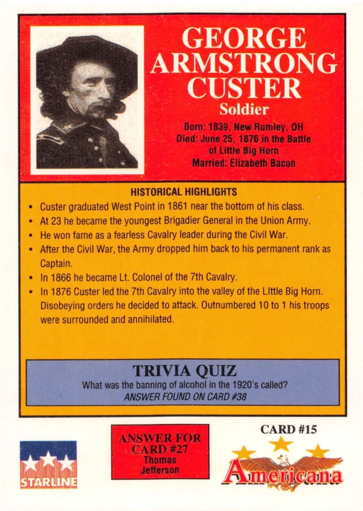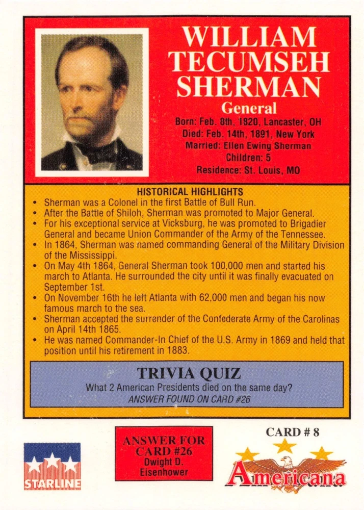 This listing is for your choice of any available 1991 Starline Americana Historic Trading Cards card from the drop-down menu above. Photos show front and backside of each card, be sure to scroll sideways to view front and backside photos! Any questions? Please ask before buying. International "USPS First Class Mail" will not include a tracking number for this item, if you would like a tracking number please choose the "eBay International Standard Shipping" option when you check out. As with all of my "pick-a-card" listings, I will be shipping with "eBay Standard Envelope". The rules of this envelope state that it cannot be too thick, so please expect your order to be packaged as follows: 1 to 6 cards will be slid into a single sleeve, the sleeve will then be slid inside of a semi-rigid Card-Saver. 7 to 12 cards will be slid into a double sleeve, 13 to 18 cards into a triple sleeve, 19 to 24 cards into a quadruple sleeve(up to six cards per sleeve). The double, triple and quadruple sleeve shipping will not have the Card-Saver. If you buy more than 1 card and want it packaged with more than 1 Card-Saver(or 1 sleeve per card), I kindly ask that you contact me before purchasing to be sure that this is possible to have it done with the stated shipping charge, or if additional shipping would be required. If you do not contact me, then you can expect to receive your order packaged as I have explained here. Please do not expect rigid top-loaders to be included, I don't normally keep a lot of them in stock, but if you message me prior to ordering I will be able to see if I have any that can be included with your order - additional shipping may be required. In order to get free combined shipping from this and any of my other "pick-a-card" listings, you must add all of your cards to the cart and check out when you are done shopping. If you do not use the cart you will be overpaying on shipping and I cannot refund you on over-payed shipping. So please use the cart and get your FREE COMBINED SHIPPING!