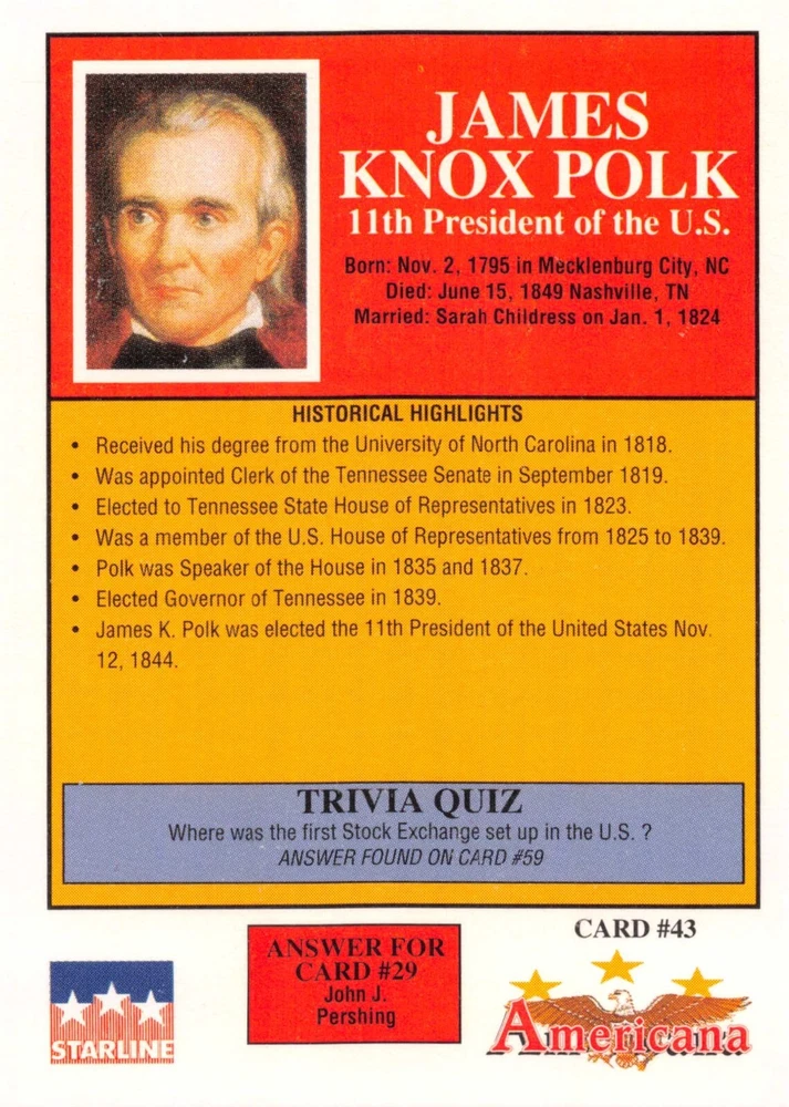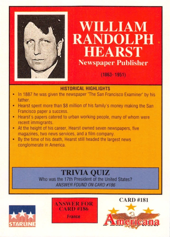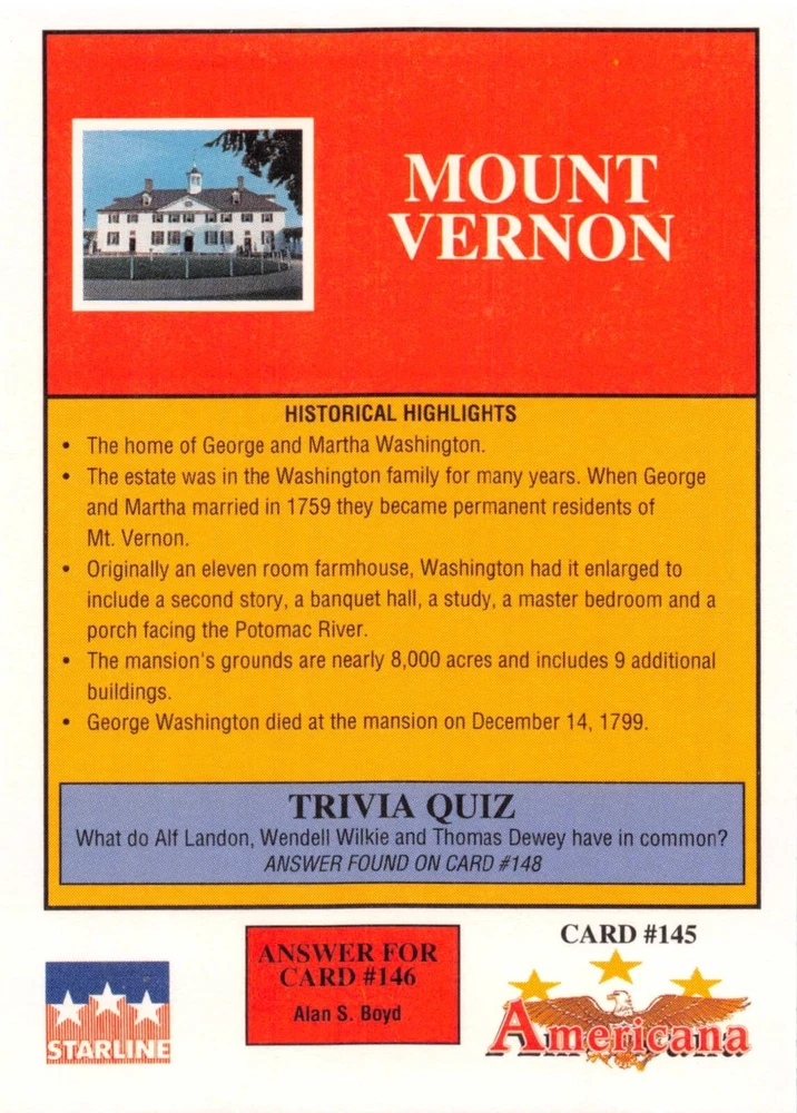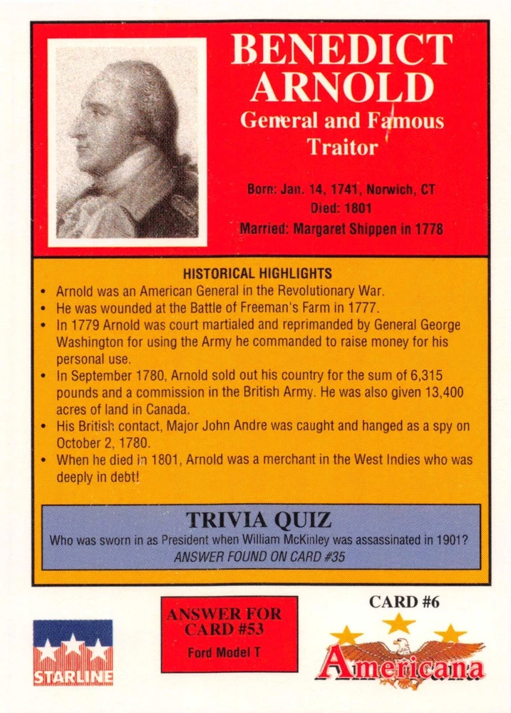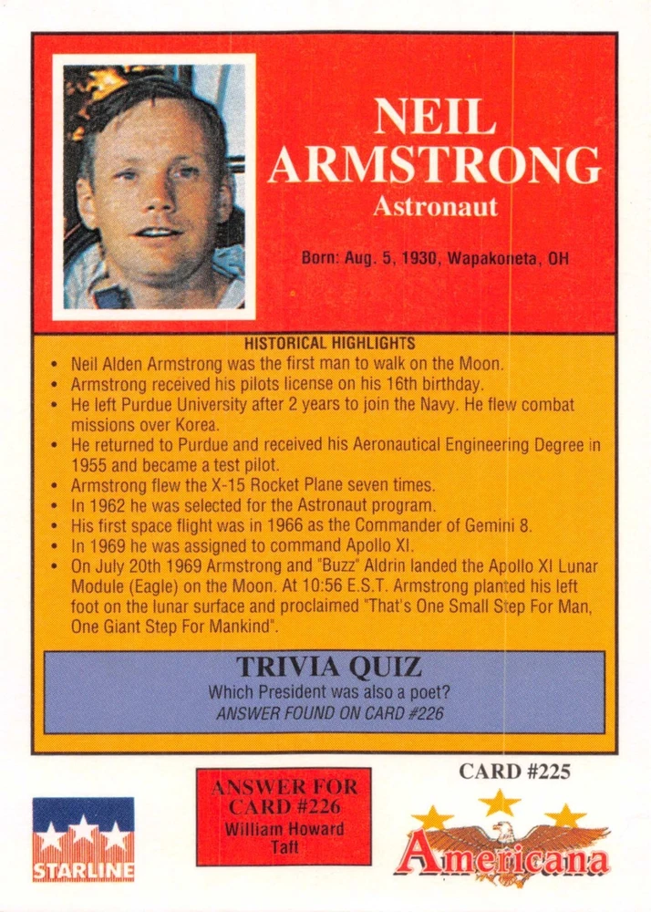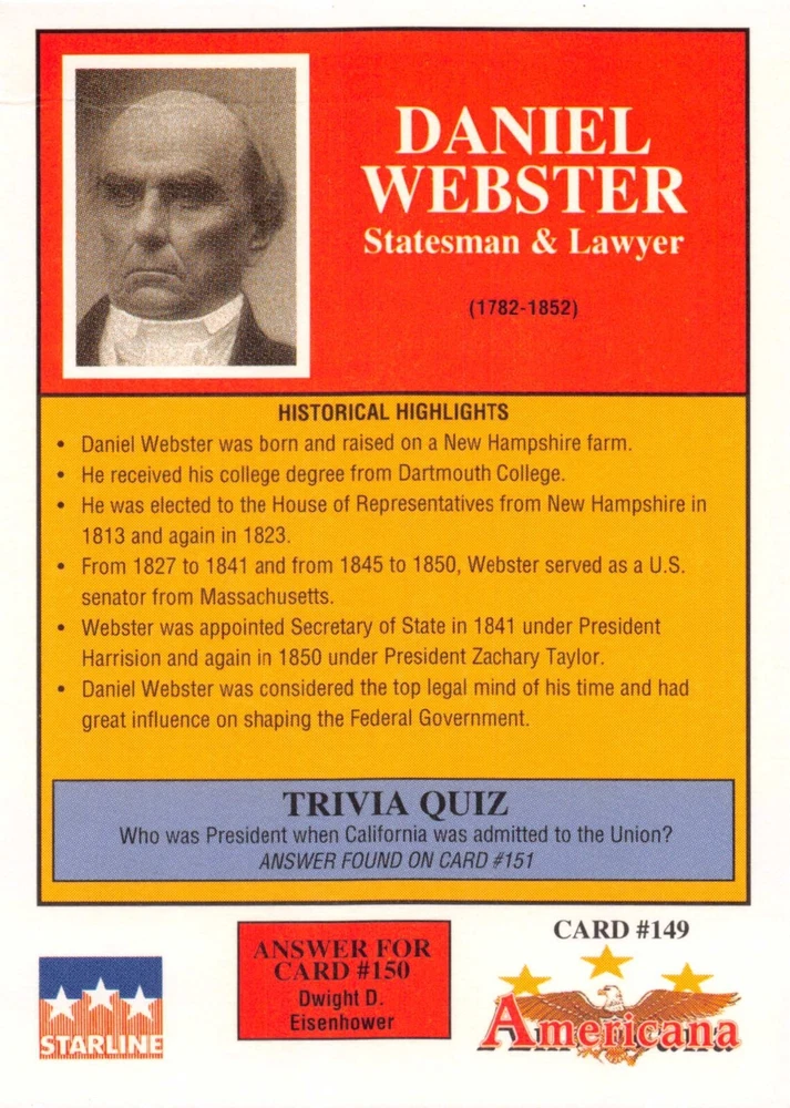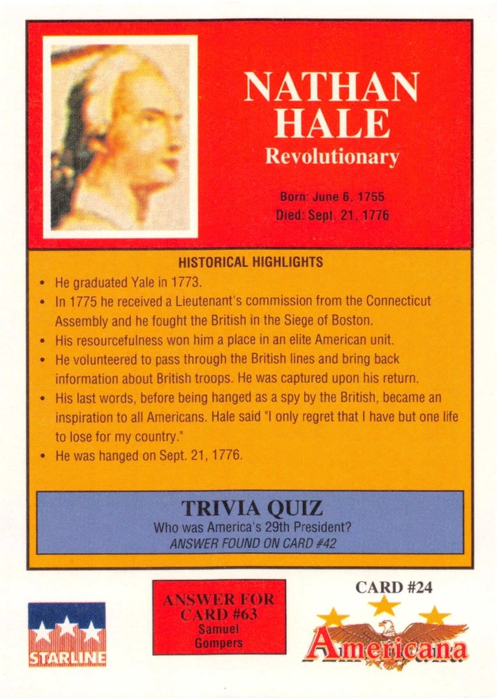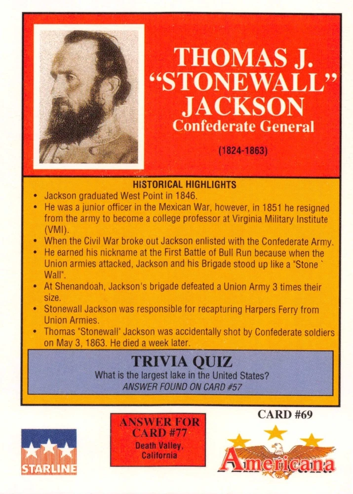 This listing is for your choice of any available 1991 Starline Americana Historic Trading Cards card from the drop-down menu above. Photos show front and backside of each card, be sure to scroll sideways to view front and backside photos! Any questions? Please ask before buying. International "USPS First Class Mail" will not include a tracking number for this item, if you would like a tracking number please choose the "eBay International Standard Shipping" option when you check out. As with all of my "pick-a-card" listings, I will be shipping with "eBay Standard Envelope". The rules of this envelope state that it cannot be too thick, so please expect your order to be packaged as follows: 1 to 6 cards will be slid into a single sleeve, the sleeve will then be slid inside of a semi-rigid Card-Saver. 7 to 12 cards will be slid into a double sleeve, 13 to 18 cards into a triple sleeve, 19 to 24 cards into a quadruple sleeve(up to six cards per sleeve). The double, triple and quadruple sleeve shipping will not have the Card-Saver. If you buy more than 1 card and want it packaged with more than 1 Card-Saver(or 1 sleeve per card), I kindly ask that you contact me before purchasing to be sure that this is possible to have it done with the stated shipping charge, or if additional shipping would be required. If you do not contact me, then you can expect to receive your order packaged as I have explained here. Please do not expect rigid top-loaders to be included, I don't normally keep a lot of them in stock, but if you message me prior to ordering I will be able to see if I have any that can be included with your order - additional shipping may be required. In order to get free combined shipping from this and any of my other "pick-a-card" listings, you must add all of your cards to the cart and check out when you are done shopping. If you do not use the cart you will be overpaying on shipping and I cannot refund you on over-payed shipping. So please use the cart and get your FREE COMBINED SHIPPING!