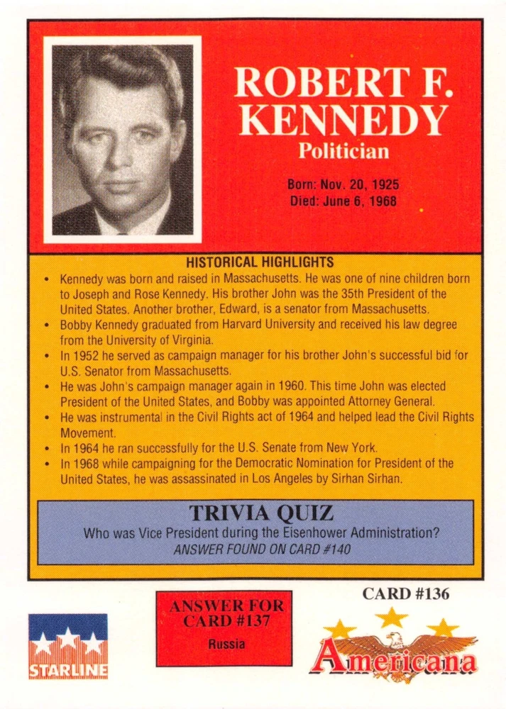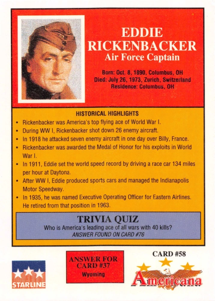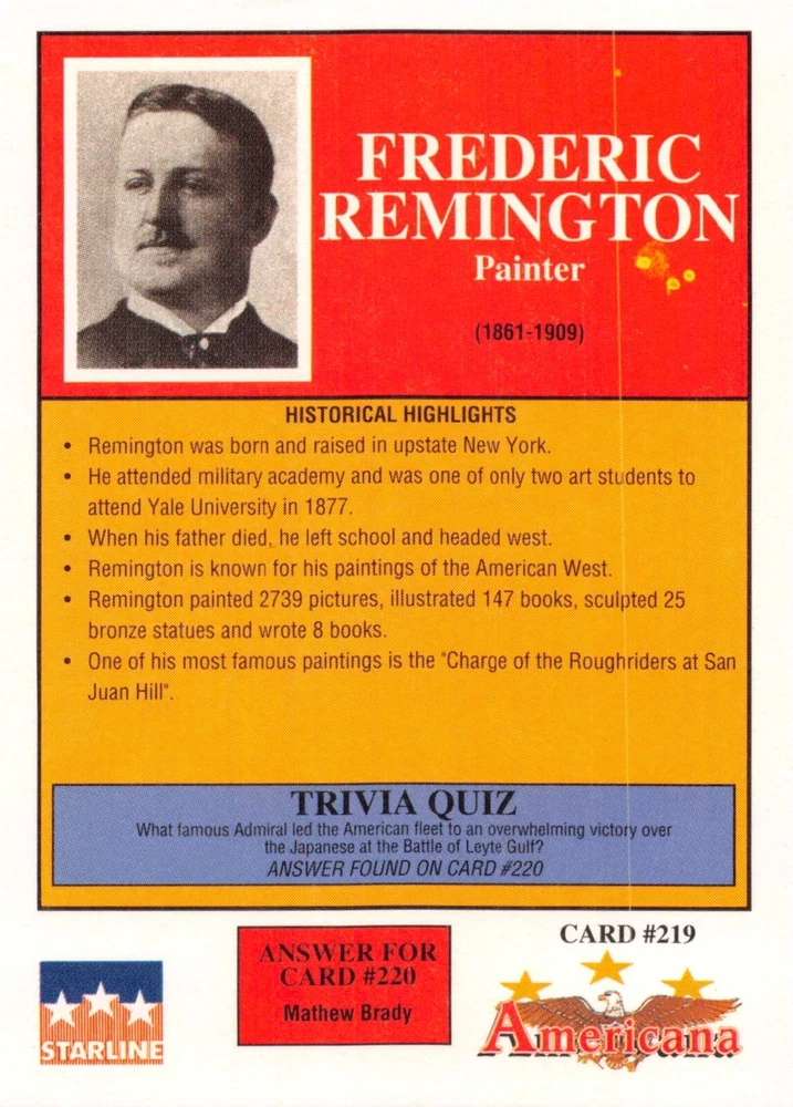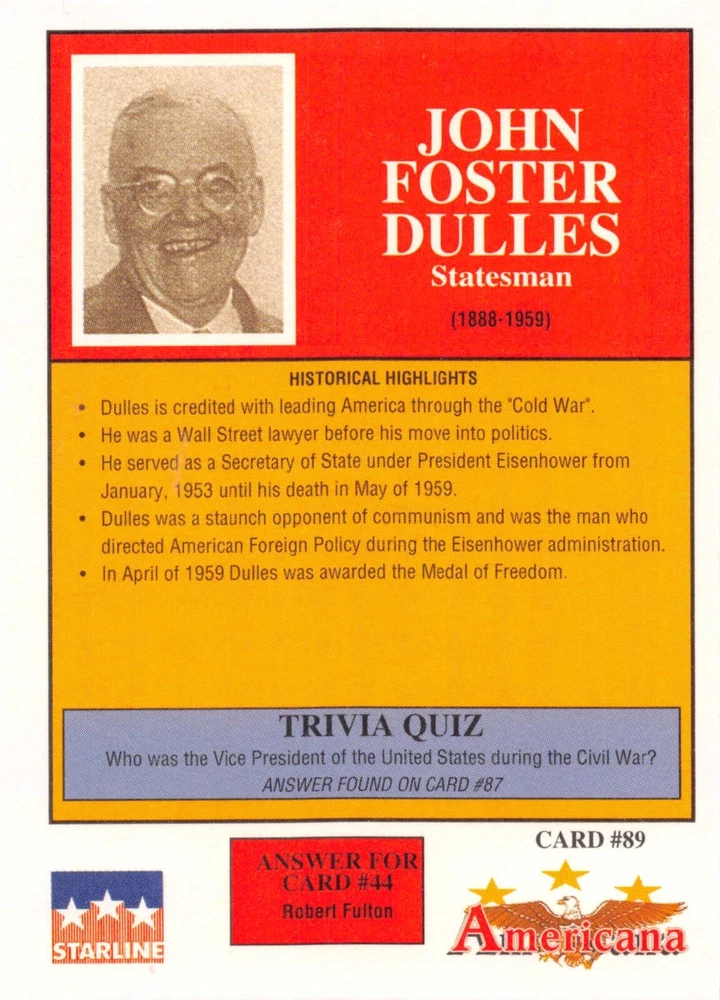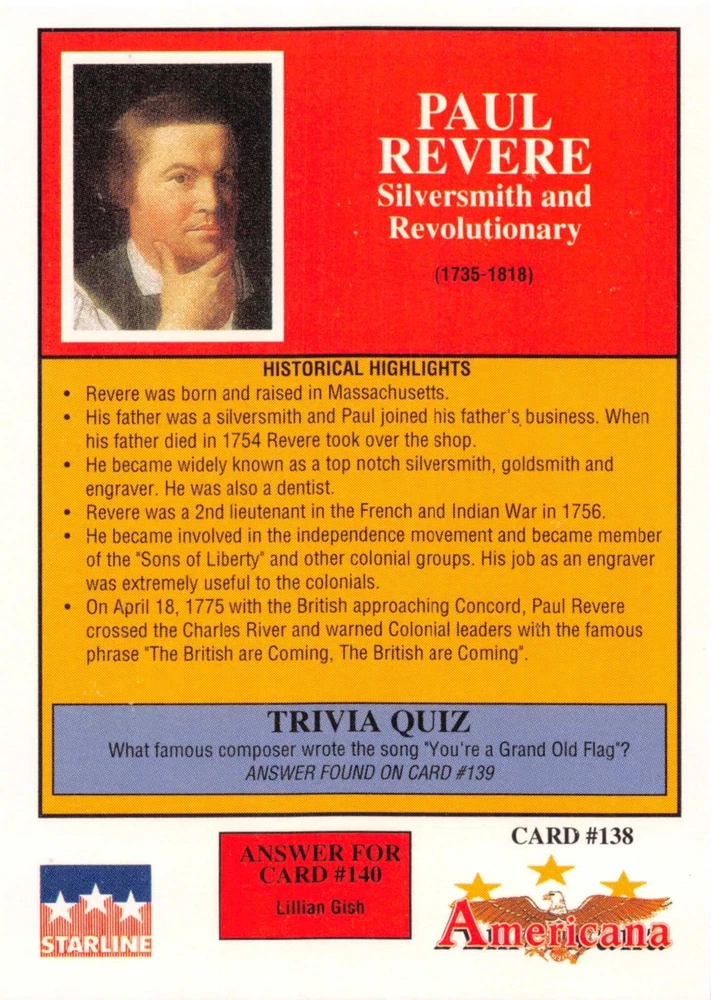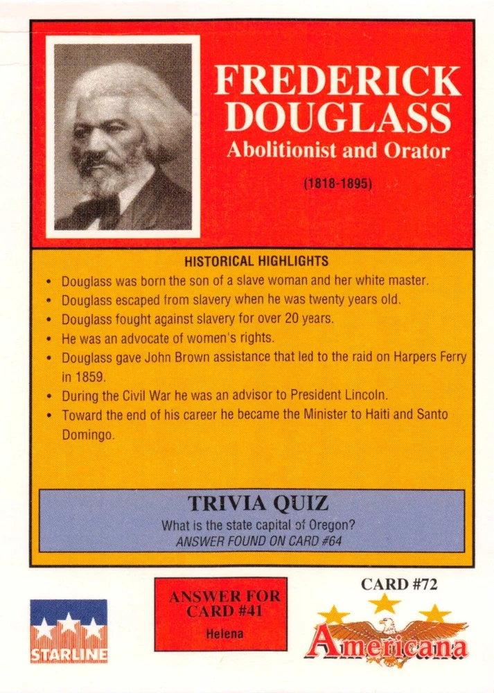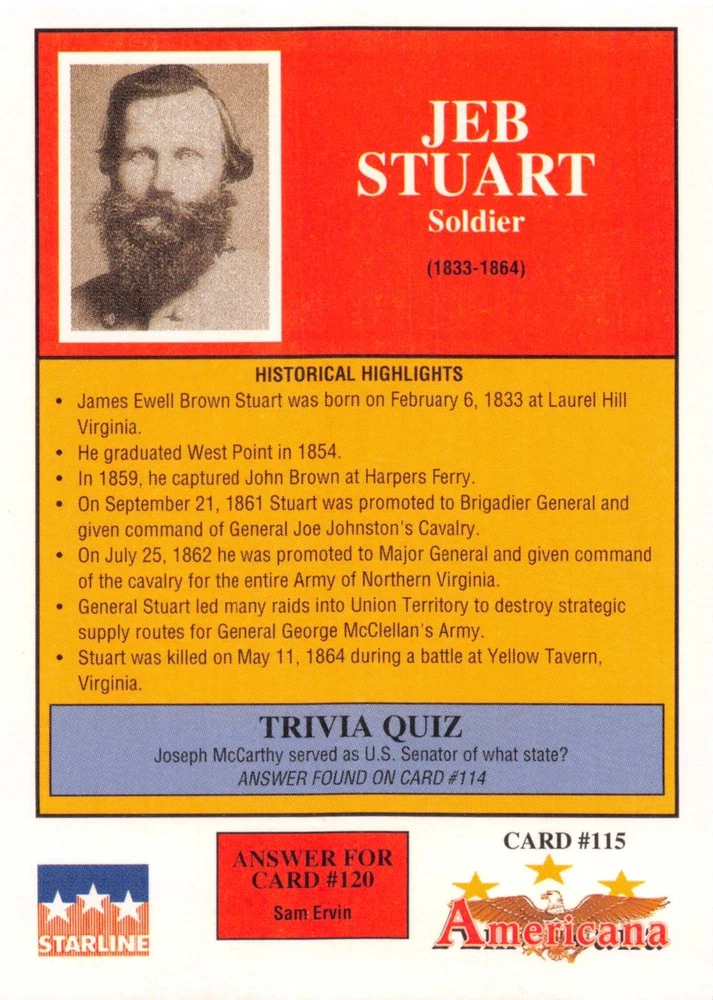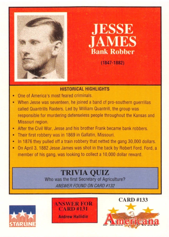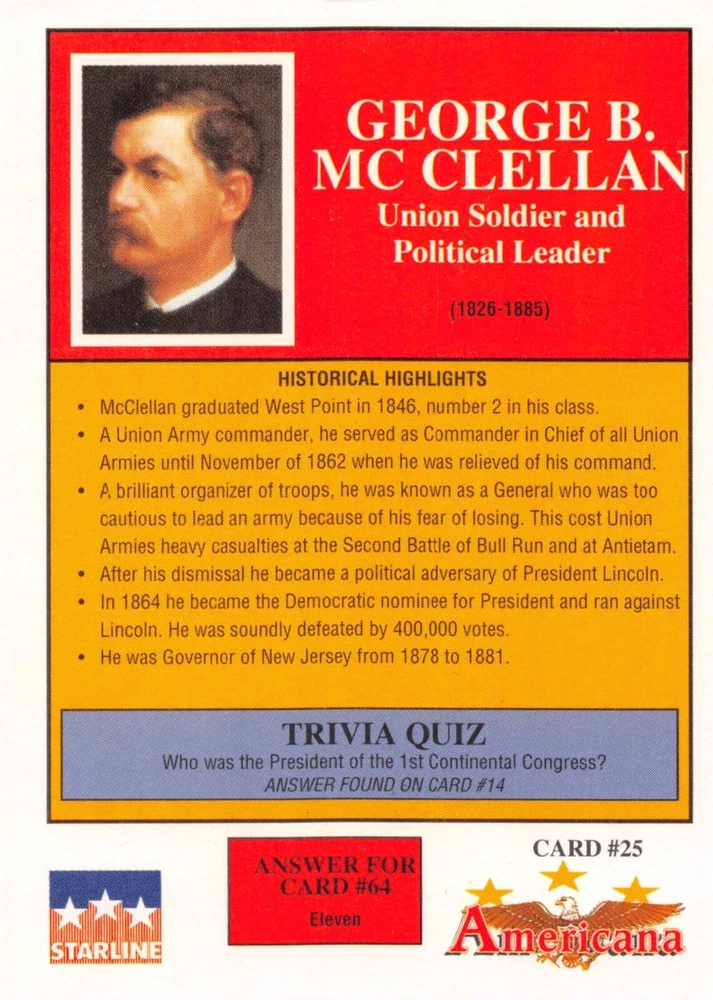 This listing is for your choice of any available 1991 Starline Americana Historic Trading Cards card from the drop-down menu above. Photos show front and backside of each card, be sure to scroll sideways to view front and backside photos! Any questions? Please ask before buying. International "USPS First Class Mail" will not include a tracking number for this item, if you would like a tracking number please choose the "eBay International Standard Shipping" option when you check out. As with all of my "pick-a-card" listings, I will be shipping with "eBay Standard Envelope". The rules of this envelope state that it cannot be too thick, so please expect your order to be packaged as follows: 1 to 6 cards will be slid into a single sleeve, the sleeve will then be slid inside of a semi-rigid Card-Saver. 7 to 12 cards will be slid into a double sleeve, 13 to 18 cards into a triple sleeve, 19 to 24 cards into a quadruple sleeve(up to six cards per sleeve). The double, triple and quadruple sleeve shipping will not have the Card-Saver. If you buy more than 1 card and want it packaged with more than 1 Card-Saver(or 1 sleeve per card), I kindly ask that you contact me before purchasing to be sure that this is possible to have it done with the stated shipping charge, or if additional shipping would be required. If you do not contact me, then you can expect to receive your order packaged as I have explained here. Please do not expect rigid top-loaders to be included, I don't normally keep a lot of them in stock, but if you message me prior to ordering I will be able to see if I have any that can be included with your order - additional shipping may be required. In order to get free combined shipping from this and any of my other "pick-a-card" listings, you must add all of your cards to the cart and check out when you are done shopping. If you do not use the cart you will be overpaying on shipping and I cannot refund you on over-payed shipping. So please use the cart and get your FREE COMBINED SHIPPING!
