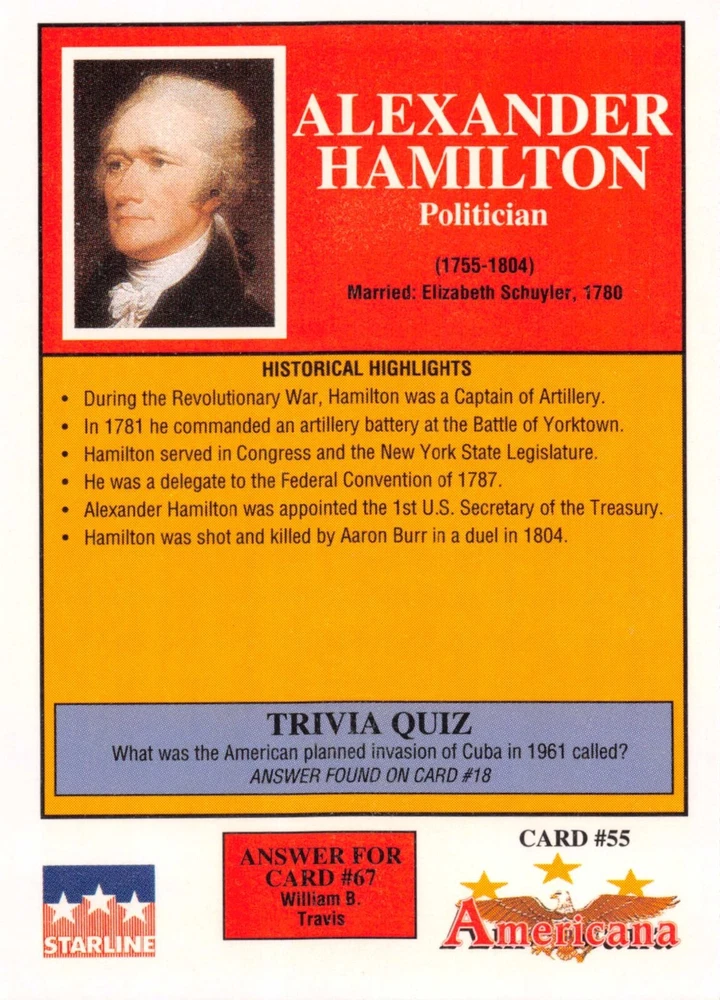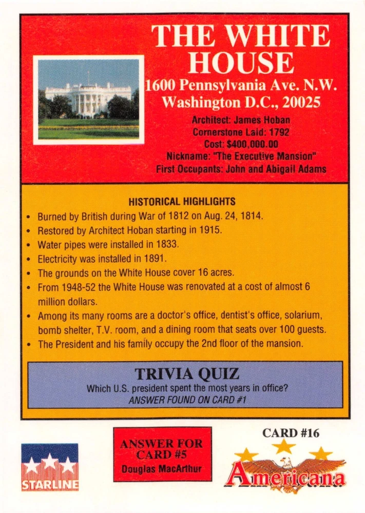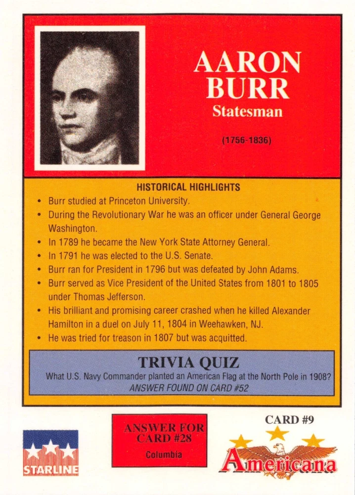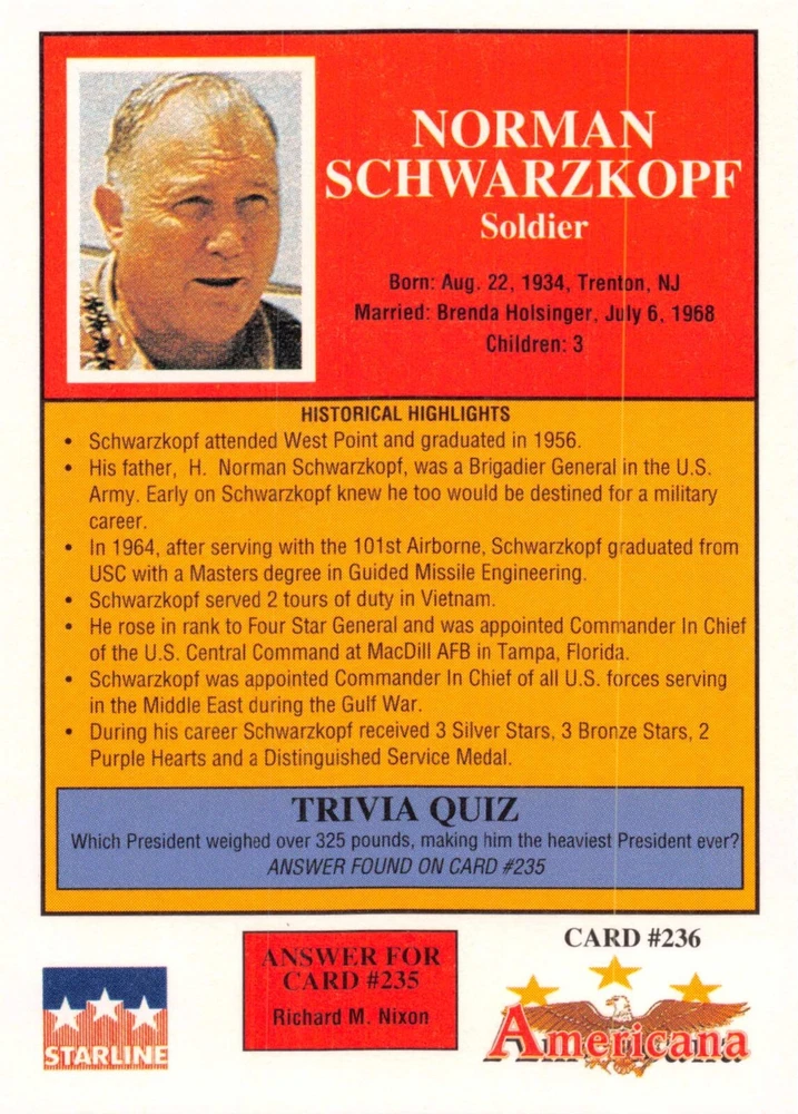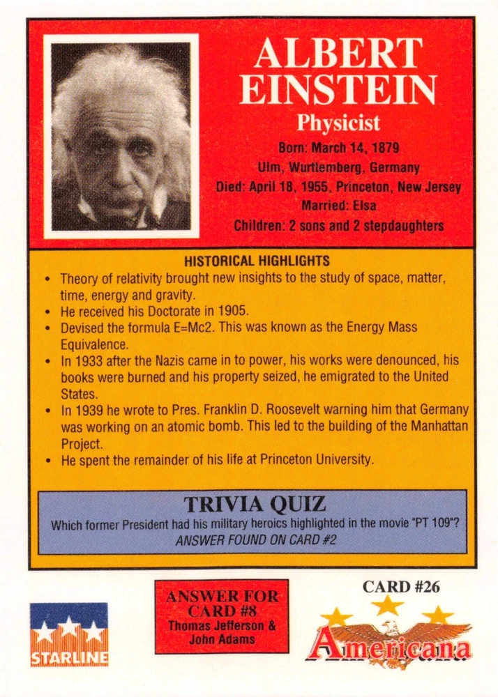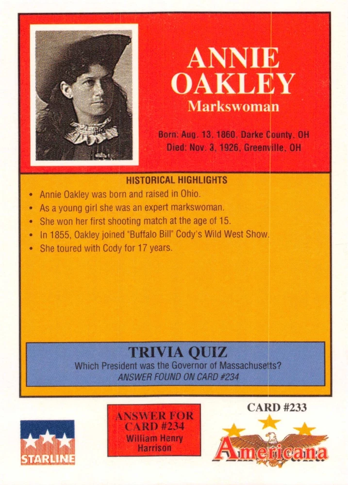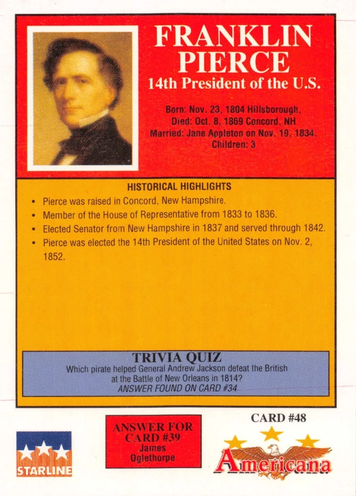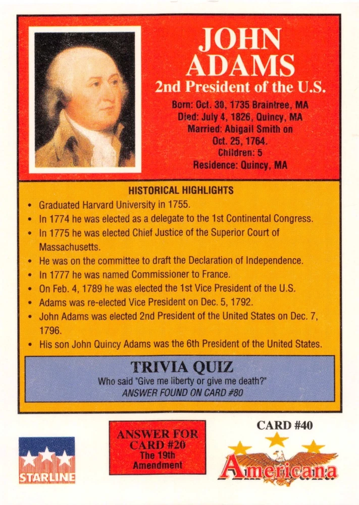 This listing is for your choice of any available 1991 Starline Americana Historic Trading Cards card from the drop-down menu above. Photos show front and backside of each card, be sure to scroll sideways to view front and backside photos! Any questions? Please ask before buying. International "USPS First Class Mail" will not include a tracking number for this item, if you would like a tracking number please choose the "eBay International Standard Shipping" option when you check out. As with all of my "pick-a-card" listings, I will be shipping with "eBay Standard Envelope". The rules of this envelope state that it cannot be too thick, so please expect your order to be packaged as follows: 1 to 6 cards will be slid into a single sleeve, the sleeve will then be slid inside of a semi-rigid Card-Saver. 7 to 12 cards will be slid into a double sleeve, 13 to 18 cards into a triple sleeve, 19 to 24 cards into a quadruple sleeve(up to six cards per sleeve). The double, triple and quadruple sleeve shipping will not have the Card-Saver. If you buy more than 1 card and want it packaged with more than 1 Card-Saver(or 1 sleeve per card), I kindly ask that you contact me before purchasing to be sure that this is possible to have it done with the stated shipping charge, or if additional shipping would be required. If you do not contact me, then you can expect to receive your order packaged as I have explained here. Please do not expect rigid top-loaders to be included, I don't normally keep a lot of them in stock, but if you message me prior to ordering I will be able to see if I have any that can be included with your order - additional shipping may be required. In order to get free combined shipping from this and any of my other "pick-a-card" listings, you must add all of your cards to the cart and check out when you are done shopping. If you do not use the cart you will be overpaying on shipping and I cannot refund you on over-payed shipping. So please use the cart and get your FREE COMBINED SHIPPING!
