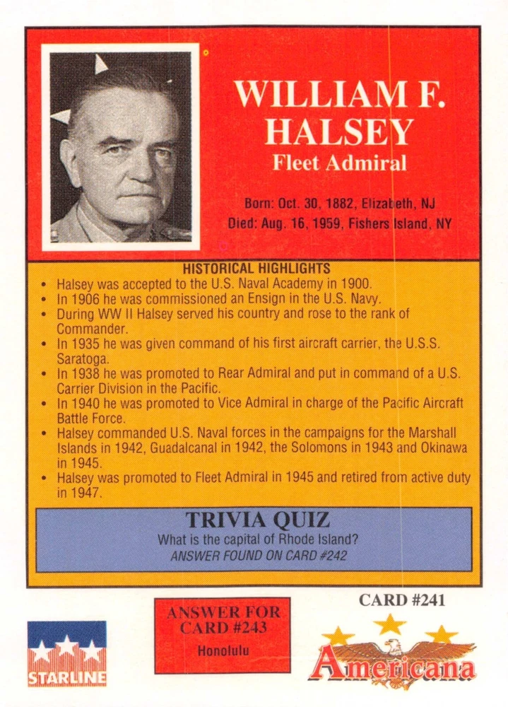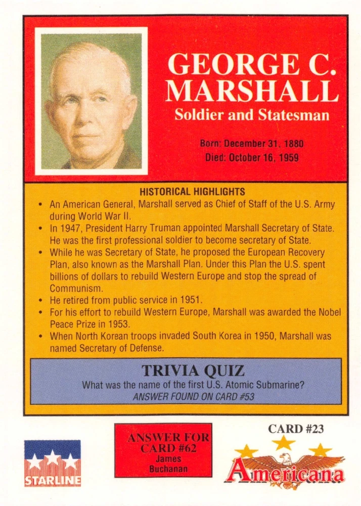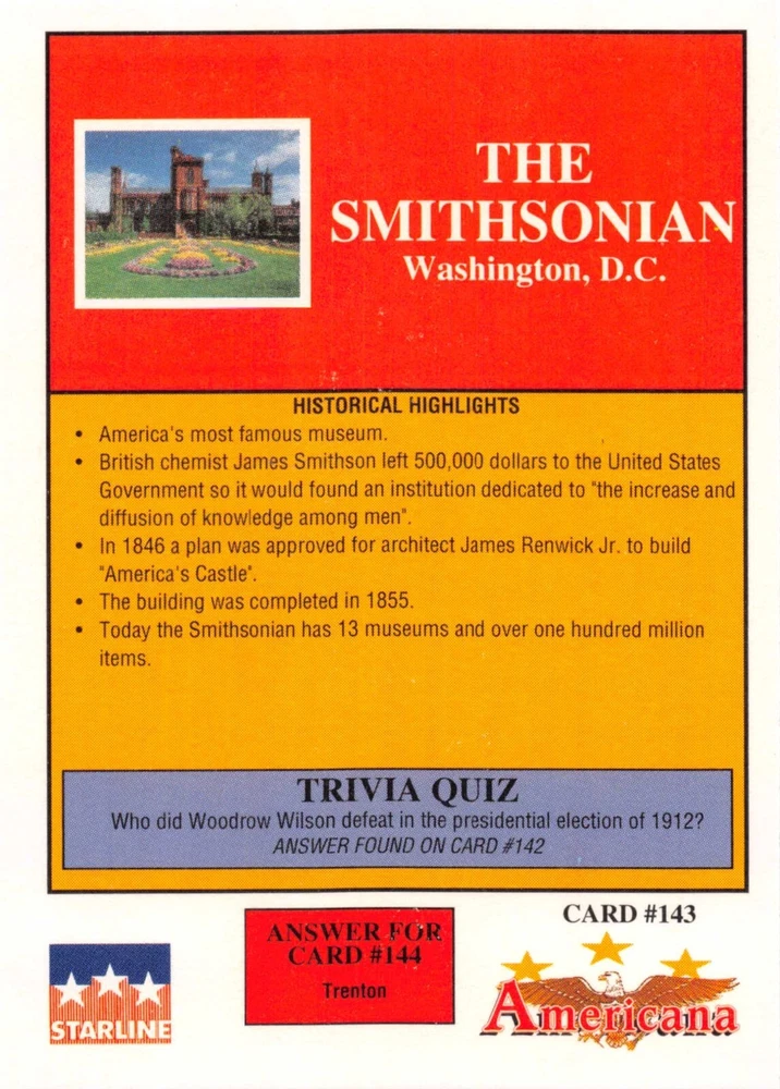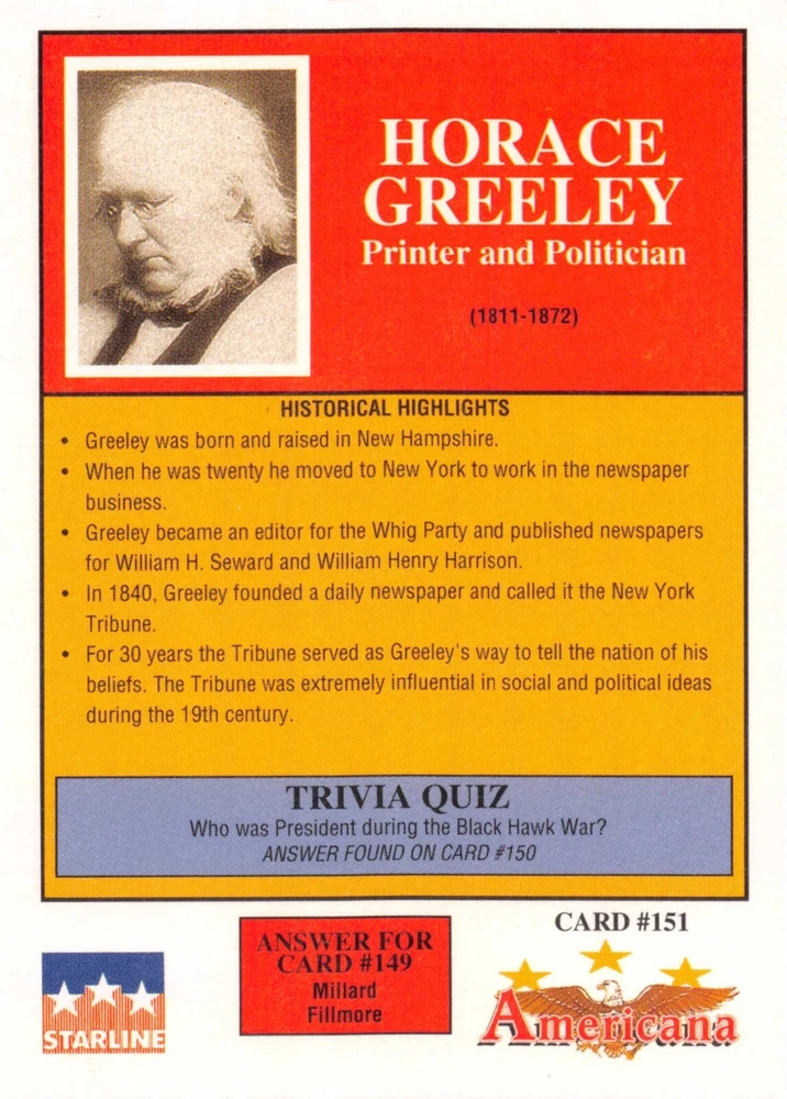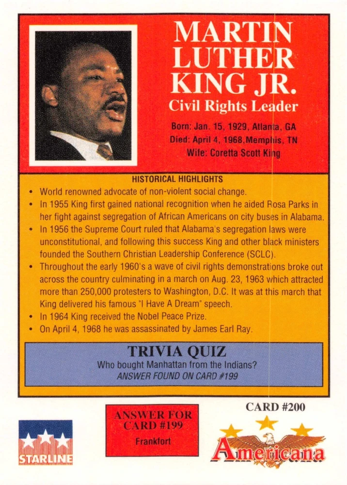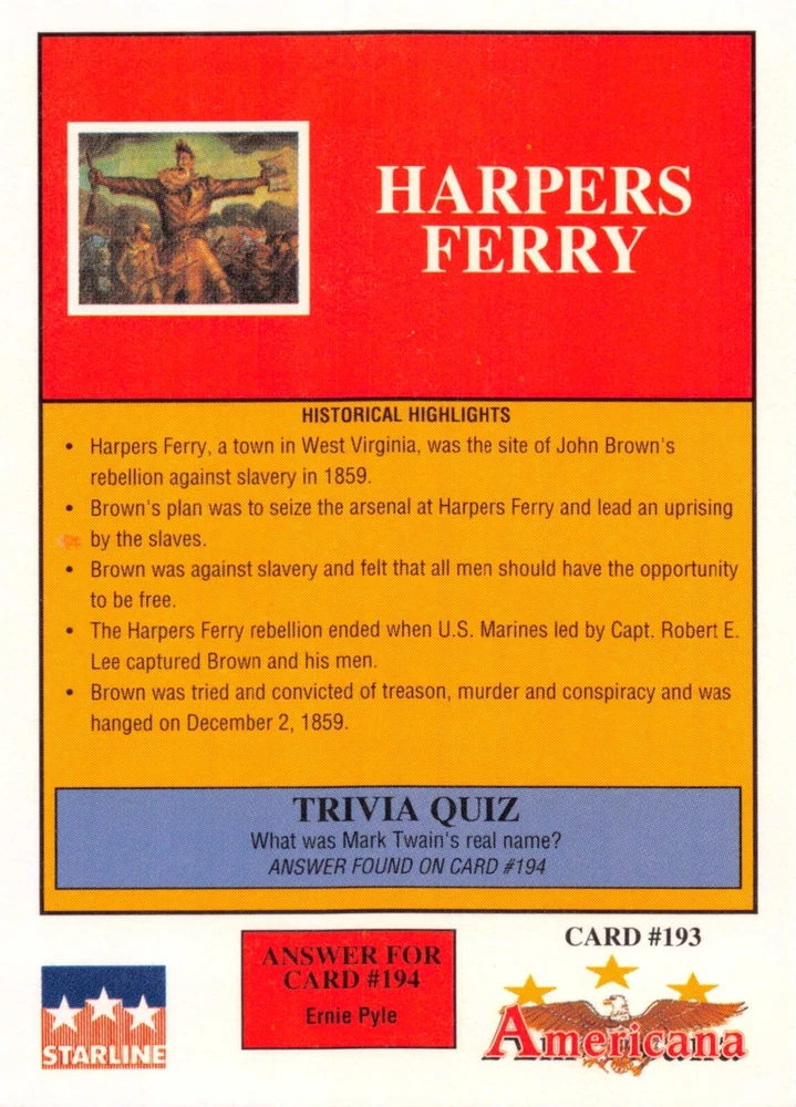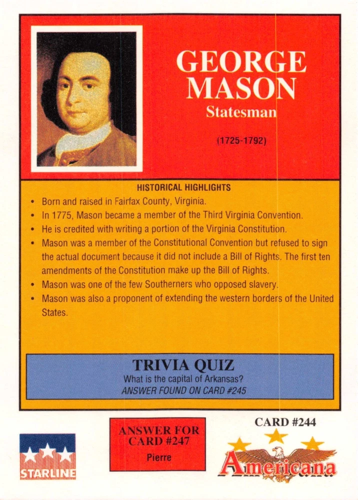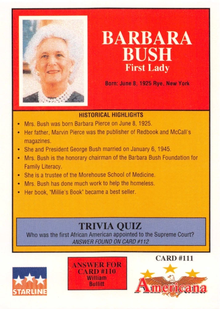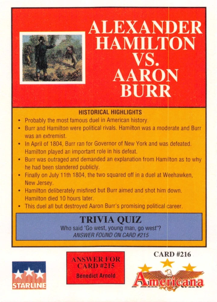 This listing is for your choice of any available 1991 Starline Americana Historic Trading Cards card from the drop-down menu above. Photos show front and backside of each card, be sure to scroll sideways to view front and backside photos! Any questions? Please ask before buying. International "USPS First Class Mail" will not include a tracking number for this item, if you would like a tracking number please choose the "eBay International Standard Shipping" option when you check out. As with all of my "pick-a-card" listings, I will be shipping with "eBay Standard Envelope". The rules of this envelope state that it cannot be too thick, so please expect your order to be packaged as follows: 1 to 6 cards will be slid into a single sleeve, the sleeve will then be slid inside of a semi-rigid Card-Saver. 7 to 12 cards will be slid into a double sleeve, 13 to 18 cards into a triple sleeve, 19 to 24 cards into a quadruple sleeve(up to six cards per sleeve). The double, triple and quadruple sleeve shipping will not have the Card-Saver. If you buy more than 1 card and want it packaged with more than 1 Card-Saver(or 1 sleeve per card), I kindly ask that you contact me before purchasing to be sure that this is possible to have it done with the stated shipping charge, or if additional shipping would be required. If you do not contact me, then you can expect to receive your order packaged as I have explained here. Please do not expect rigid top-loaders to be included, I don't normally keep a lot of them in stock, but if you message me prior to ordering I will be able to see if I have any that can be included with your order - additional shipping may be required. In order to get free combined shipping from this and any of my other "pick-a-card" listings, you must add all of your cards to the cart and check out when you are done shopping. If you do not use the cart you will be overpaying on shipping and I cannot refund you on over-payed shipping. So please use the cart and get your FREE COMBINED SHIPPING!