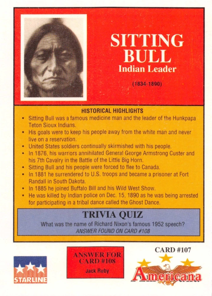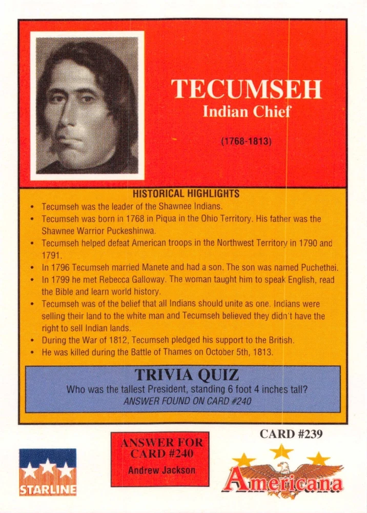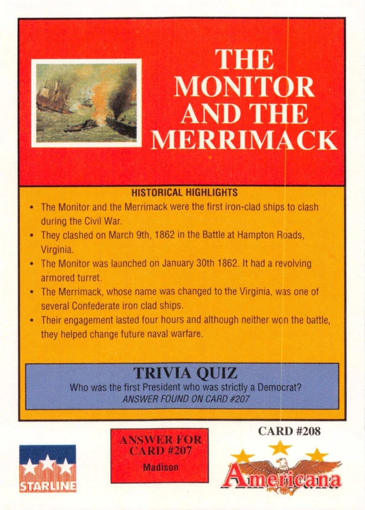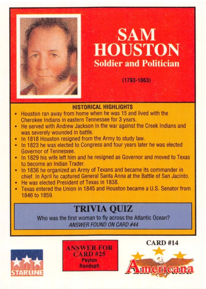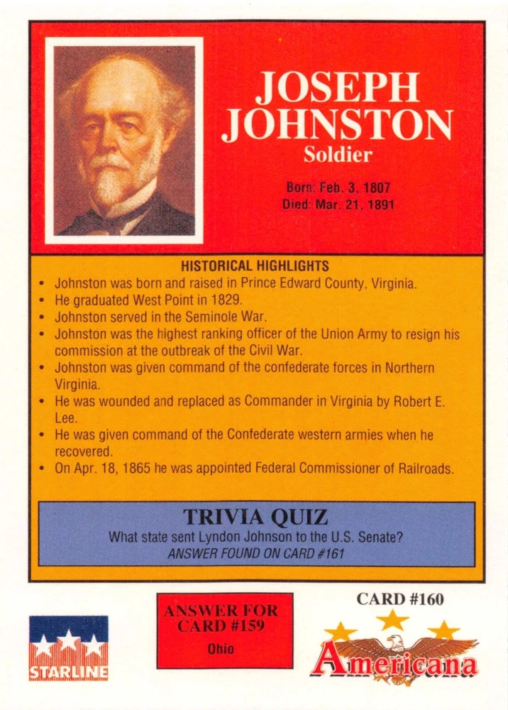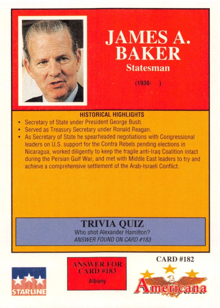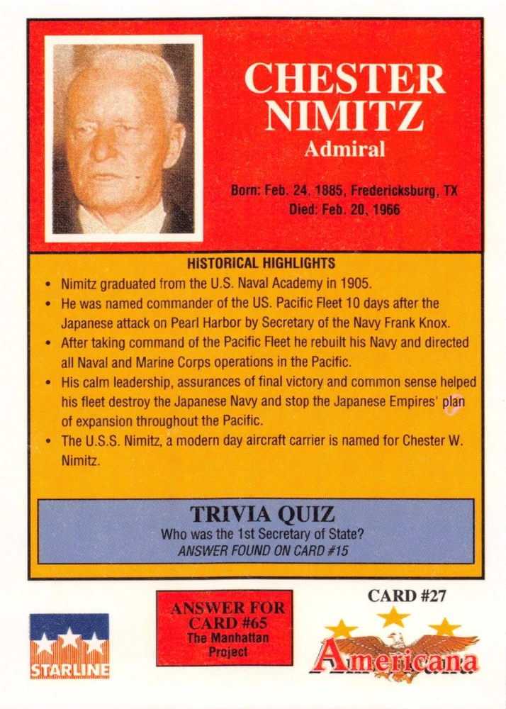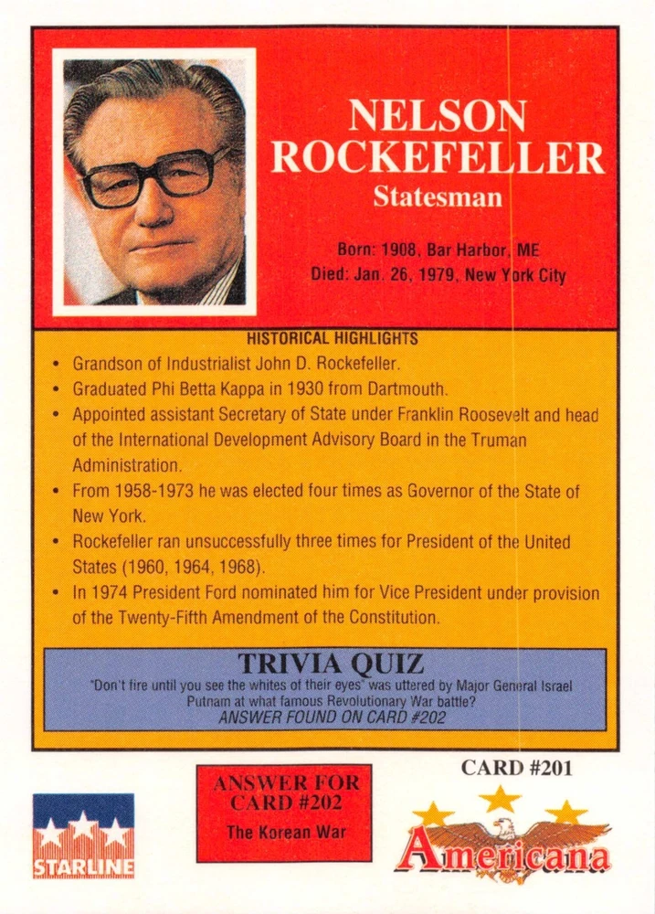 This listing is for your choice of any available 1991 Starline Americana Historic Trading Cards card from the drop-down menu above. Photos show front and backside of each card, be sure to scroll sideways to view front and backside photos! Any questions? Please ask before buying. International "USPS First Class Mail" will not include a tracking number for this item, if you would like a tracking number please choose the "eBay International Standard Shipping" option when you check out. As with all of my "pick-a-card" listings, I will be shipping with "eBay Standard Envelope". The rules of this envelope state that it cannot be too thick, so please expect your order to be packaged as follows: 1 to 6 cards will be slid into a single sleeve, the sleeve will then be slid inside of a semi-rigid Card-Saver. 7 to 12 cards will be slid into a double sleeve, 13 to 18 cards into a triple sleeve, 19 to 24 cards into a quadruple sleeve(up to six cards per sleeve). The double, triple and quadruple sleeve shipping will not have the Card-Saver. If you buy more than 1 card and want it packaged with more than 1 Card-Saver(or 1 sleeve per card), I kindly ask that you contact me before purchasing to be sure that this is possible to have it done with the stated shipping charge, or if additional shipping would be required. If you do not contact me, then you can expect to receive your order packaged as I have explained here. Please do not expect rigid top-loaders to be included, I don't normally keep a lot of them in stock, but if you message me prior to ordering I will be able to see if I have any that can be included with your order - additional shipping may be required. In order to get free combined shipping from this and any of my other "pick-a-card" listings, you must add all of your cards to the cart and check out when you are done shopping. If you do not use the cart you will be overpaying on shipping and I cannot refund you on over-payed shipping. So please use the cart and get your FREE COMBINED SHIPPING!