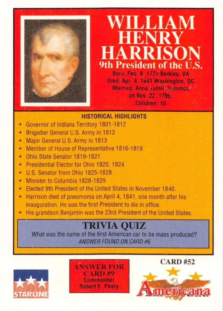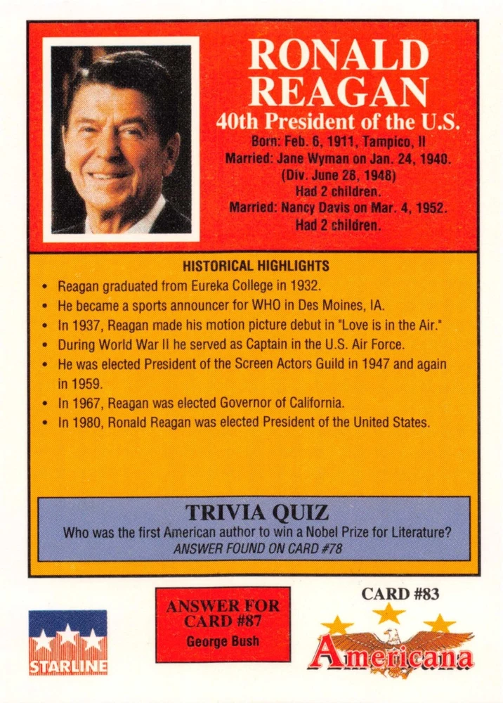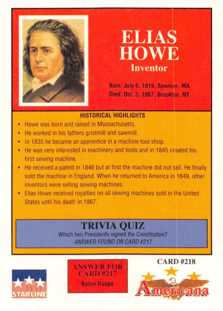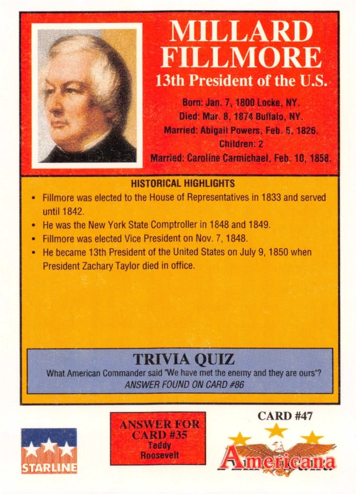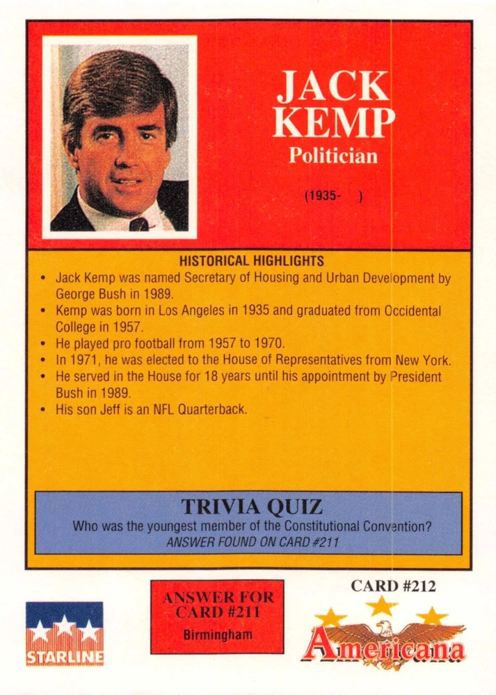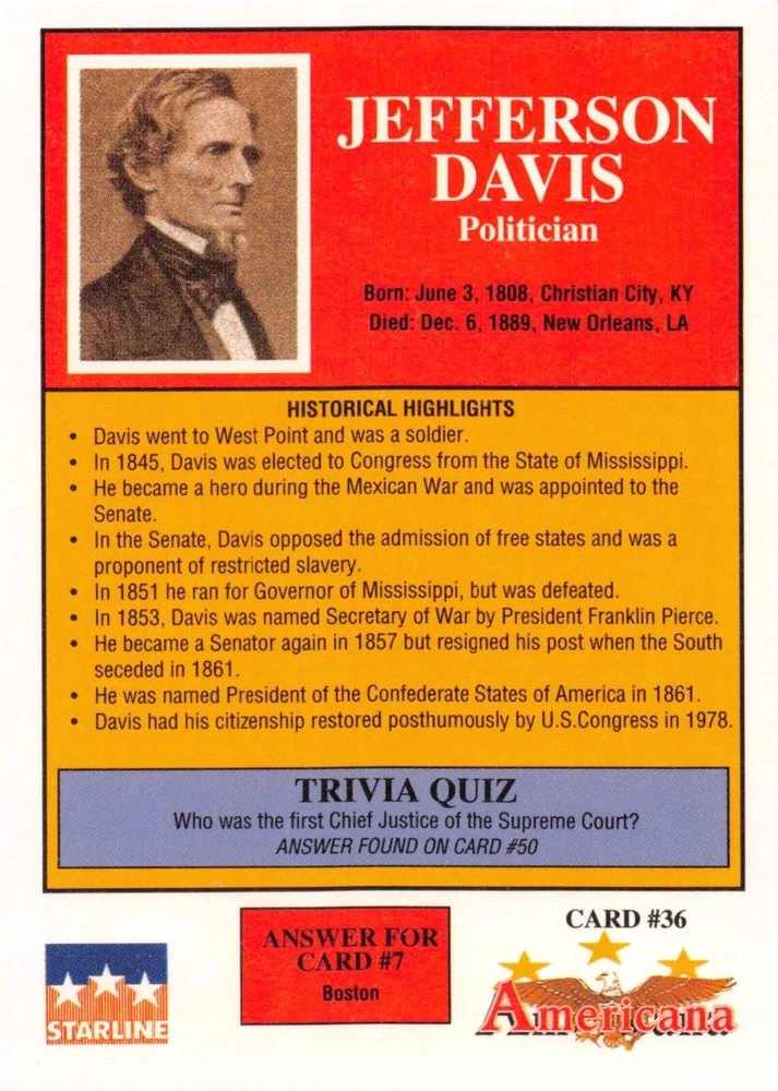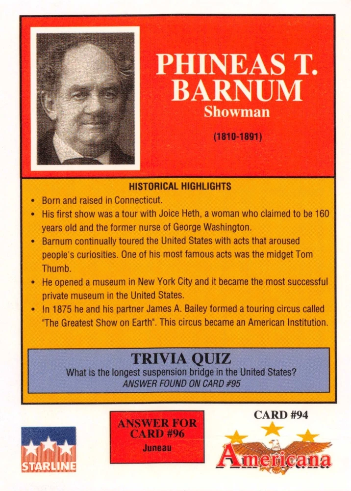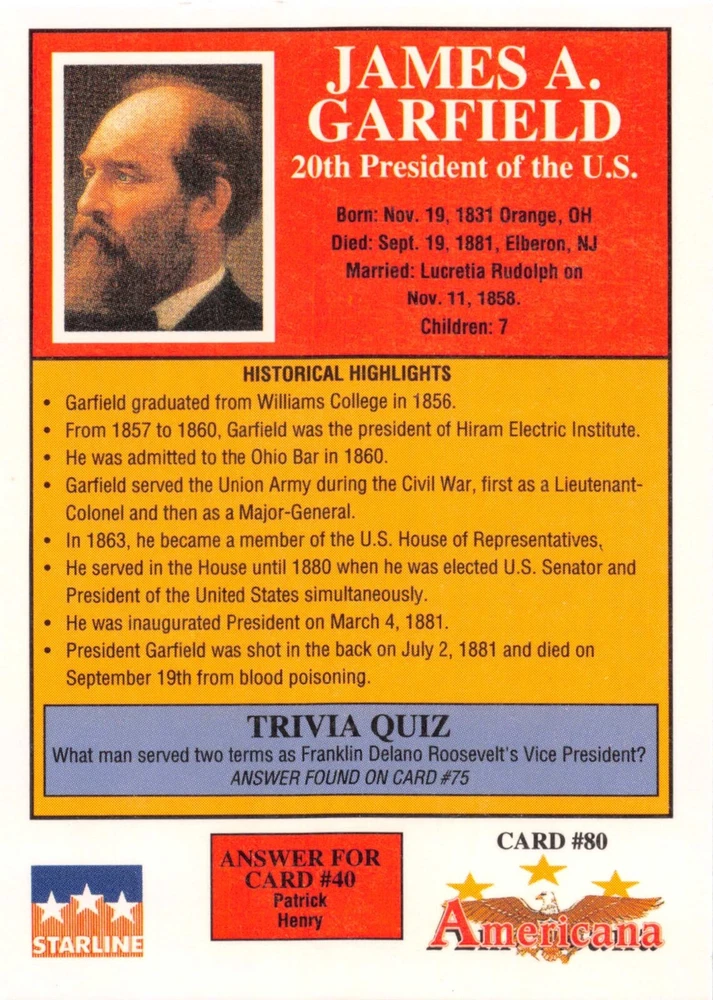 This listing is for your choice of any available 1991 Starline Americana Historic Trading Cards card from the drop-down menu above. Photos show front and backside of each card, be sure to scroll sideways to view front and backside photos! Any questions? Please ask before buying. International "USPS First Class Mail" will not include a tracking number for this item, if you would like a tracking number please choose the "eBay International Standard Shipping" option when you check out. As with all of my "pick-a-card" listings, I will be shipping with "eBay Standard Envelope". The rules of this envelope state that it cannot be too thick, so please expect your order to be packaged as follows: 1 to 6 cards will be slid into a single sleeve, the sleeve will then be slid inside of a semi-rigid Card-Saver. 7 to 12 cards will be slid into a double sleeve, 13 to 18 cards into a triple sleeve, 19 to 24 cards into a quadruple sleeve(up to six cards per sleeve). The double, triple and quadruple sleeve shipping will not have the Card-Saver. If you buy more than 1 card and want it packaged with more than 1 Card-Saver(or 1 sleeve per card), I kindly ask that you contact me before purchasing to be sure that this is possible to have it done with the stated shipping charge, or if additional shipping would be required. If you do not contact me, then you can expect to receive your order packaged as I have explained here. Please do not expect rigid top-loaders to be included, I don't normally keep a lot of them in stock, but if you message me prior to ordering I will be able to see if I have any that can be included with your order - additional shipping may be required. In order to get free combined shipping from this and any of my other "pick-a-card" listings, you must add all of your cards to the cart and check out when you are done shopping. If you do not use the cart you will be overpaying on shipping and I cannot refund you on over-payed shipping. So please use the cart and get your FREE COMBINED SHIPPING!