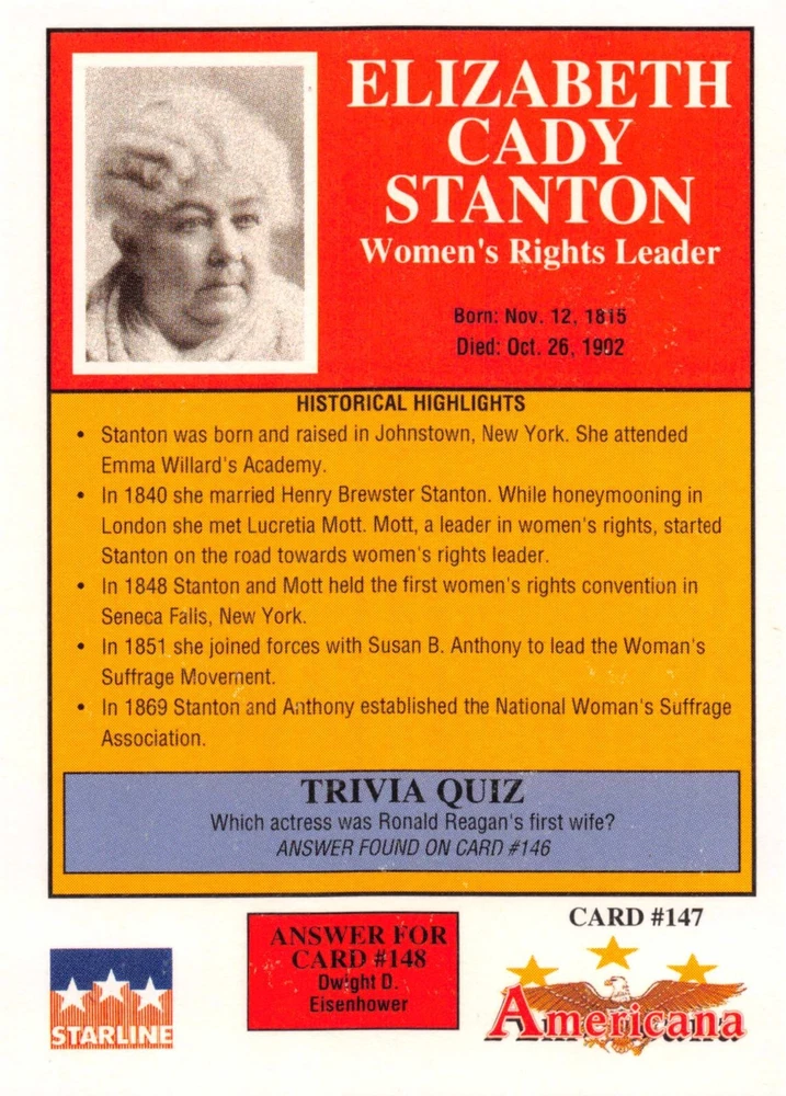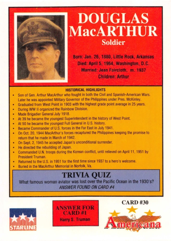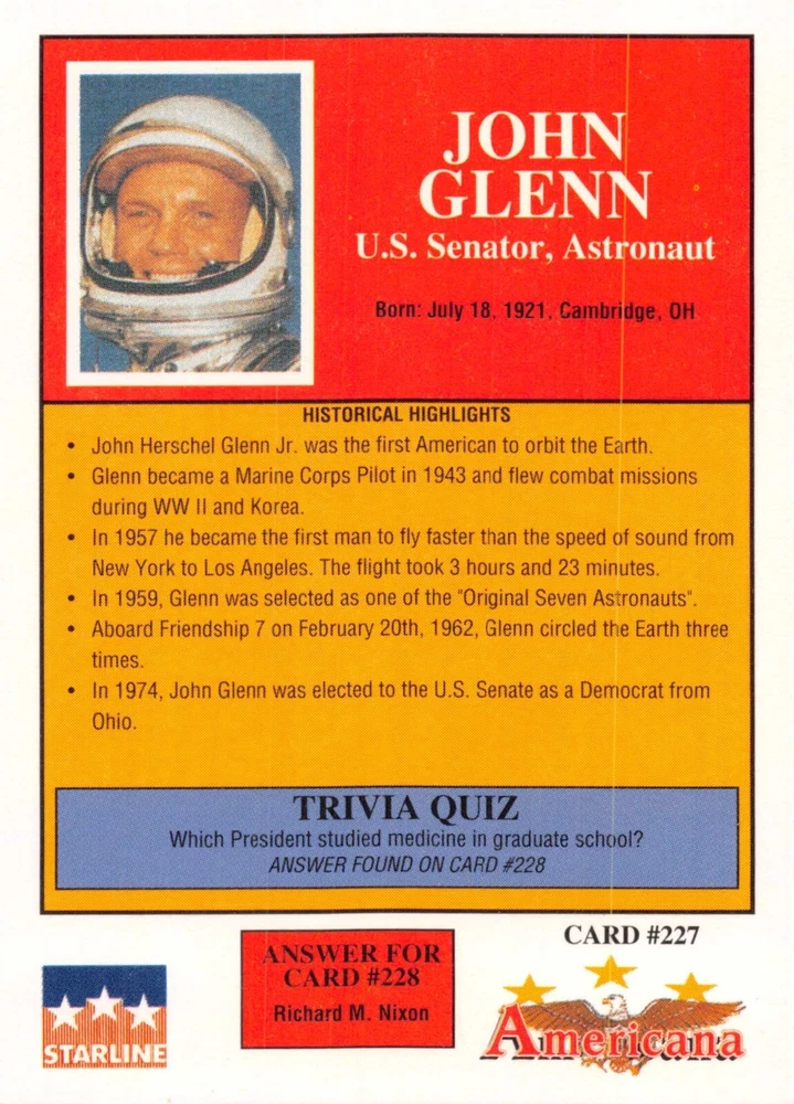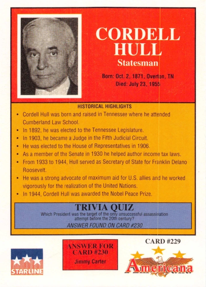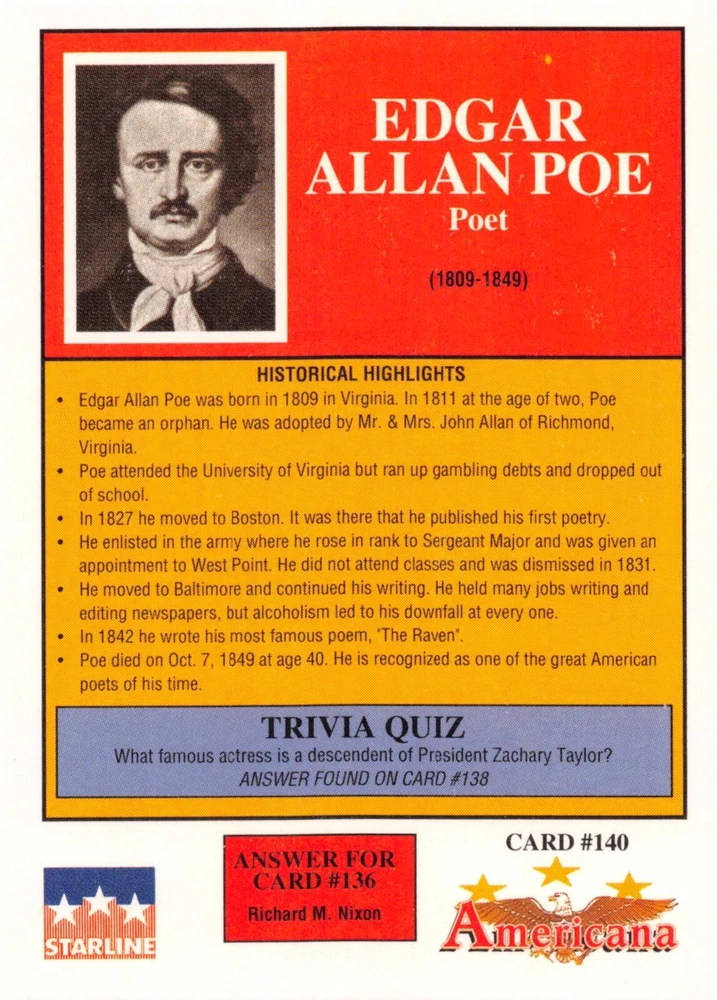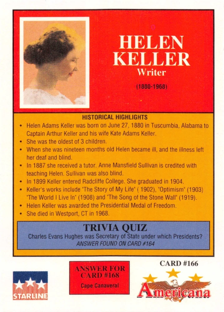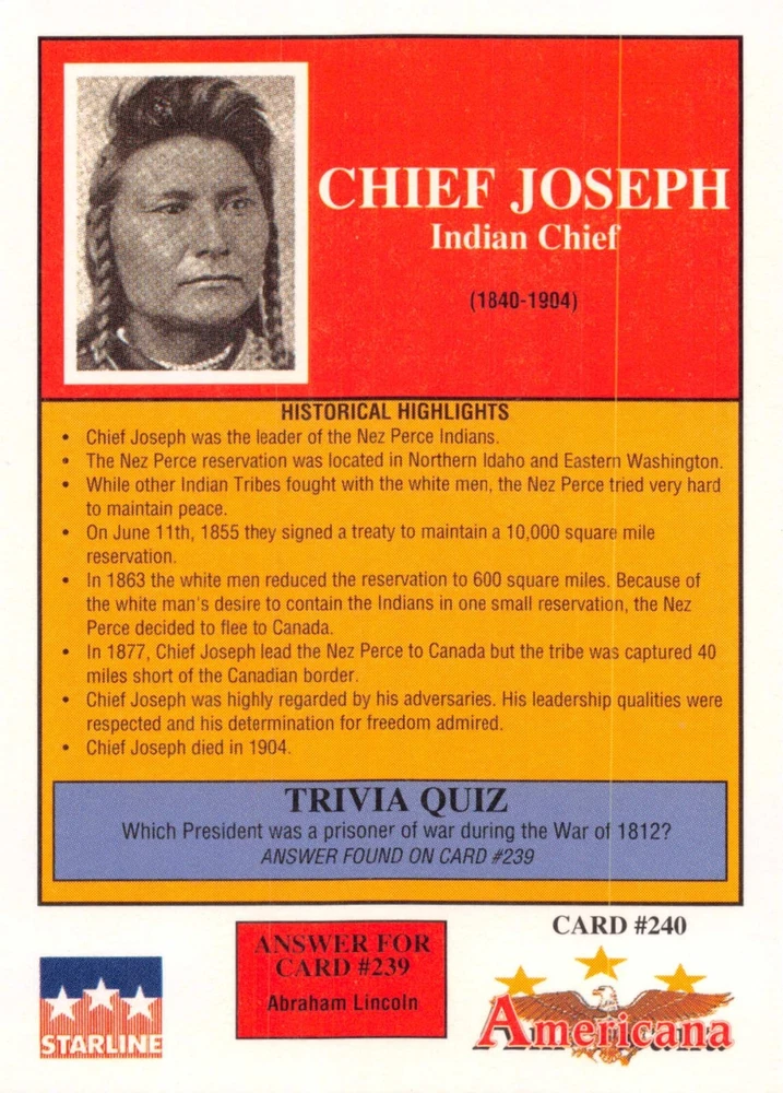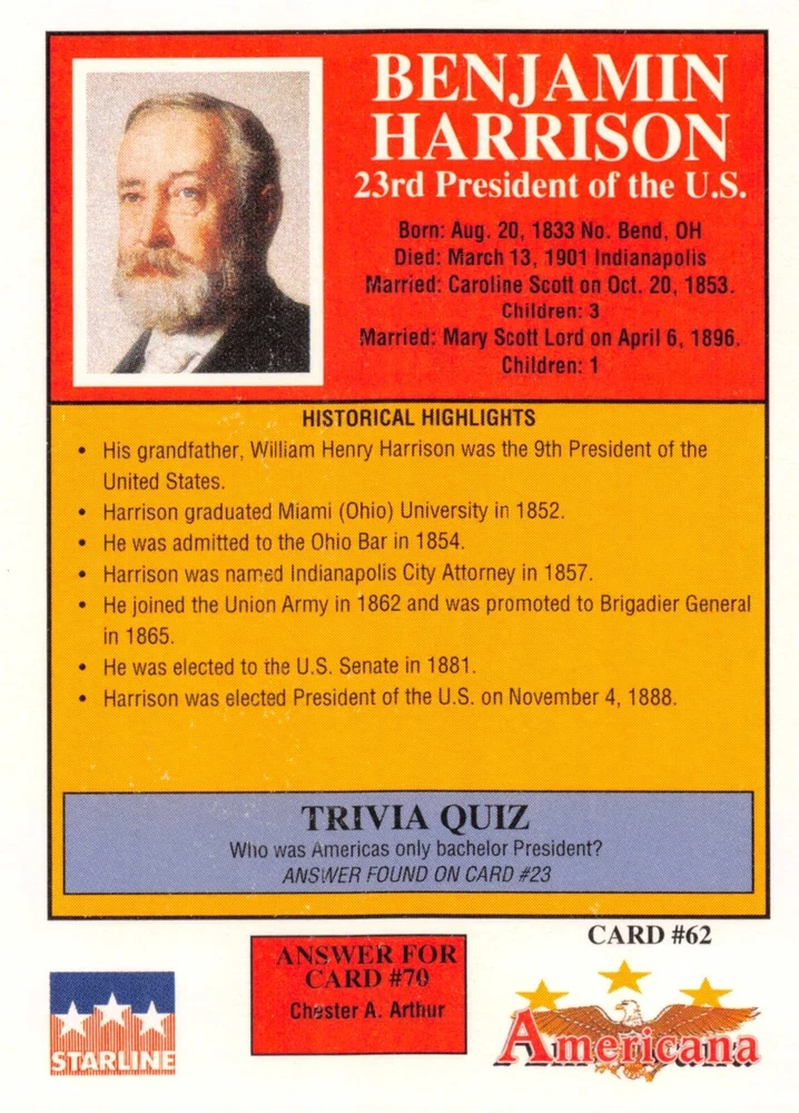 This listing is for your choice of any available 1991 Starline Americana Historic Trading Cards card from the drop-down menu above. Photos show front and backside of each card, be sure to scroll sideways to view front and backside photos! Any questions? Please ask before buying. International "USPS First Class Mail" will not include a tracking number for this item, if you would like a tracking number please choose the "eBay International Standard Shipping" option when you check out. As with all of my "pick-a-card" listings, I will be shipping with "eBay Standard Envelope". The rules of this envelope state that it cannot be too thick, so please expect your order to be packaged as follows: 1 to 6 cards will be slid into a single sleeve, the sleeve will then be slid inside of a semi-rigid Card-Saver. 7 to 12 cards will be slid into a double sleeve, 13 to 18 cards into a triple sleeve, 19 to 24 cards into a quadruple sleeve(up to six cards per sleeve). The double, triple and quadruple sleeve shipping will not have the Card-Saver. If you buy more than 1 card and want it packaged with more than 1 Card-Saver(or 1 sleeve per card), I kindly ask that you contact me before purchasing to be sure that this is possible to have it done with the stated shipping charge, or if additional shipping would be required. If you do not contact me, then you can expect to receive your order packaged as I have explained here. Please do not expect rigid top-loaders to be included, I don't normally keep a lot of them in stock, but if you message me prior to ordering I will be able to see if I have any that can be included with your order - additional shipping may be required. In order to get free combined shipping from this and any of my other "pick-a-card" listings, you must add all of your cards to the cart and check out when you are done shopping. If you do not use the cart you will be overpaying on shipping and I cannot refund you on over-payed shipping. So please use the cart and get your FREE COMBINED SHIPPING!