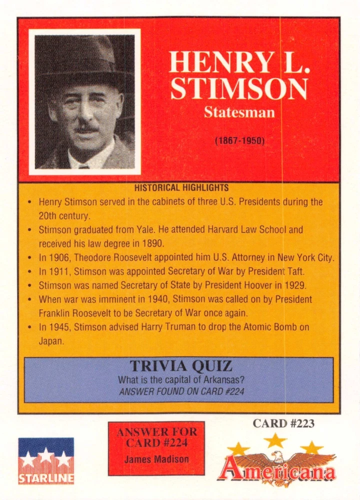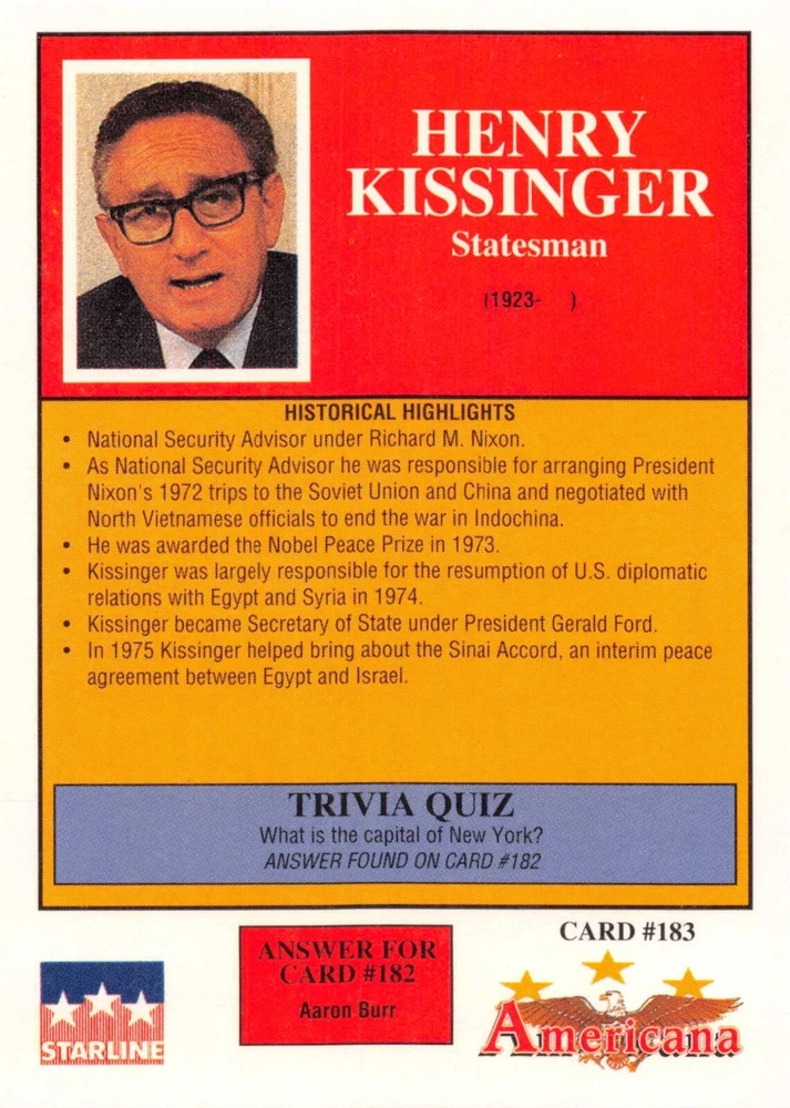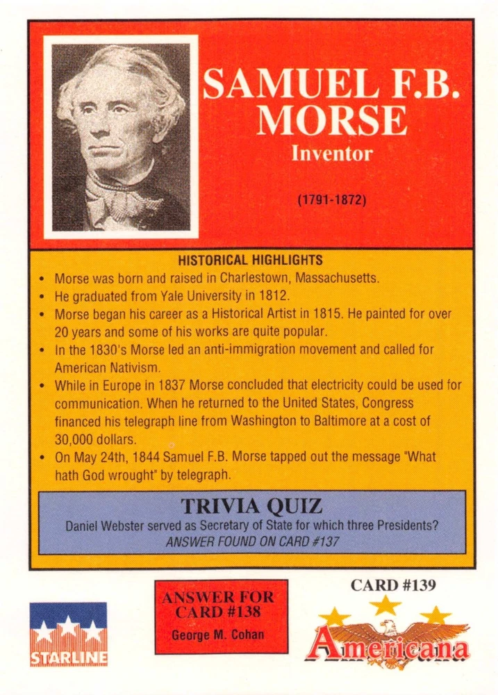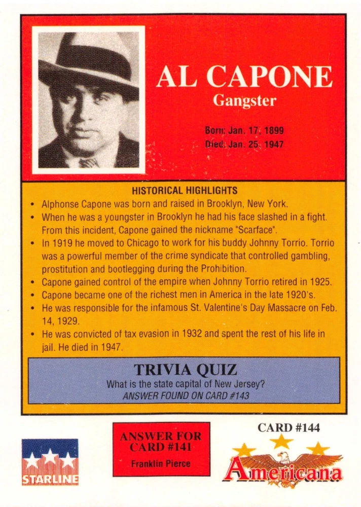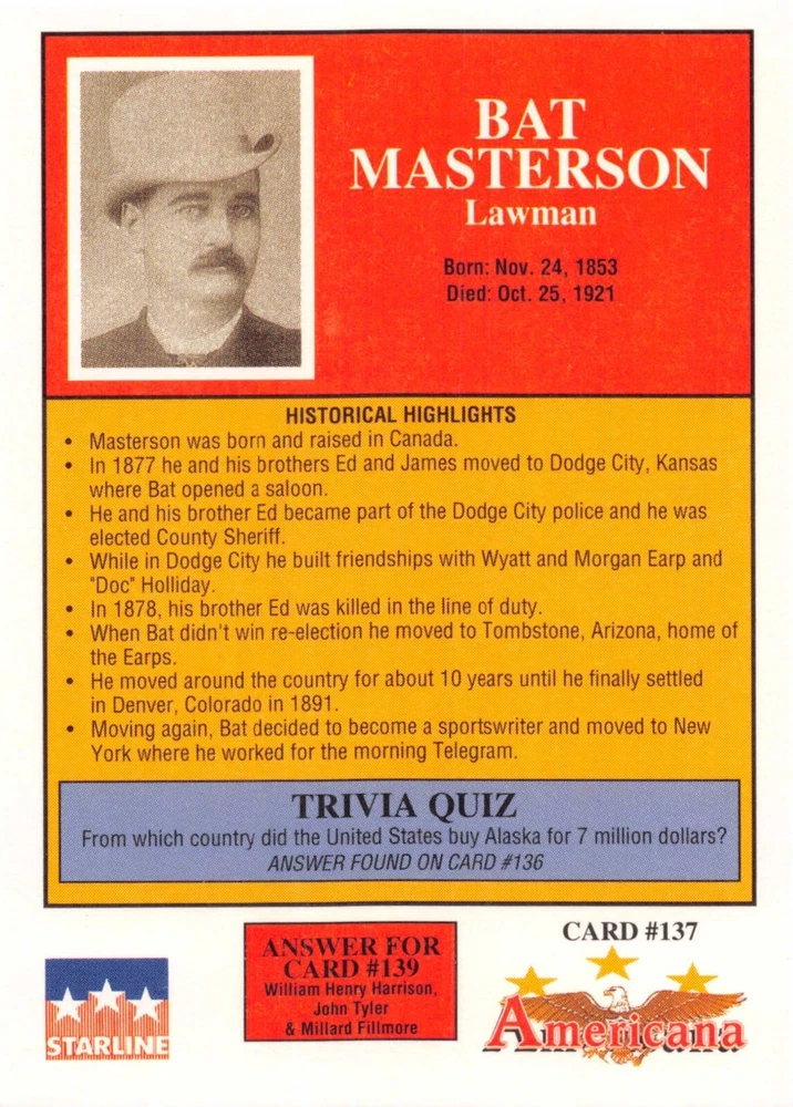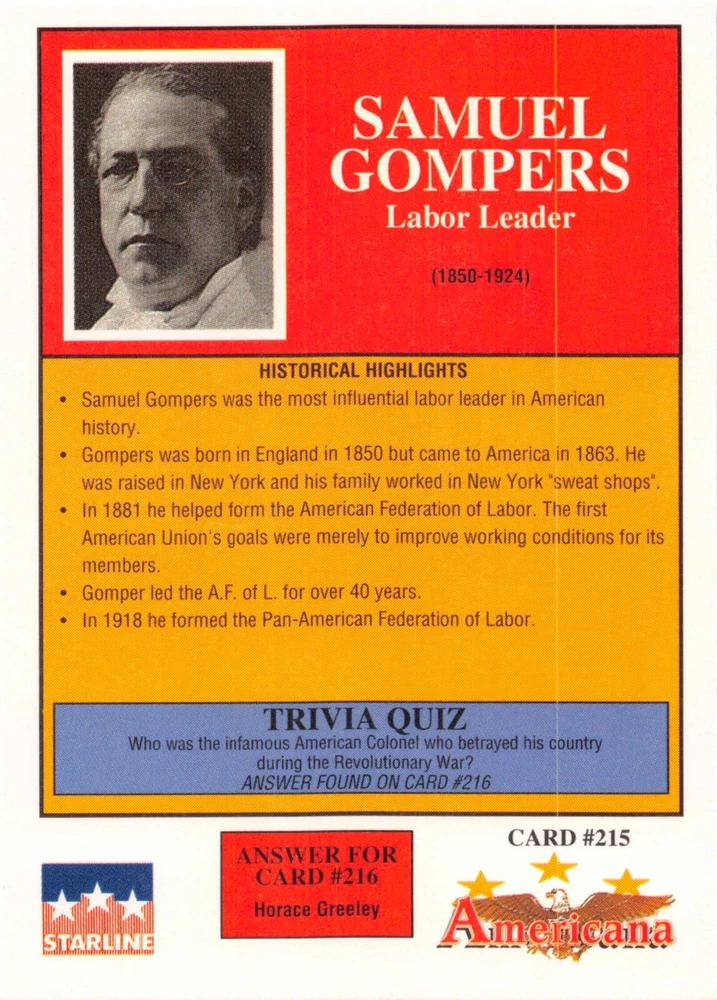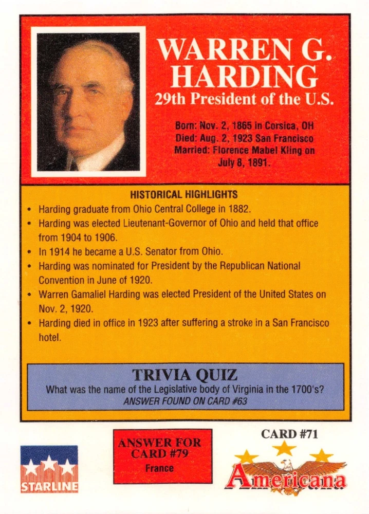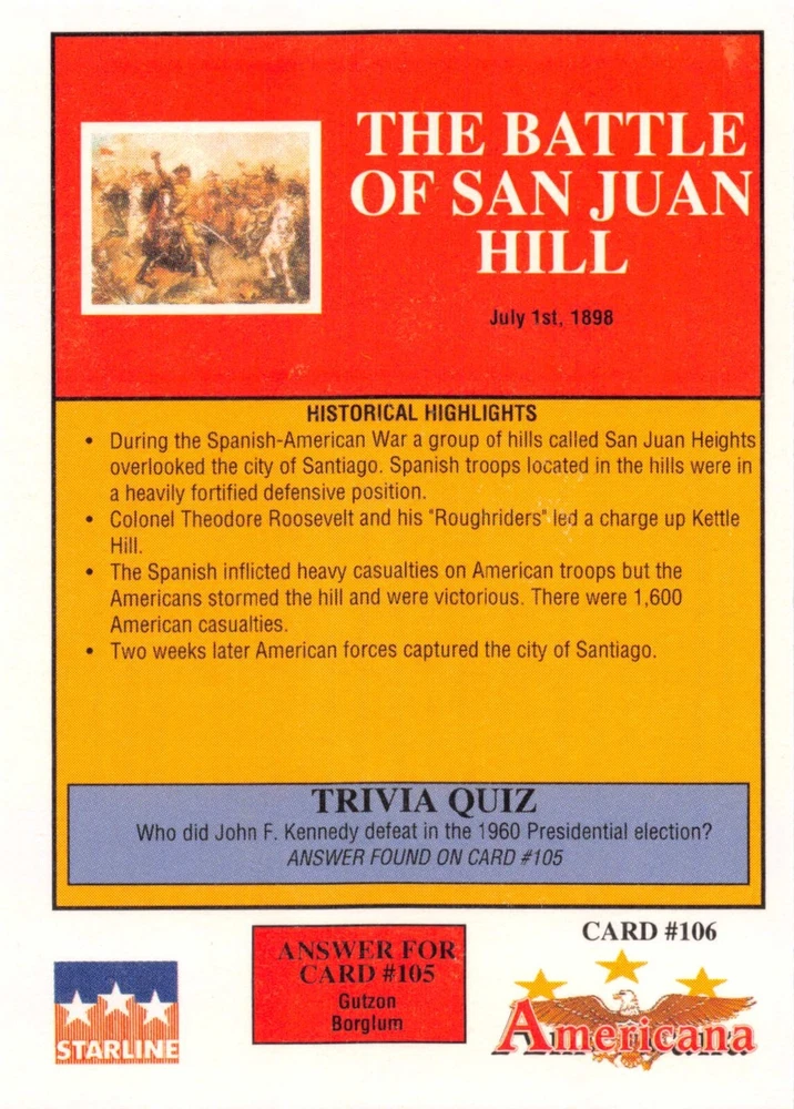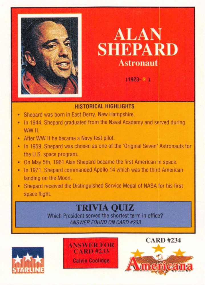 This listing is for your choice of any available 1991 Starline Americana Historic Trading Cards card from the drop-down menu above. Photos show front and backside of each card, be sure to scroll sideways to view front and backside photos! Any questions? Please ask before buying. International "USPS First Class Mail" will not include a tracking number for this item, if you would like a tracking number please choose the "eBay International Standard Shipping" option when you check out. As with all of my "pick-a-card" listings, I will be shipping with "eBay Standard Envelope". The rules of this envelope state that it cannot be too thick, so please expect your order to be packaged as follows: 1 to 6 cards will be slid into a single sleeve, the sleeve will then be slid inside of a semi-rigid Card-Saver. 7 to 12 cards will be slid into a double sleeve, 13 to 18 cards into a triple sleeve, 19 to 24 cards into a quadruple sleeve(up to six cards per sleeve). The double, triple and quadruple sleeve shipping will not have the Card-Saver. If you buy more than 1 card and want it packaged with more than 1 Card-Saver(or 1 sleeve per card), I kindly ask that you contact me before purchasing to be sure that this is possible to have it done with the stated shipping charge, or if additional shipping would be required. If you do not contact me, then you can expect to receive your order packaged as I have explained here. Please do not expect rigid top-loaders to be included, I don't normally keep a lot of them in stock, but if you message me prior to ordering I will be able to see if I have any that can be included with your order - additional shipping may be required. In order to get free combined shipping from this and any of my other "pick-a-card" listings, you must add all of your cards to the cart and check out when you are done shopping. If you do not use the cart you will be overpaying on shipping and I cannot refund you on over-payed shipping. So please use the cart and get your FREE COMBINED SHIPPING!