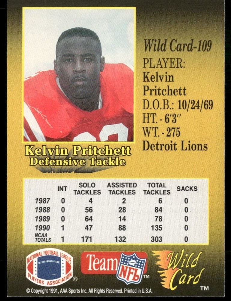 This 1991 Wild Card rookie card of Kelvin Pritchett is a must-have for Lions collectors! Crisp design, great condition, and a classic early '90s football vibe—excellent addition to any vintage NFL card collection. Solid investment for fans or serious collectors.