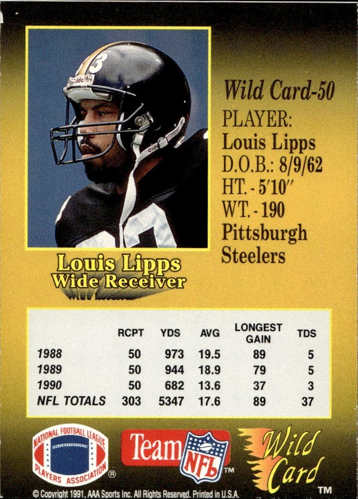 About Me Other Listings Feedback Add to Favorites Contact Me eBay Store JEm_Mint_Trading 1991 Wild Card Louis Lipps Pittsburgh Steelers #50 No stock photo / These are real scans or pictures Details Description: Louis Lipps Category: Football Year: 1991 Product: Wild Card Team: Pittsburgh Steelers Card Number: 50 Dimensions: 3¼" x 2¼" SKU: FT A0002 R03 C (12) Listing By Kronocard trading cards software v2.8.1.2