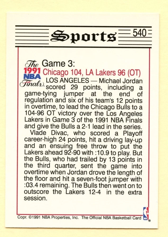 1991-92 NBA Hoops Tribune Bulls Win OT Thriller, Take 2-1 Lead basketball card #540. Card depicts Bulls players Cliff Levingston and Bill Cartwright, with Lakers Hall of Fame center Vlade Divac Free shipping via eBay ESE (eBay standard envelope). Will ship in top loader or card saver if in multiple card order.