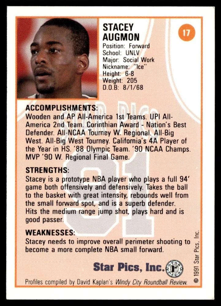 About Me Other Listings Feedback Add to Favorites Contact Me Mesplay Enterprises 1991-92 Star Pics Stacey Augmon Rookie UNLV Runnin' Rebels #17 No stock photo / These are real scans or pictures Details Description: Stacey Augmon Category: Basketball Year: 1991 Product: Star Pics Team: UNLV Runnin' Rebels Card Number: 17 Rookie: Yes Dimensions: 3½" x 2½" SKU: BK A0001 R11 S (19) Listing By Kronocard trading cards software v2.7.0.1