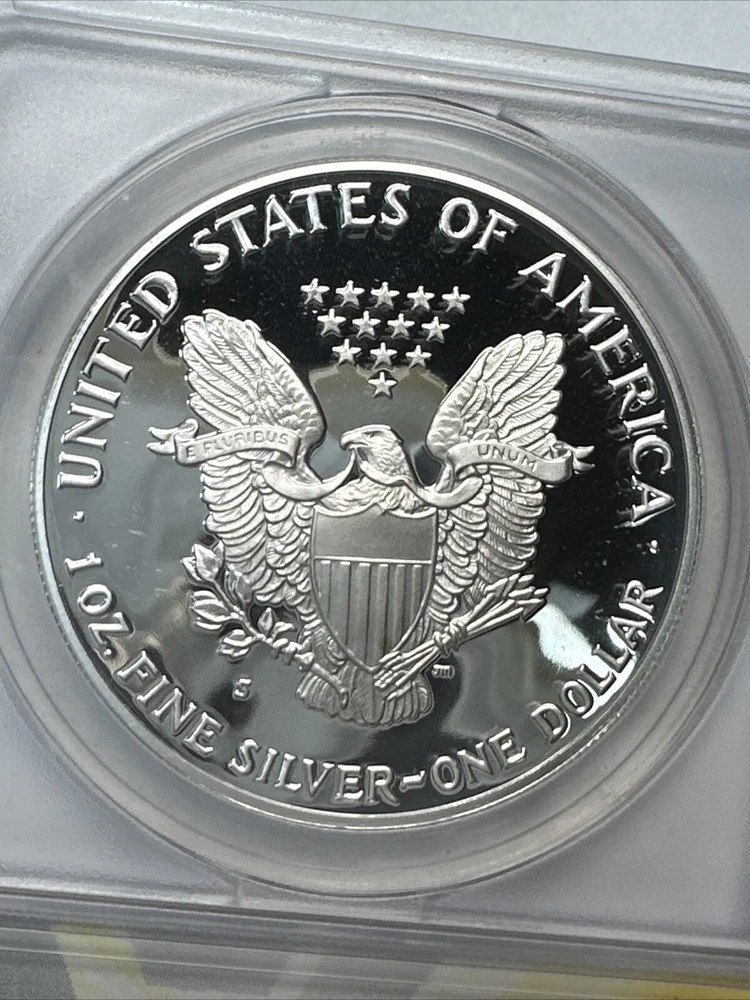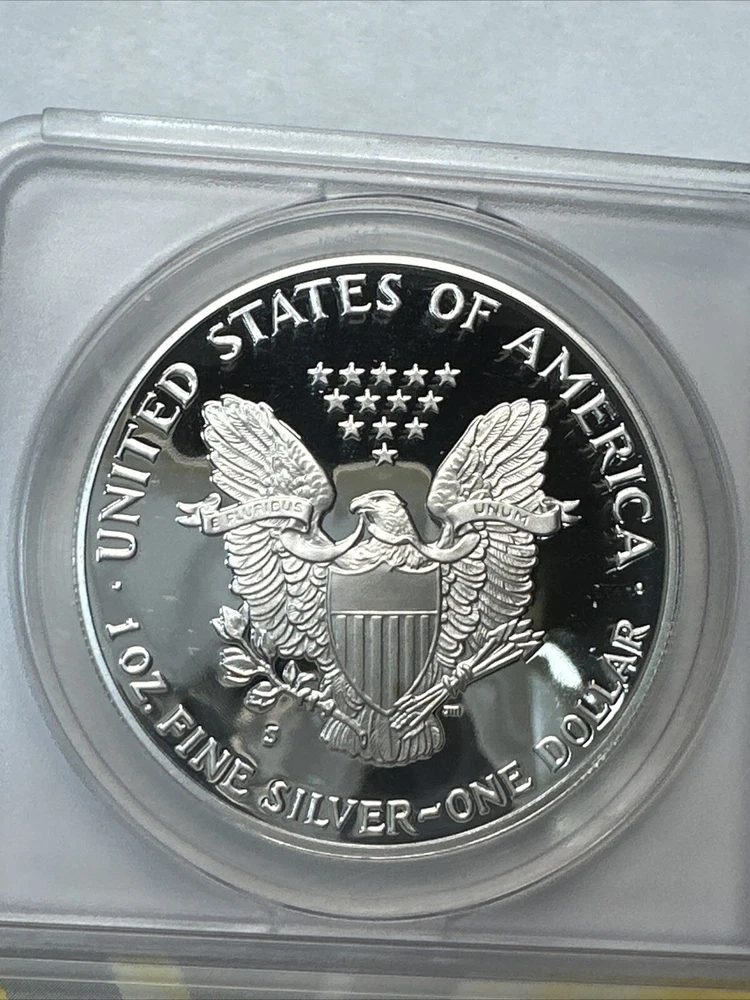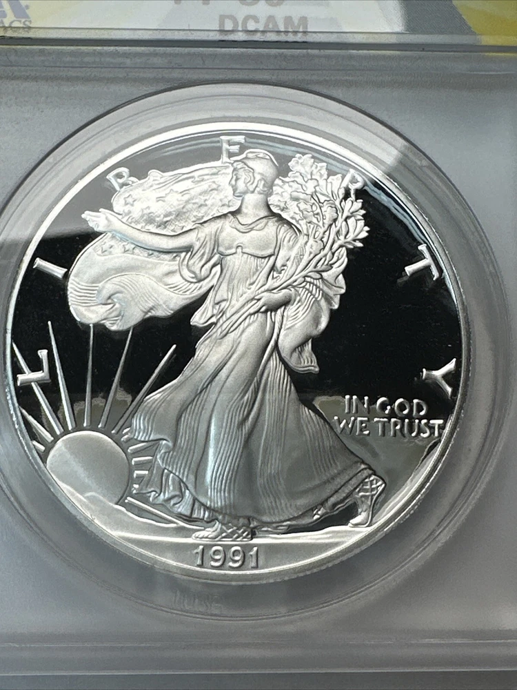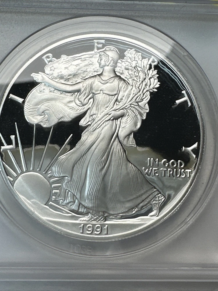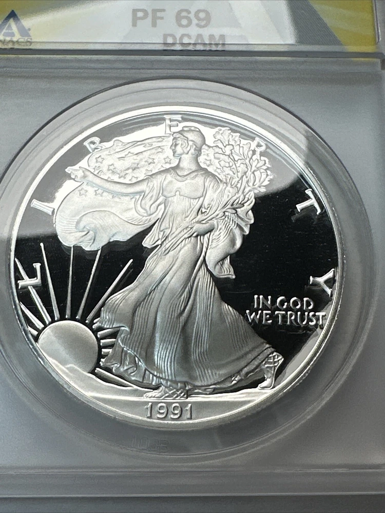 This 1991-S American Silver Eagle $1 is a highly sought-after coin with a PR 69 grade. It features a stunning strike type with a proof finish and a composition of 0.999 fine silver. The coin has been certified by ANACS with a certification number of 5423596, ensuring its authenticity and quality. This 1oz coin is a must-have for any serious collector of American coins. It features the iconic American Eagle design on the obverse and a majestic eagle landing on the moon on the reverse. This coin is a true gem and a valuable addition to any collection.