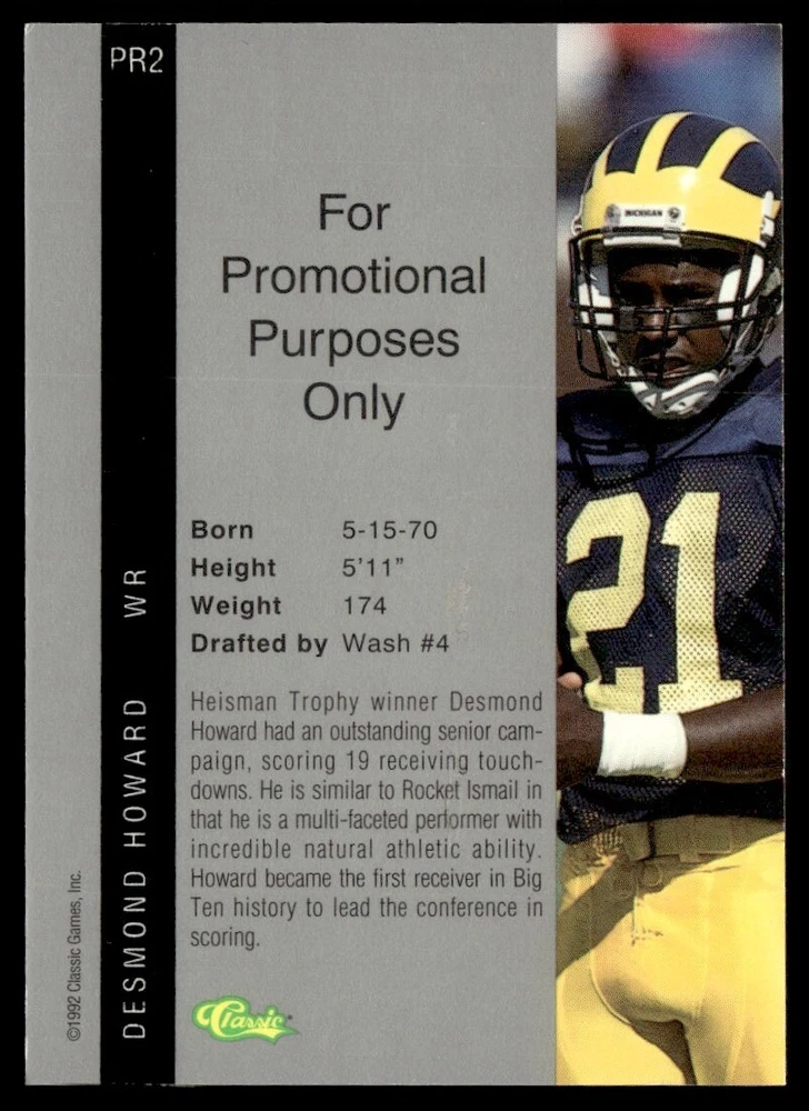 About Me Other Listings Feedback Add to Favorites Contact Me Mesplay Enterprises 1992 Classic Draft Pick Collection Promotional Card Desmond Howard Rookie No stock photo / These are real scans or pictures Details Description: Desmond Howard Category: Football Year: 1992 Product: Classic Draft Pick Collection Promotional Card Team: Michigan Wolverines Card Number: PR2 Rookie: Yes Dimensions: 3½" x 2½" SKU: FT B0001 R13 E (17) Listing By Kronocard trading cards software v2.7.0.1
