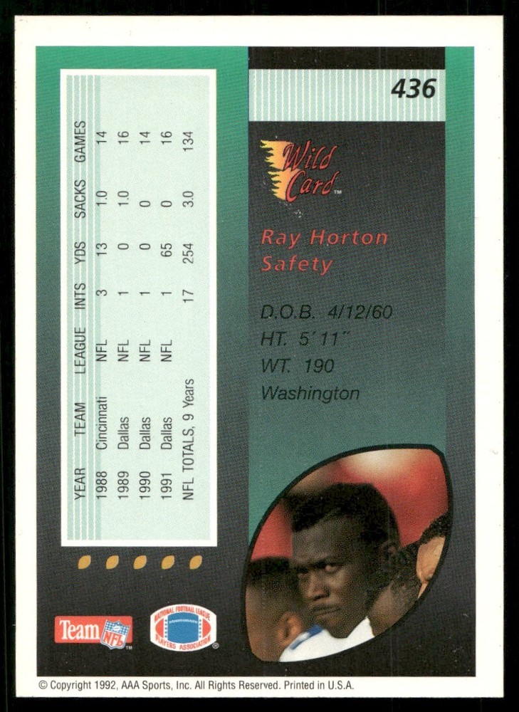 Just got this 1992 Wild Card Ray Horton Cowboys card and it’s in amazing condition! The scan shows crisp edges and sharp details—definitely a great find for any vintage football card collector. Perfect addition to my Cowboys memorabilia!