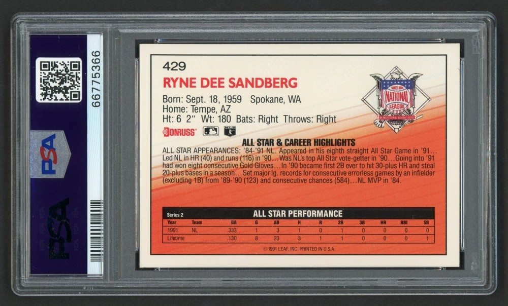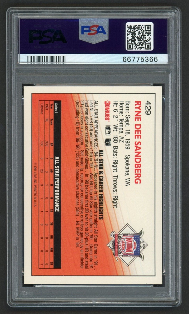 Language: English Card Size: Standard Card Number: 429 Sport: Baseball Country/Region of Manufacture: United States Original/Reprint: Original Theme: Sport League: Major League (MLB) Era: Modern (1981-Now) Set: 1992 Donruss Autographed: No Professional Grader: Professional Sports Authenticator (PSA) Product: Single Team: Chicago Cubs Player/Athlete: Ryne Sandberg Certification Number: 66775366 Season: 1991 Manufacturer: Donruss Year Manufactured: 1992 Original/Licensed Reprint: Original Grade: 10 Type: Sports Trading Card