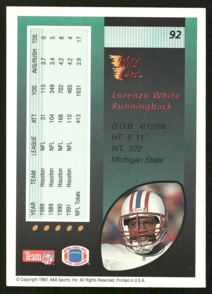 This is a fantastic vintage football card! Lorenzo White in his Houston Oilers uniform looks sharp on this 1992 Wild Card. The actual scan shows great condition—perfect for any collector. Love the classic design and team nostalgia. A must-have for Oilers fans or anyone building a ‘90s football set!