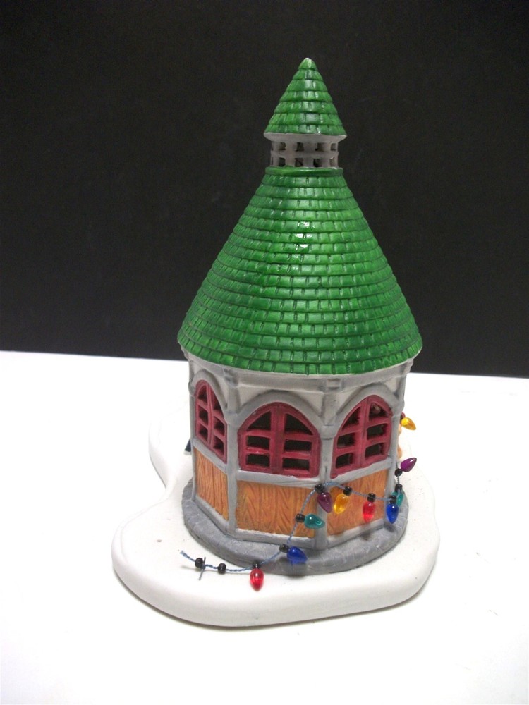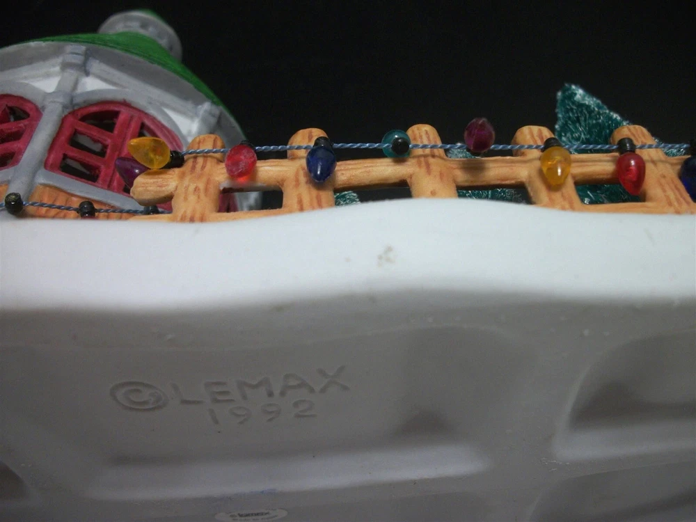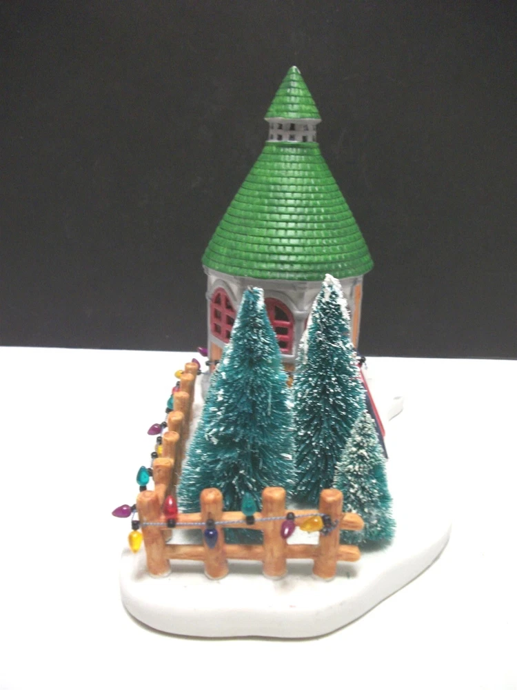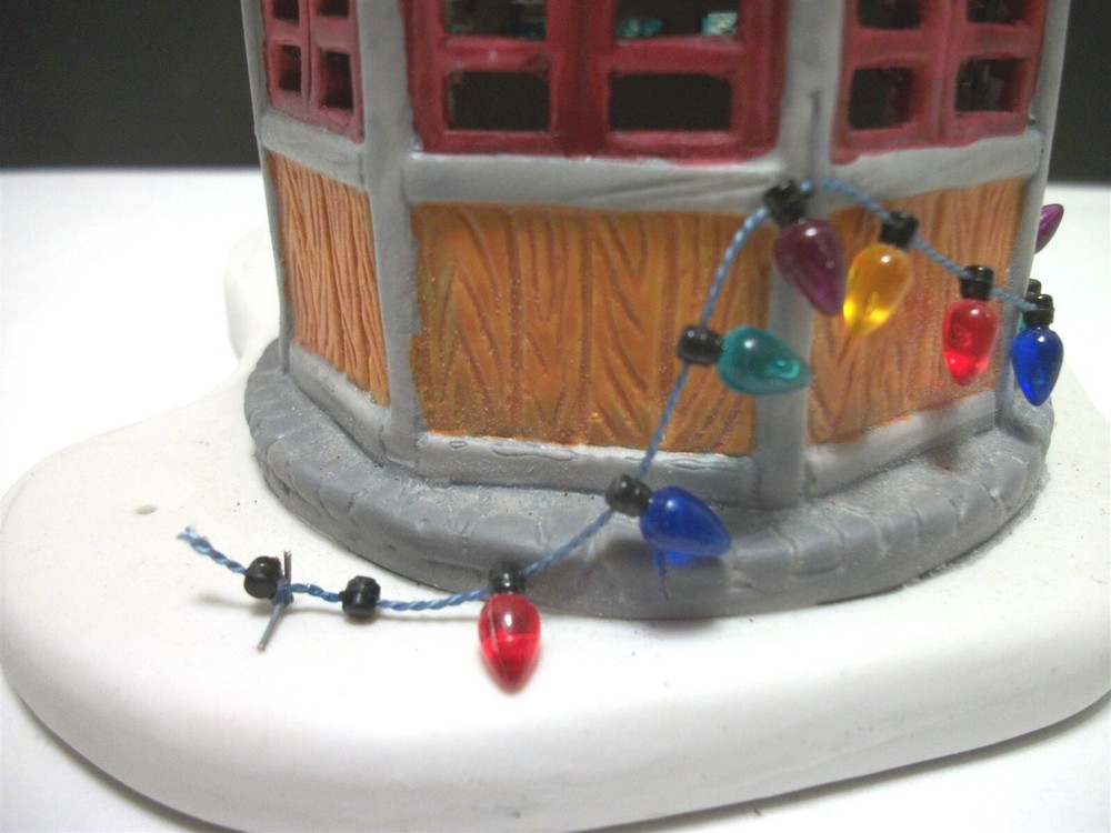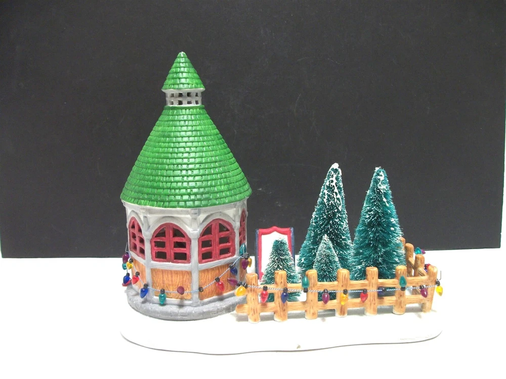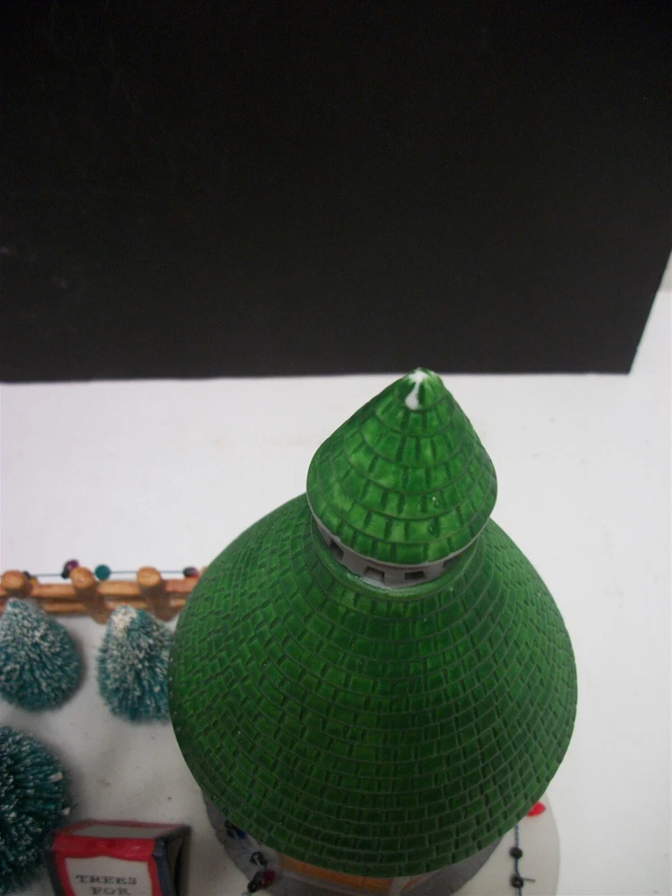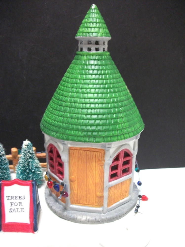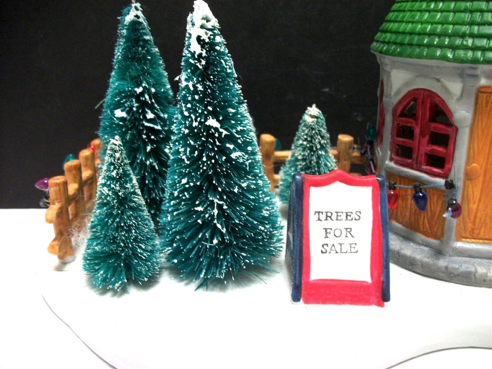 Great addition for a Christmas Village..........there HAVE to be Christmas trees for sale, right? Cute display of a round sales booth with "live" Christmas trees on the lot..... Ceramic with the wire brush trees, complete with a sign. About 9 1/2 inches long and stands 7 1/2 inches high. Miniature lights go around the booth and the fence. (Does NOT light up). Condition: Very good, the string of lights has come loose at the end of the booth.....and the very tip of the booth shows white......apparently the green paint missed that spot. It is NOT a chip. No chips or cracks at all. No Box. Please see pictures. Powered by SixBit's eCommerce Solution