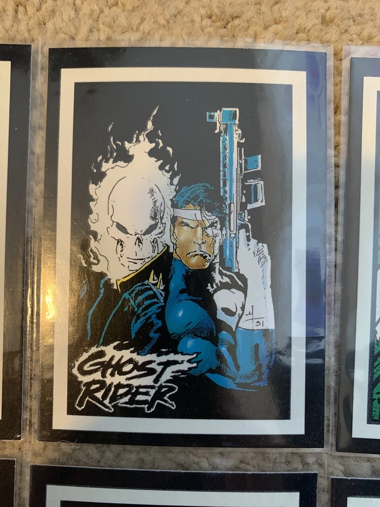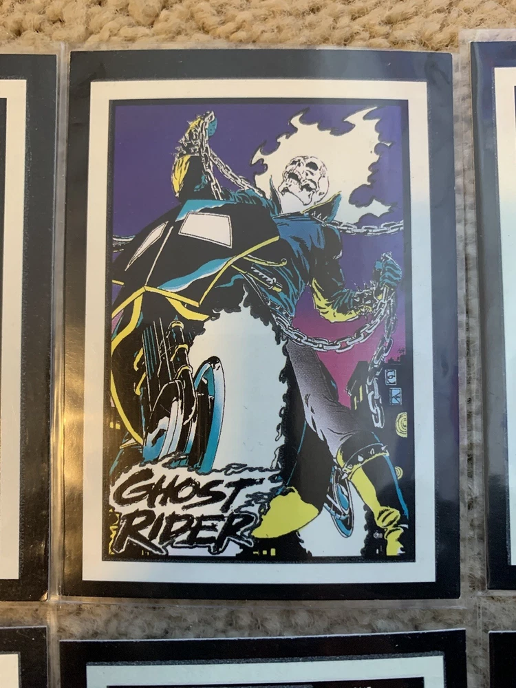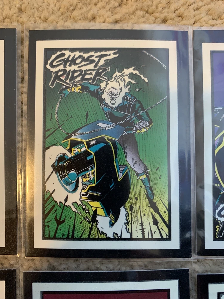 This is a 1992 Marvel Ghost Rider COMPLETE GLOW IN THE DARK INSERT CARD SET, #G1-G10 by Comic Images! Set Includes: G1 - Illuminating G2 - Vigilantes G3 - My Arsenal G4 - Power Source G5 - Wolverine G6 - The Flames G7 - Punisher G8 - Hot Air G9 - Cable G10 - Grin and Bear It Condition: All cards are Near Mint/Mint. Will ship bubble wrapped for maximum protection to ensure they arrive undamaged and in perfect condition. Please ask with any questions.