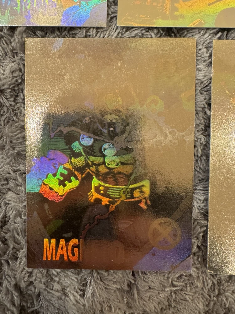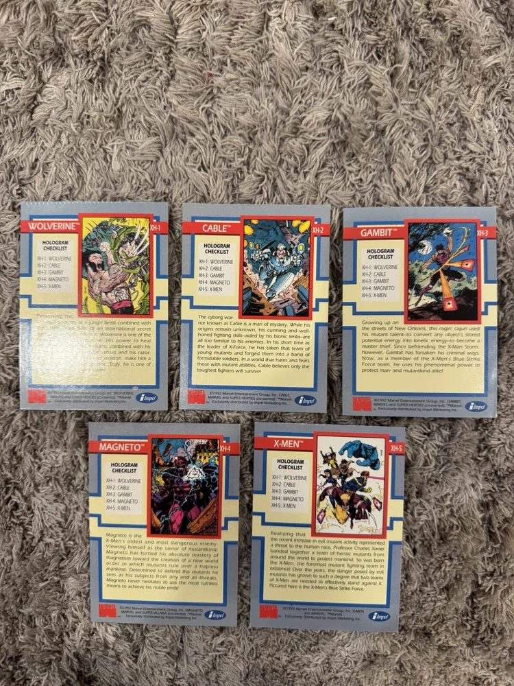 This is a 1992 Marvel Uncanny X-Men Series 1 COMPLETE HOLOGRAM INSERT CARD SET, #XH1-XH5 by Impel! Set Includes: XH1 - Wolverine XH2 - Cable XH3 - Gambit XH4 - Magneto XH5 - X-Men Condition: All cards are in Excellent condition. There are minor imperfections on all the cards but there are absolutely no dents or creases whatsoever. These are not near mint. See pictures for greater detail. Will ship bubble wrapped for maximum protection to ensure they arrive undamaged and in perfect condition. Please ask with any questions.