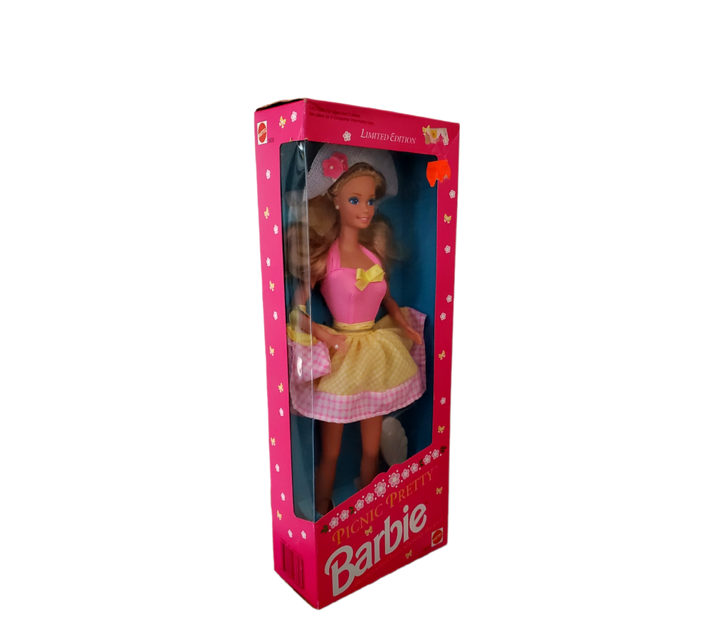 This is a limited edition Picnic Pretty Barbie Doll from Mattel, made in 1992 . She stands at 11 inches tall and comes in her original packaging. This doll is a must-have for any Barbie collector or enthusiast, with her beautiful blonde curly hair and stunning blue eyes. The set includes the doll and is part of the Barbie product line. It is an original piece, not a reproduction, and was manufactured in Malaysia. This doll is perfect for a picnic-themed occasion, as it embodies the essence of outdoor fun and beauty. Add this vintage Barbie doll to your collection today!