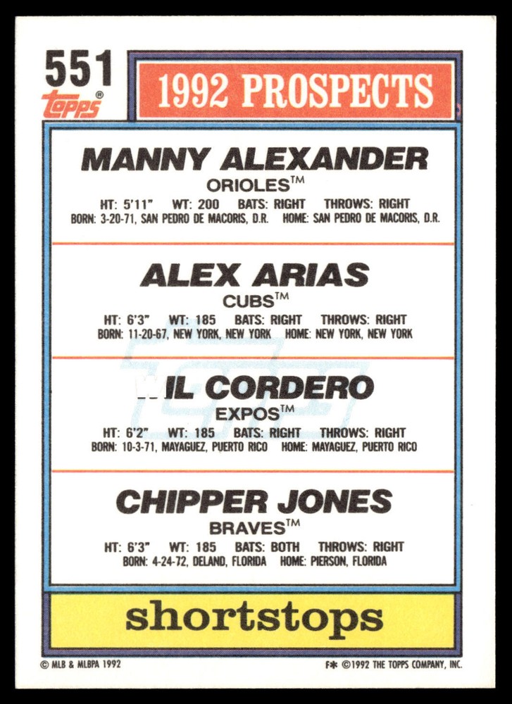 The Card pictured is the card you will receive unless there are multiple quantities then you will receive a card in the comparable grade. Cards in poor condition could have creasing, stains, rounded corners, pen marks or a combo of them. please see pics for a better understanding of cards condition. Excellent Manny Alexander / Alex Arias / Wil Cordero / Chipper Jones RC #551 1992 Topps Topps 1992 Baseball .
