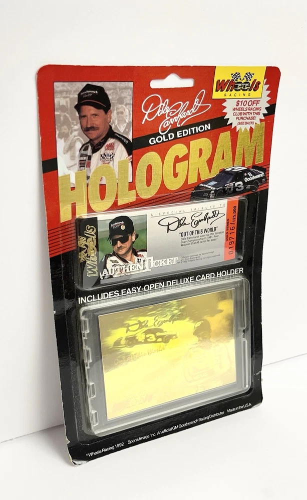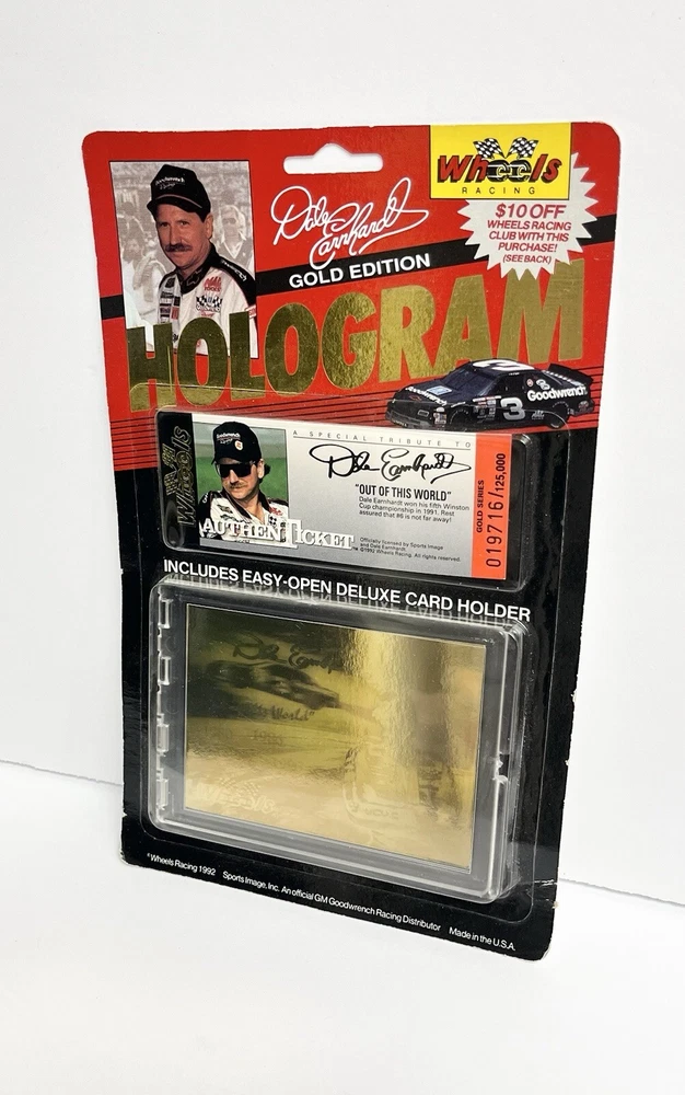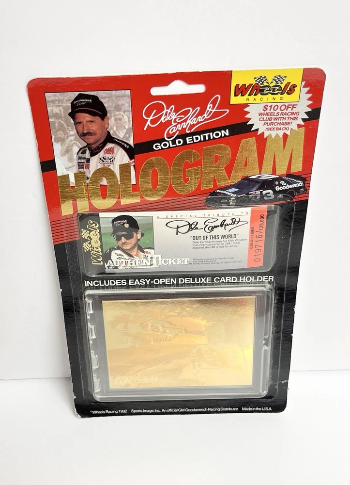 1992 Wheels Racing Gold Edition Hologram Dale Earnhardt card is brand new and in excellent shape and condition. Still inside its original unopened sealed packaging. The packaging does have some slight shelf wear from being over 30 years old. This is an authentic genuine Wheels Racing product and is sure to bring you some excitement and joy. This Hologram card comes with an easy to open deluxe card holder and a special tribute to Dale Earnhardt Authentic Ticket from his 5th Winston Cup win. This collectors card is perfect for fans of NASCAR or fans of Dale Earnhardt and would make an amazing addition to your ports card collection. So please hurry and make this one your very own!!!! Please look at all photos well to decide yourself of condition. All our collectibles and figures are in great shape as we only put our best looking collectibles and figures up for sell. Thank you so much!!!!! Making our customers happy and having their online shopping a great experience is very important to us. This is why we take great pride in our shipping. As soon as we get the purchase notification we will pack your item safely and securely wrapped in bubble wrap inside a corrugated box or a weatherproof bubble mailer with care. Thank you for shopping here at HowBoutDatToyStore where we have a wide range of classic toys, also new toys and trends of today. And you also get a little extra something in your package with every order. HowBoutDat!!!!!!! Plus come visit us online at HowBoutDatToyStore.com