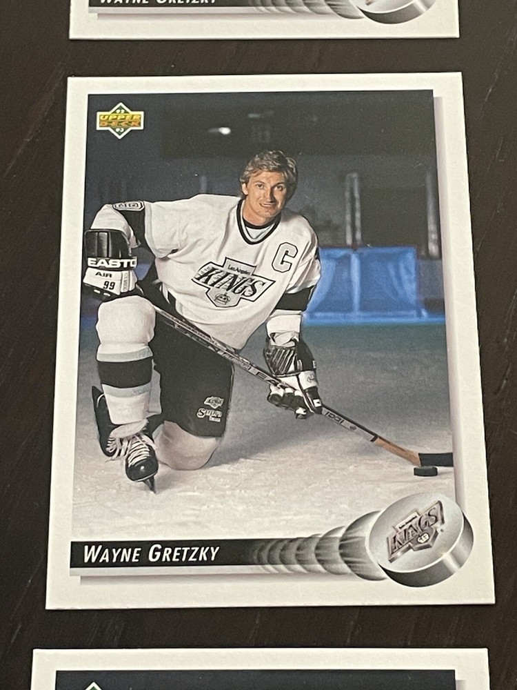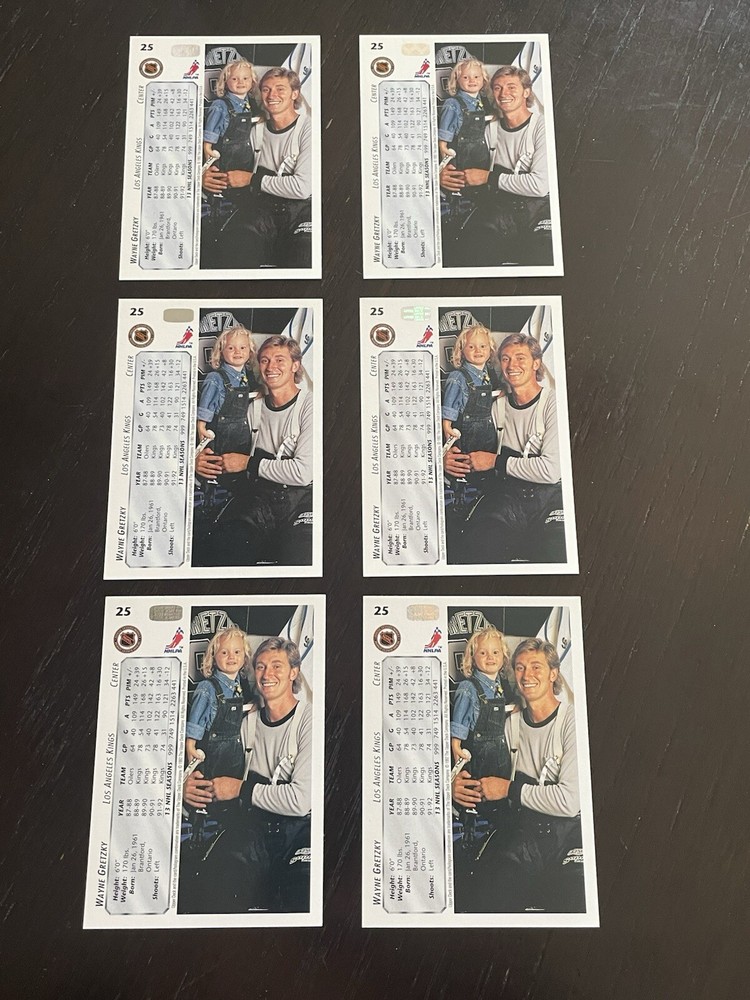 Lot of 6 1992-93 Upper Deck #25 Wayne Gretzky Los Angeles Kings trading card. This sports trading card features the legendary player Wayne Gretzky during his time with the Los Angeles Kings in the National Hockey League (NHL). Manufactured by Upper Deck, this collectible item is a must-have for any ice hockey fan or trading card enthusiast. Perfect for adding to your sports memorabilia collection or for displaying proudly as a piece of hockey history.